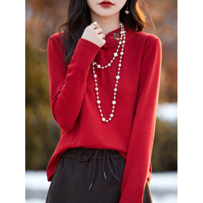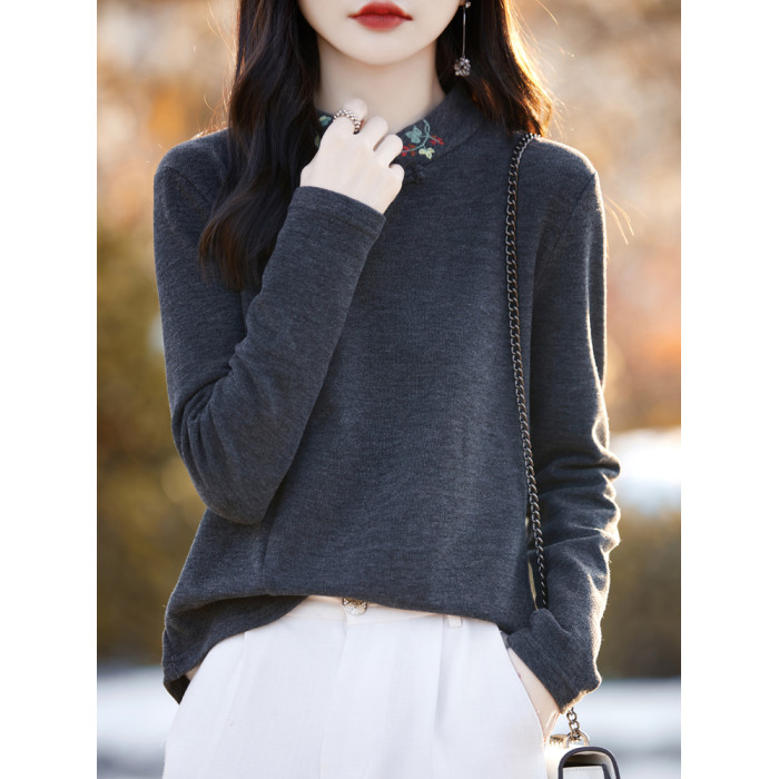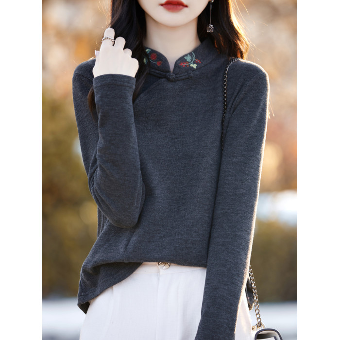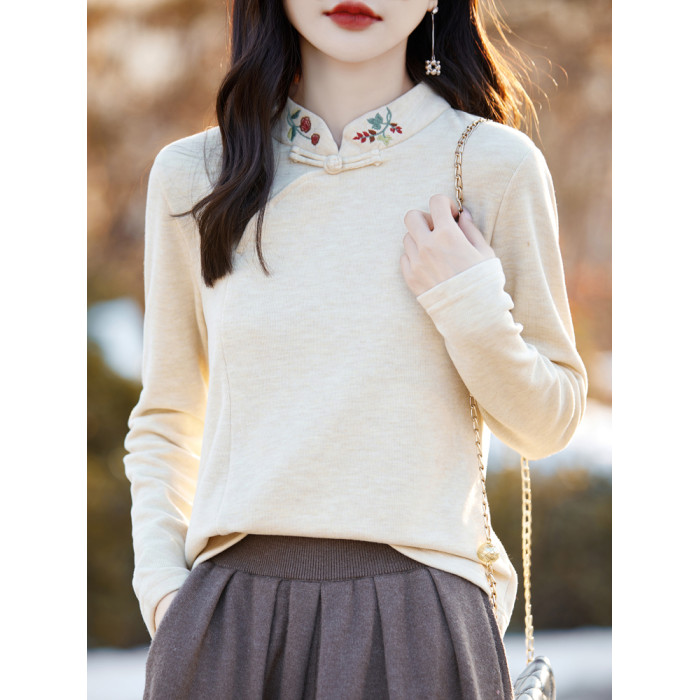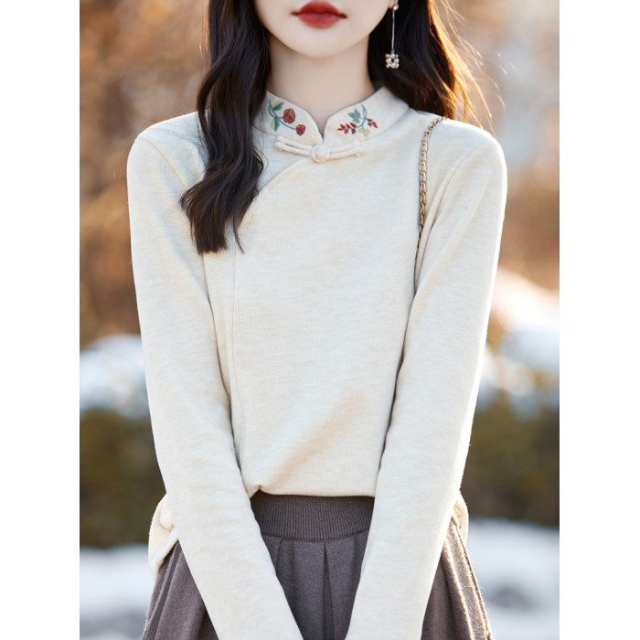 2024新款刺綉德絨新中式打底衫女春秋款內搭國風毛衣外穿長袖上衣