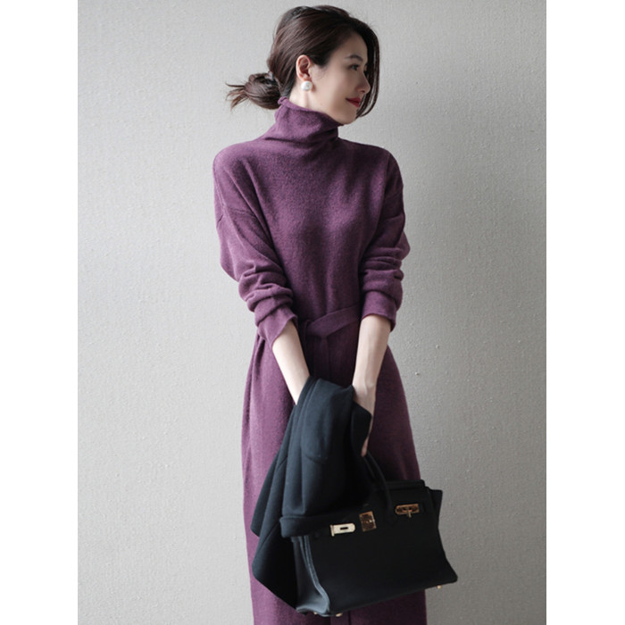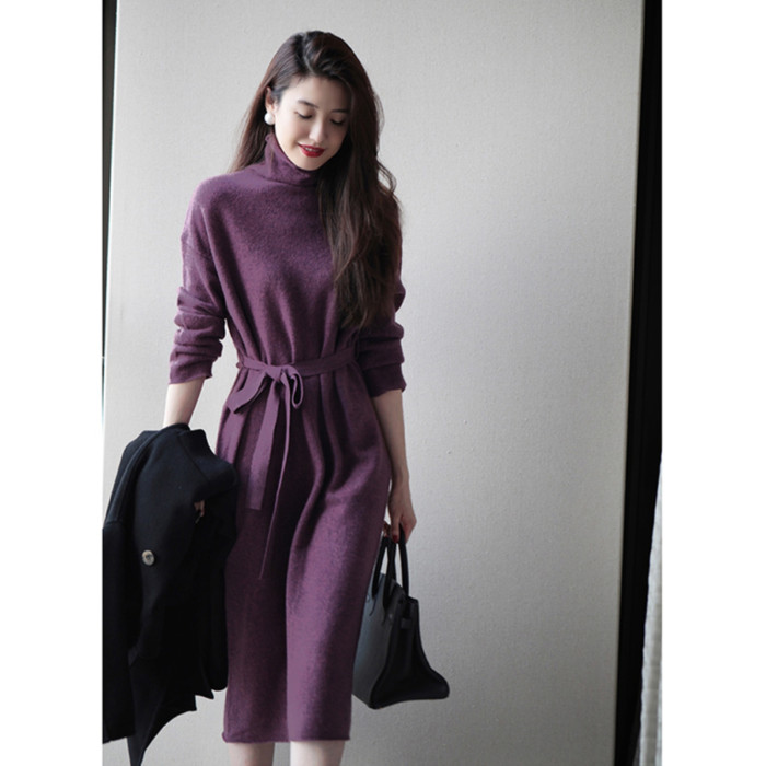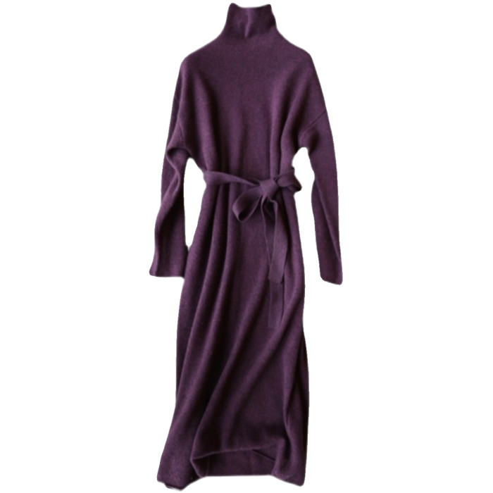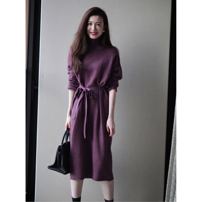 秋冬羊絨衫女高領毛衣中長款連衣裙套頭純色寬松羊毛針織打底衫