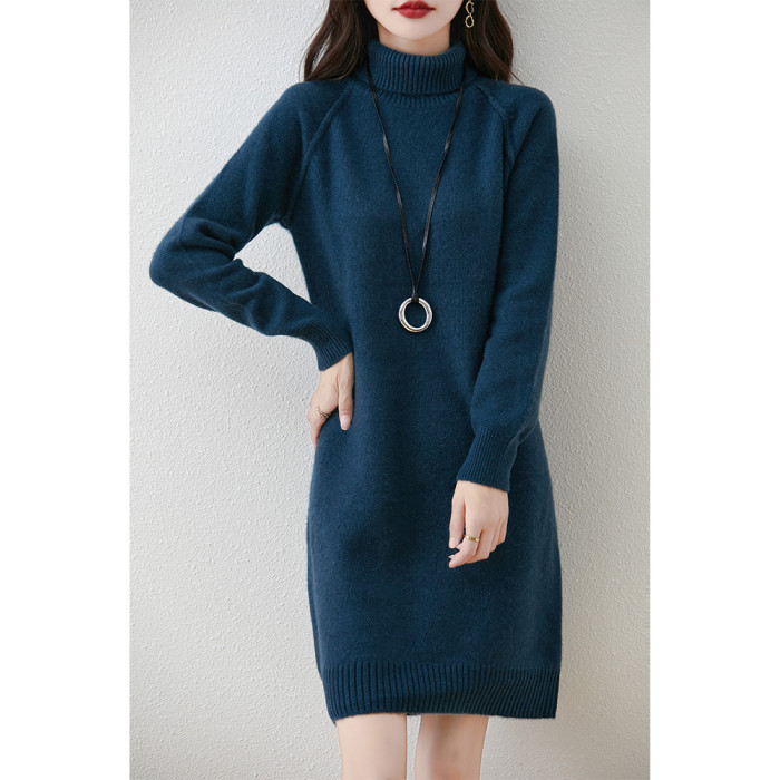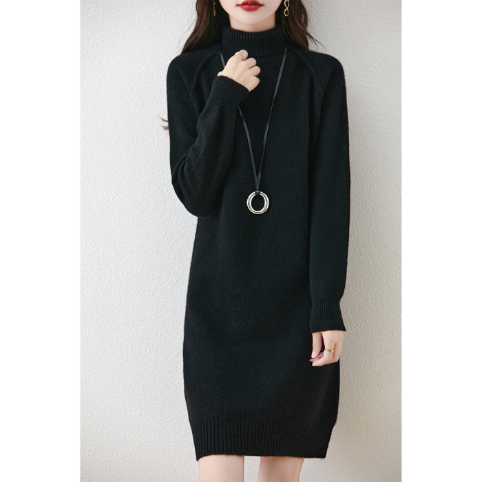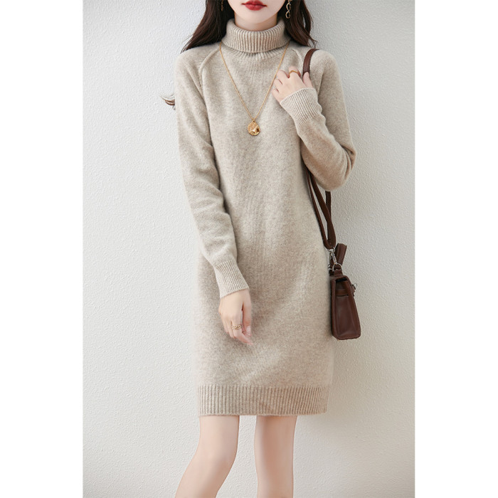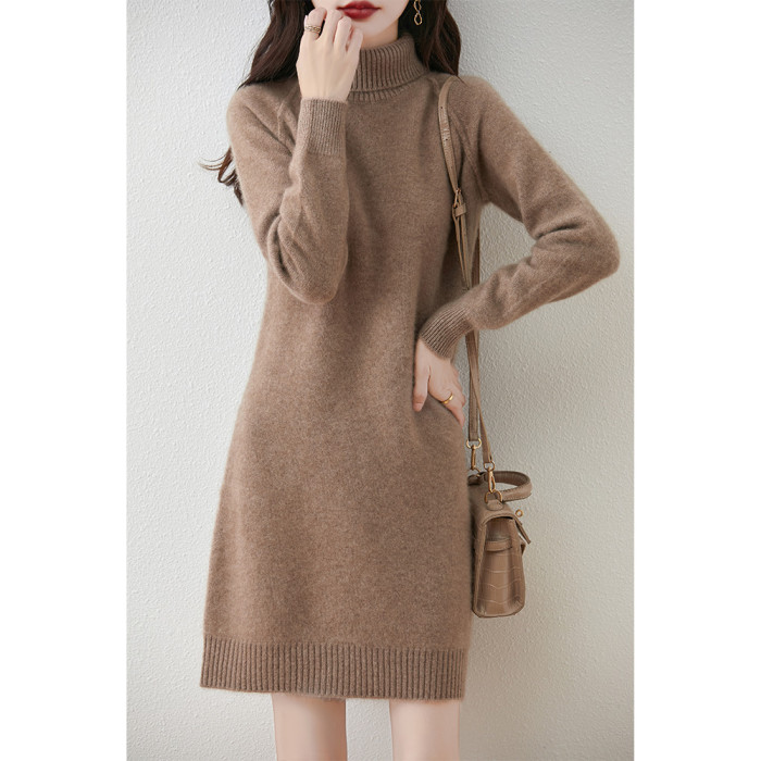 100%羊毛衫女秋冬韓版高領針織連衣裙中長款加厚毛衣女寬松打底衫