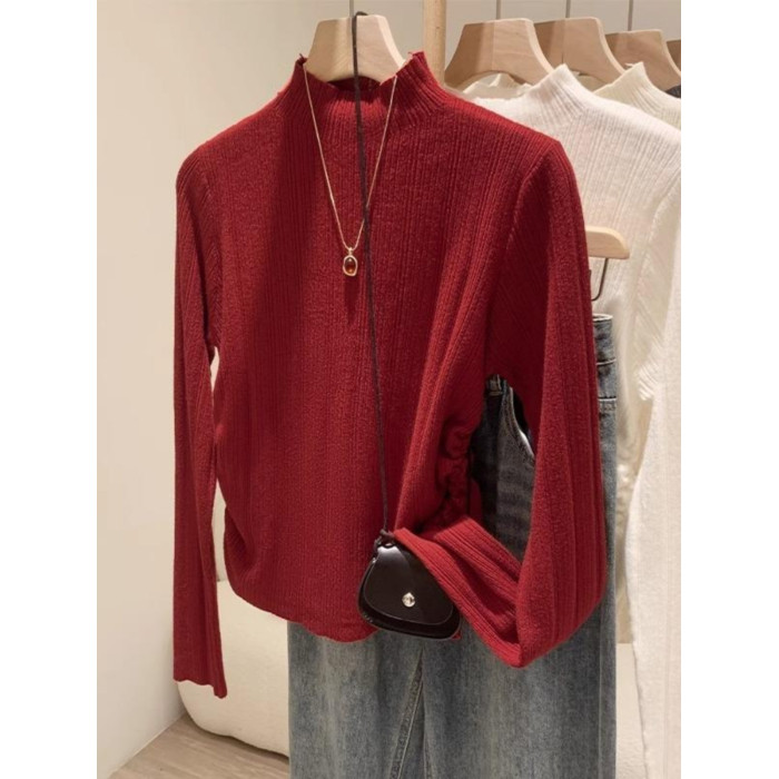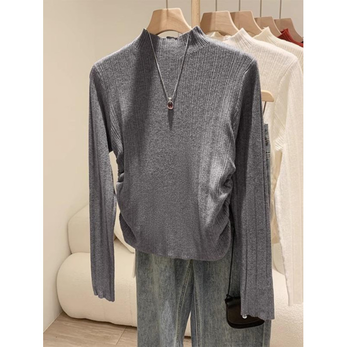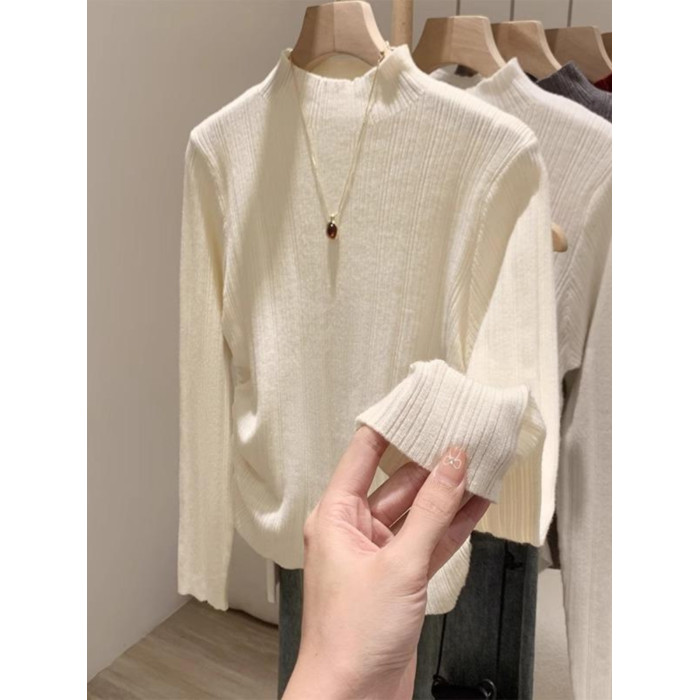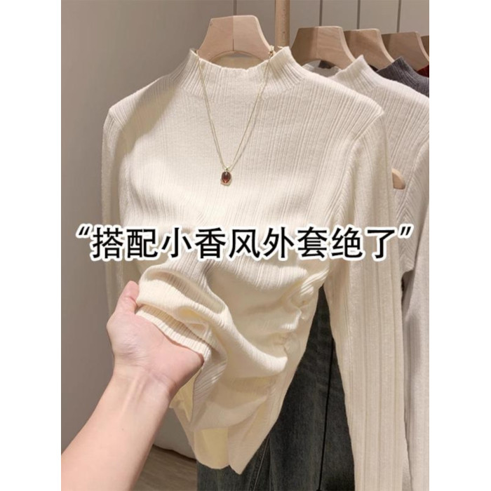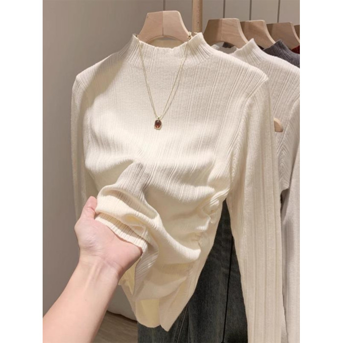 杏色半高領針織衫女秋冬2025新款彈力褶皺修身打底衫內搭軟糯上衣