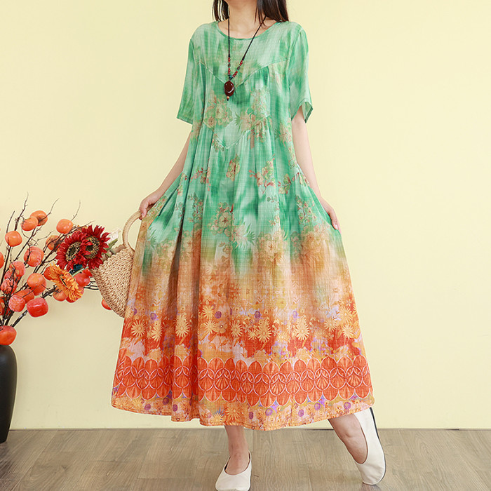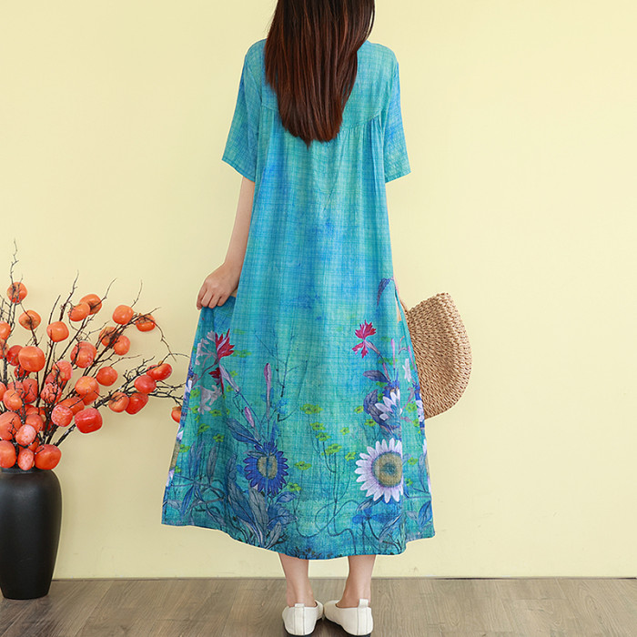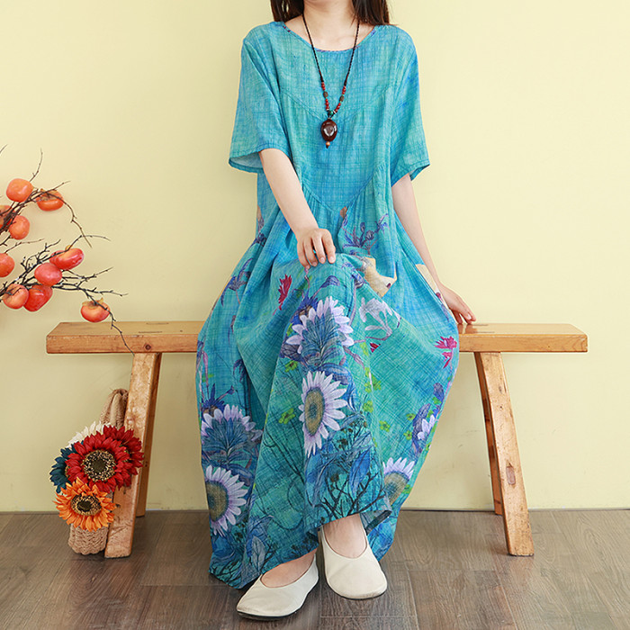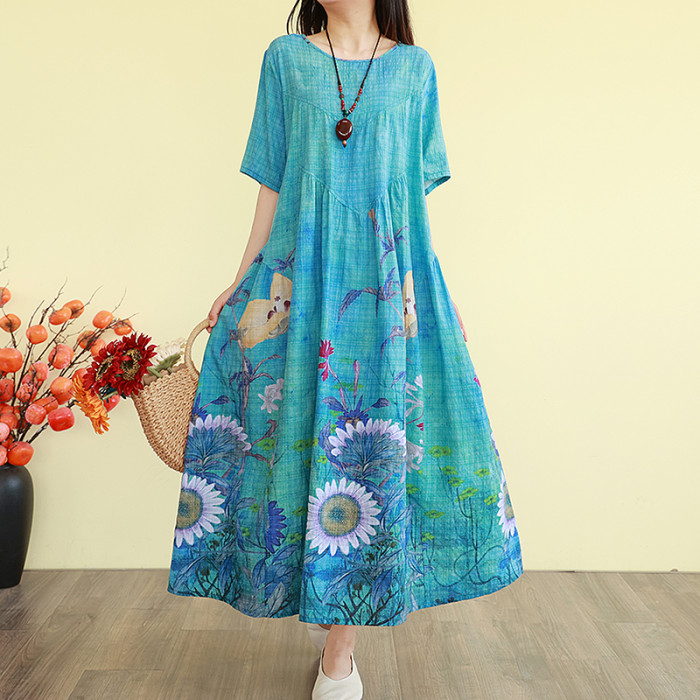 復古文藝棉麻連衣裙女炒色印花寬松長裙子夏季短袖長款大擺打底裙