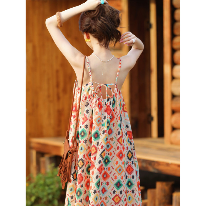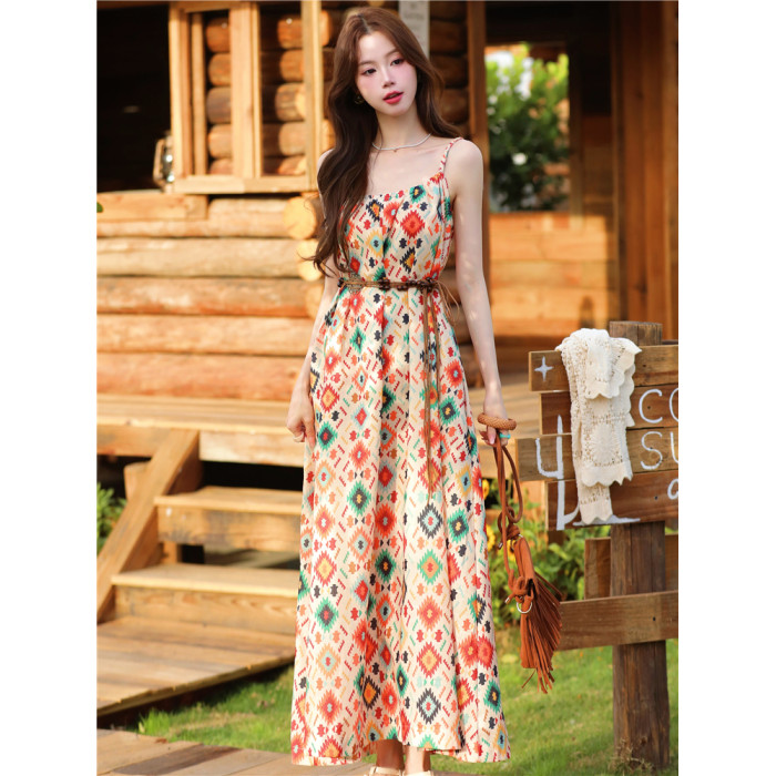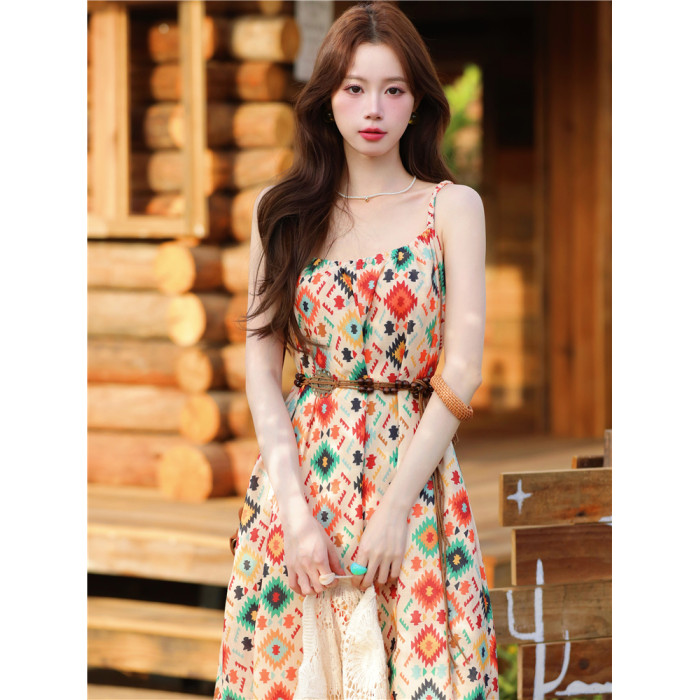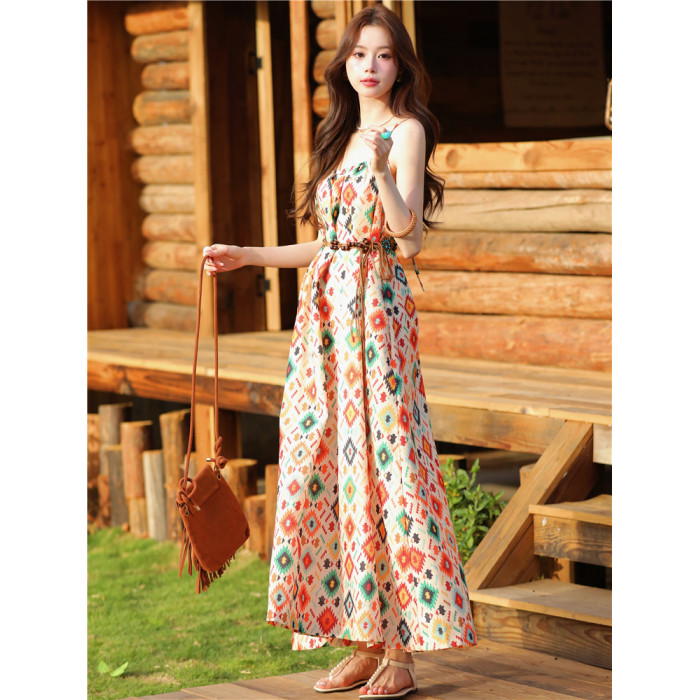 雲南旅遊穿搭女裝波西米亞民族風印花吊帶連衣裙配鏤空開衫兩件套
