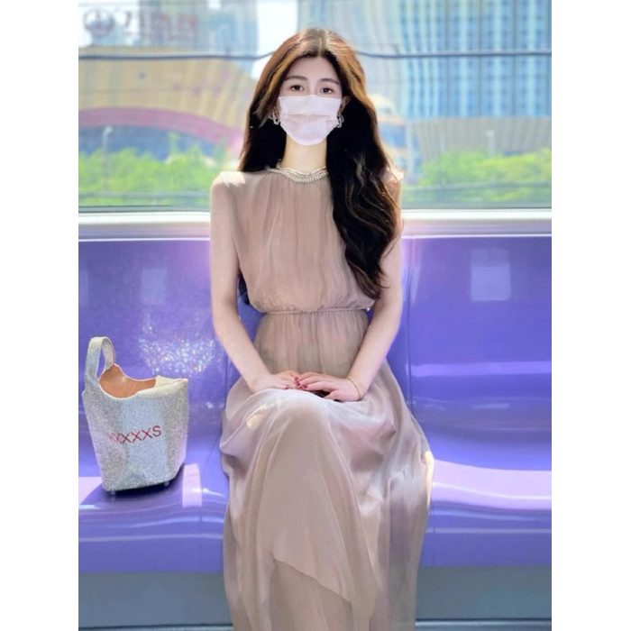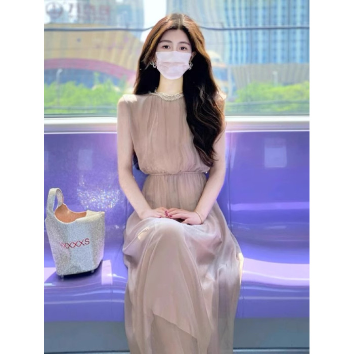 歐洲站2025夏季新款法式高級感絕美長裙無袖背心連衣裙小衆設計感