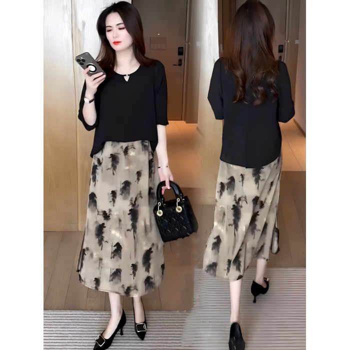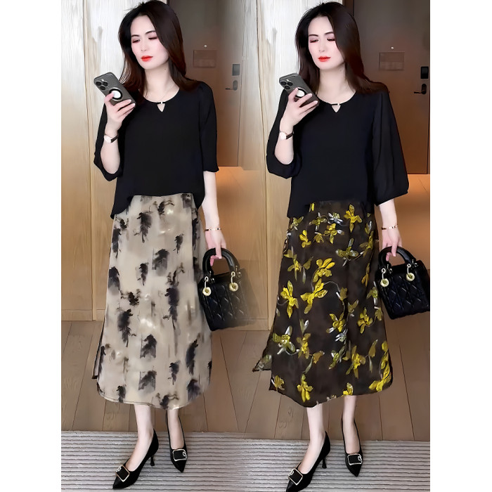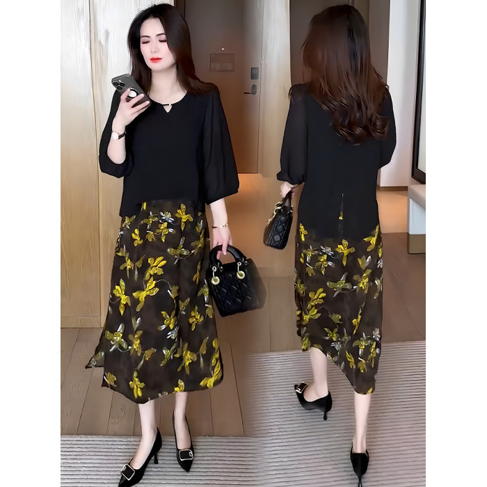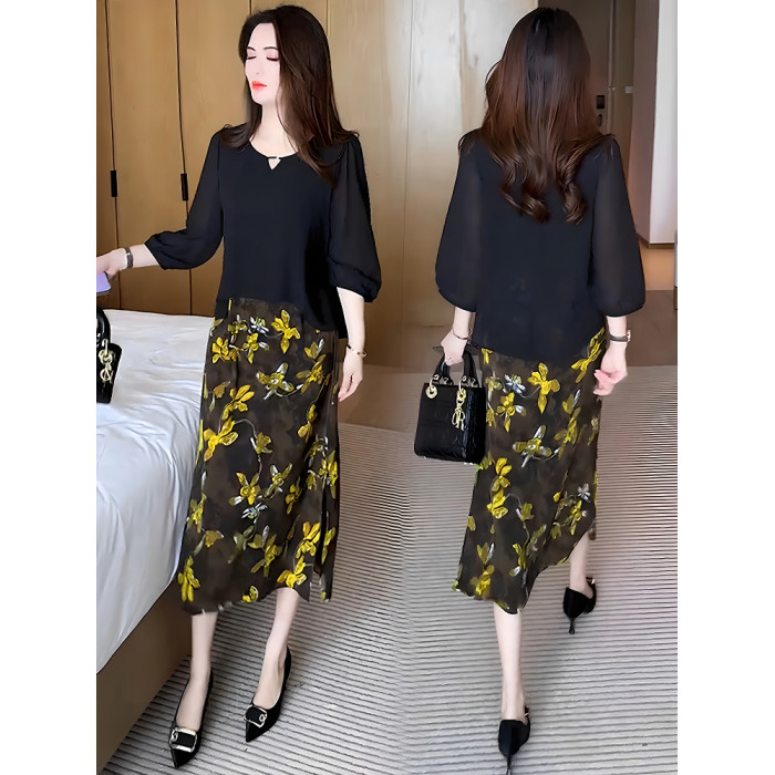 專櫃高定假兩件連衣裙女夏季新款洋氣雪紡碎花裙遮肚子開叉中長裙