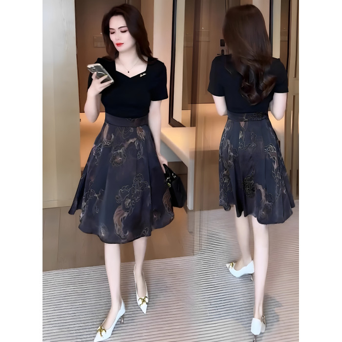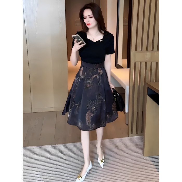 專櫃高定短袖連衣裙女2025新款夏季今年流行時尚減齡印花拼接裙子