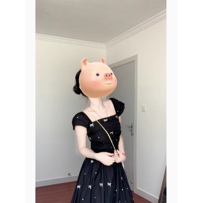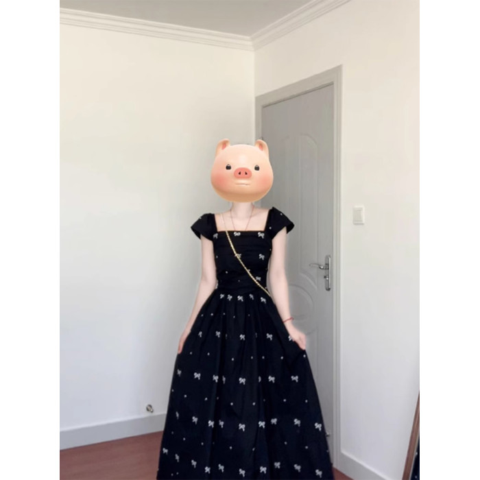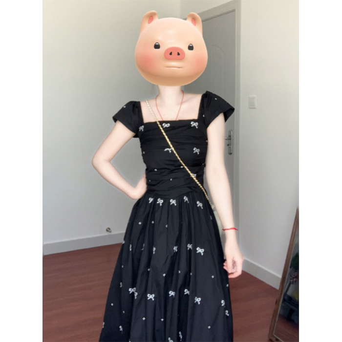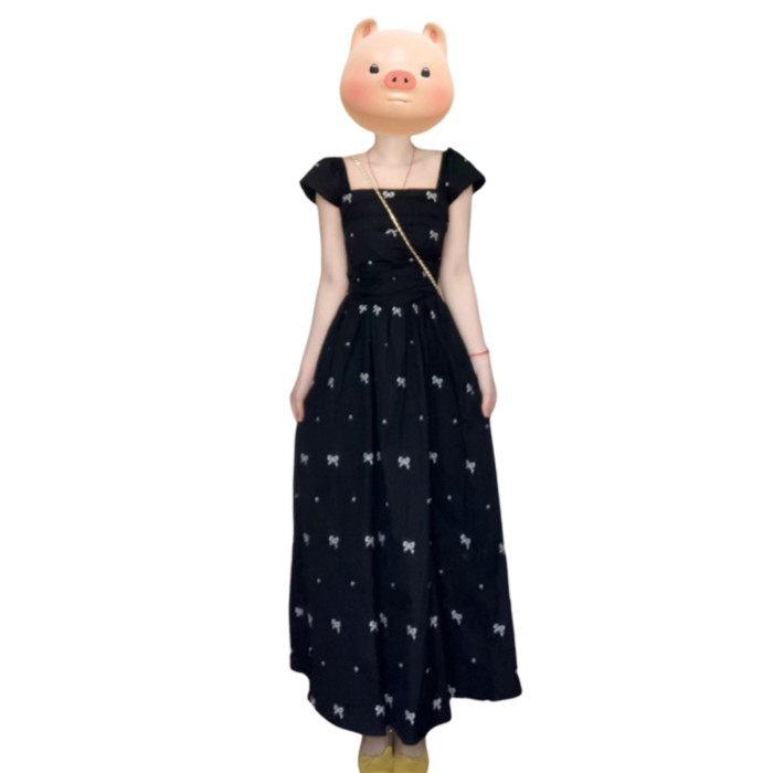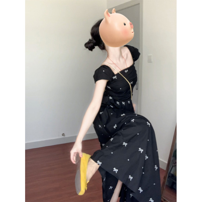 2025年夏季復古氣質設計感收腰顯瘦黑色方領蝴蝶結碎花連衣裙長裙