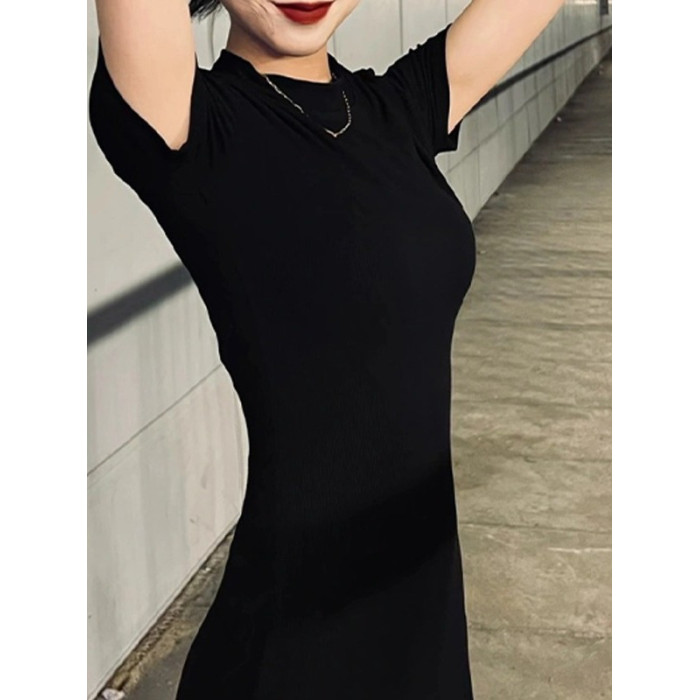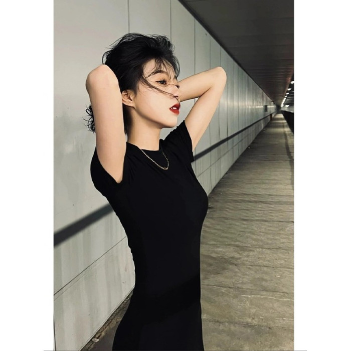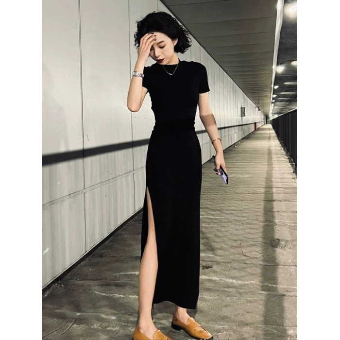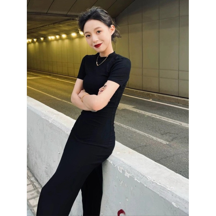 MUAMY夏季新款法式復古赫本小黑裙高級感小衆開叉修身顯瘦連衣裙