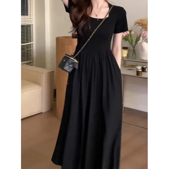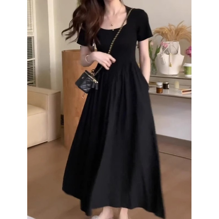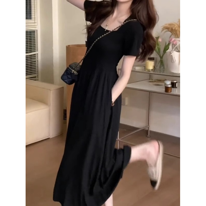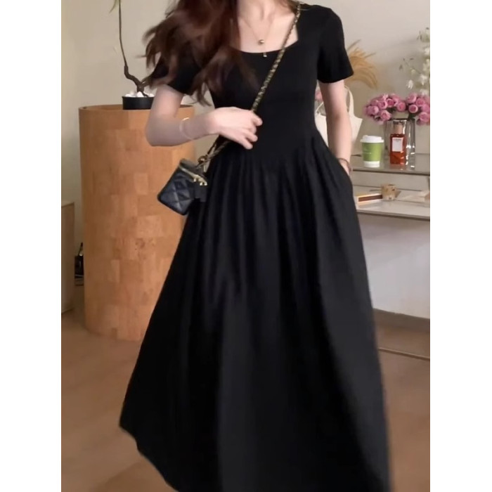 法式赫本風高腰連衣裙女夏季大碼胖mm遮肉顯瘦時尚設計感小黑裙子