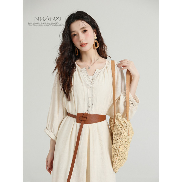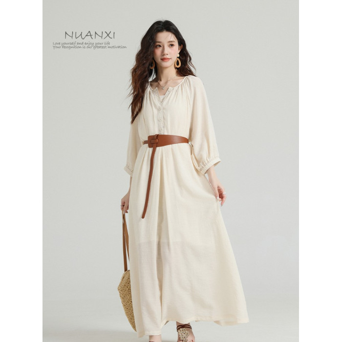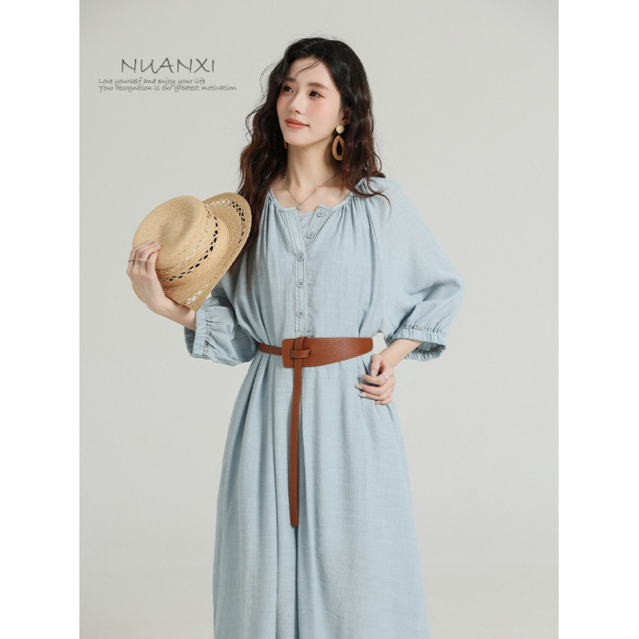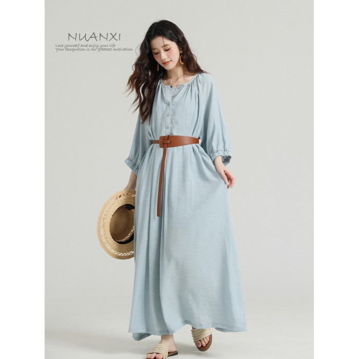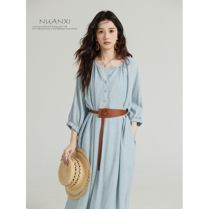 暖兮NUANXI法式藍色V領連衣裙女2025夏季新款旅遊氣質穿搭長裙子