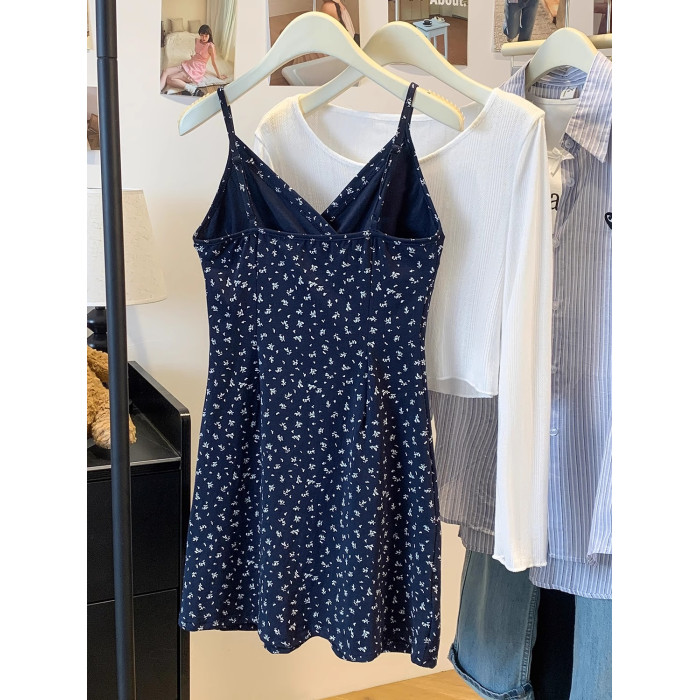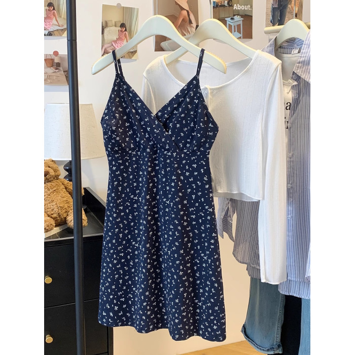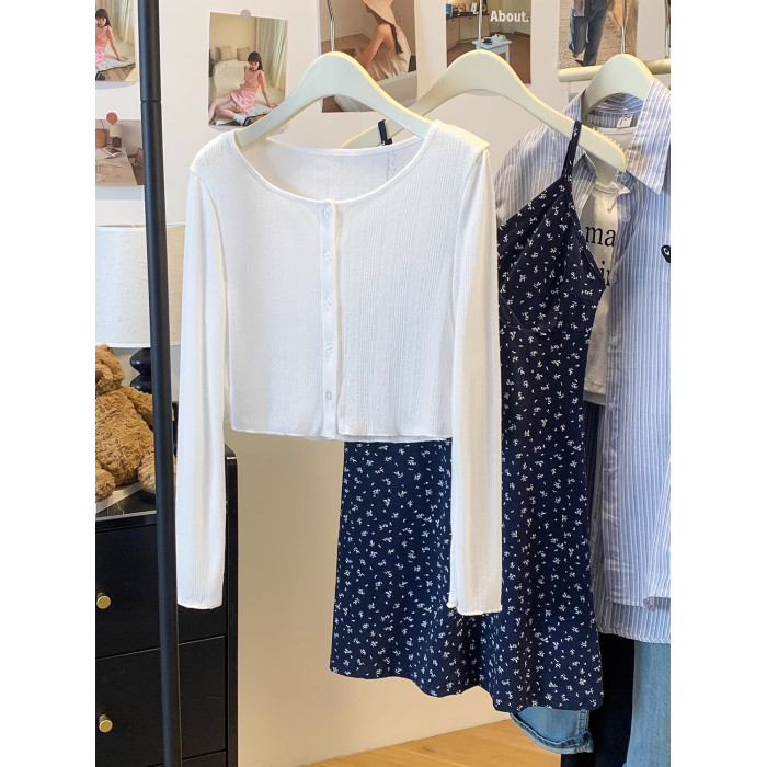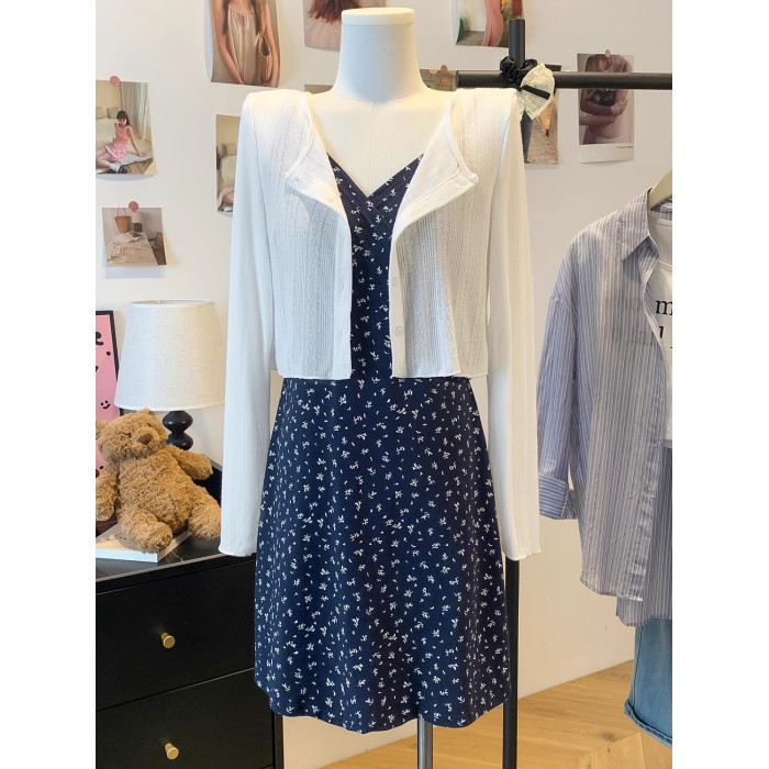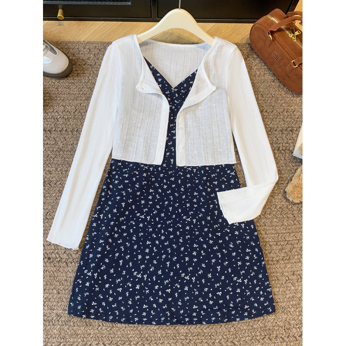 溫柔風碎花連衣裙套裝女夏季白色防曬開衫內搭收腰吊帶短裙兩件套