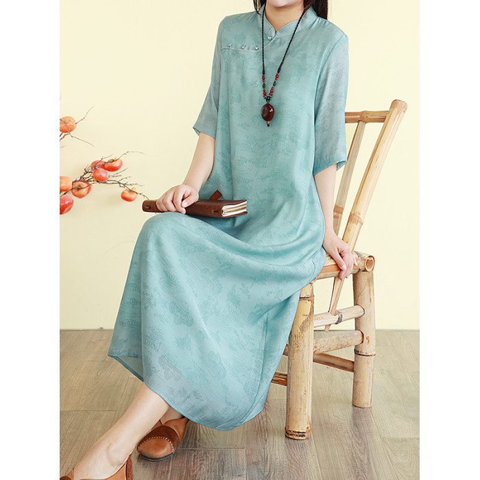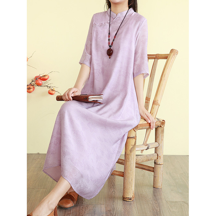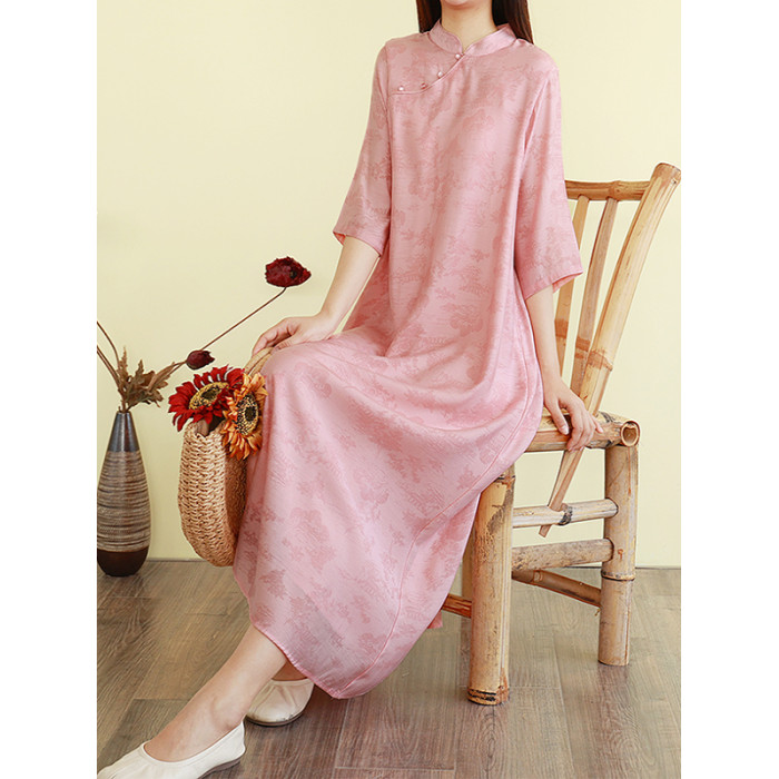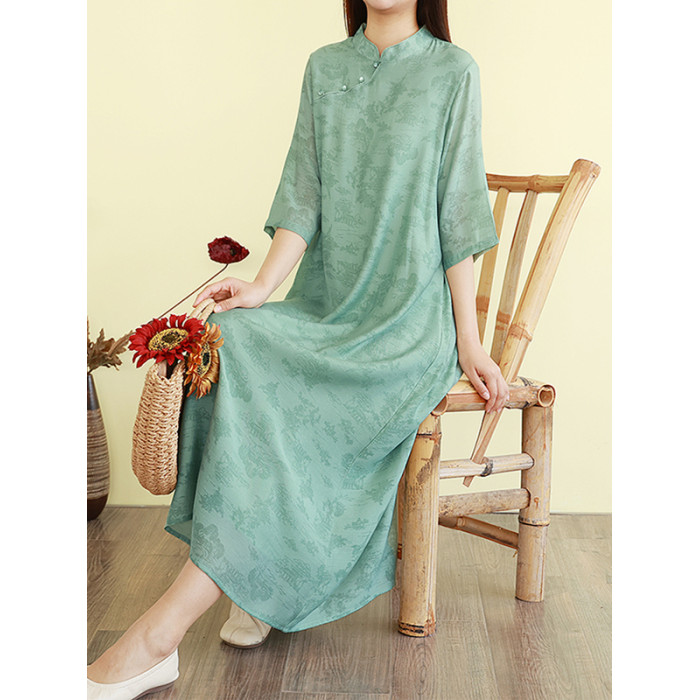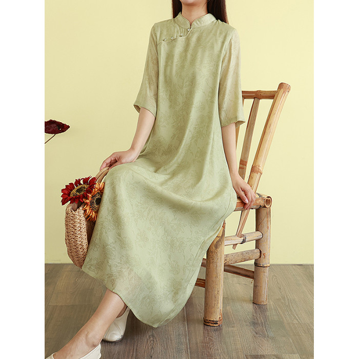 復古新中式天絲麻連衣裙女夏季長款提花旗袍長裙子寬松民國風裙子