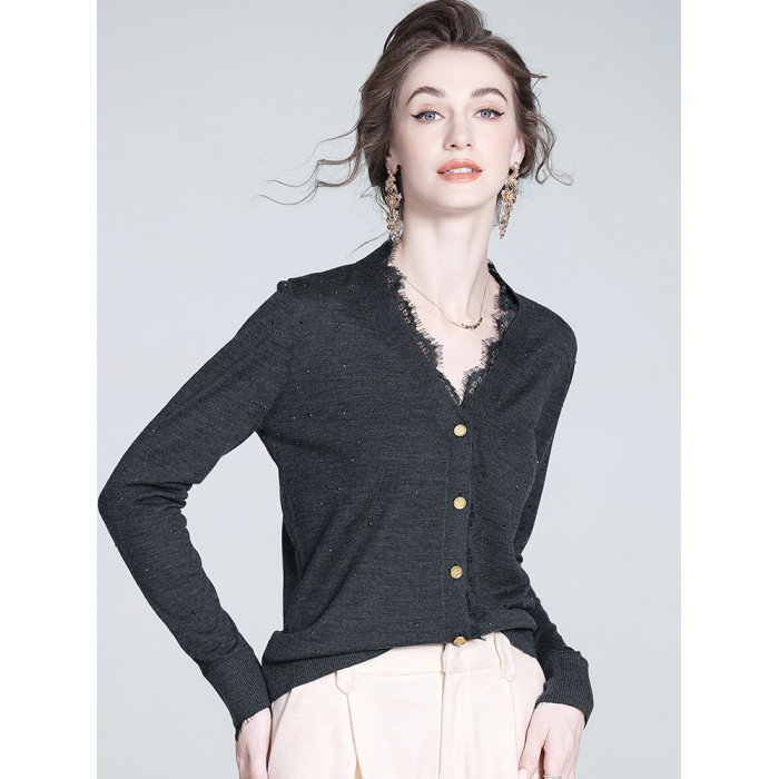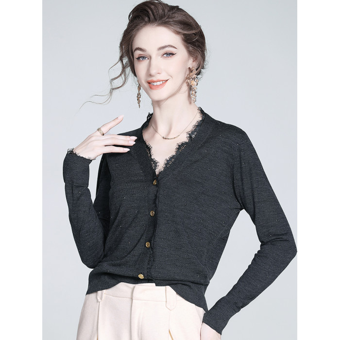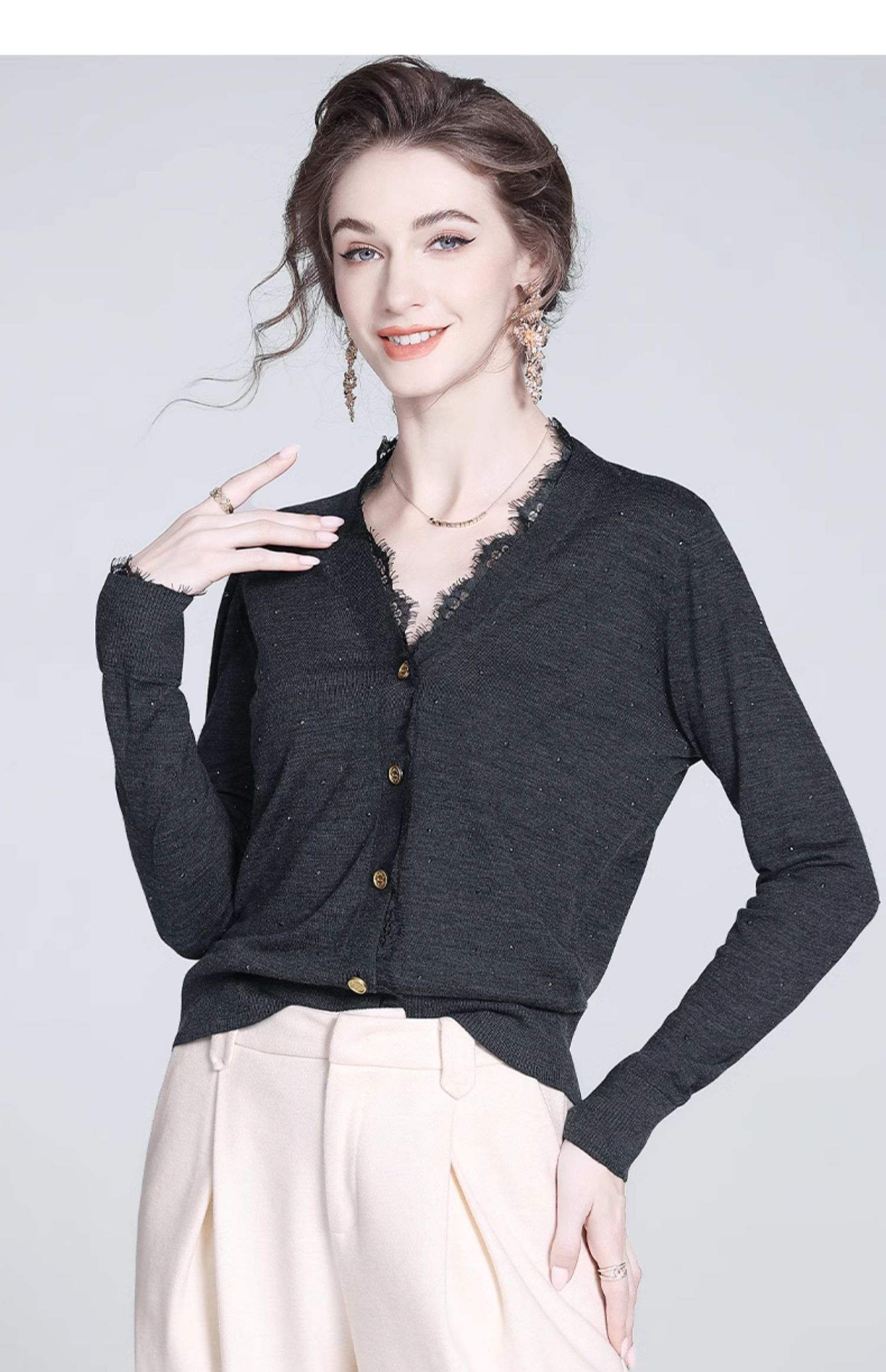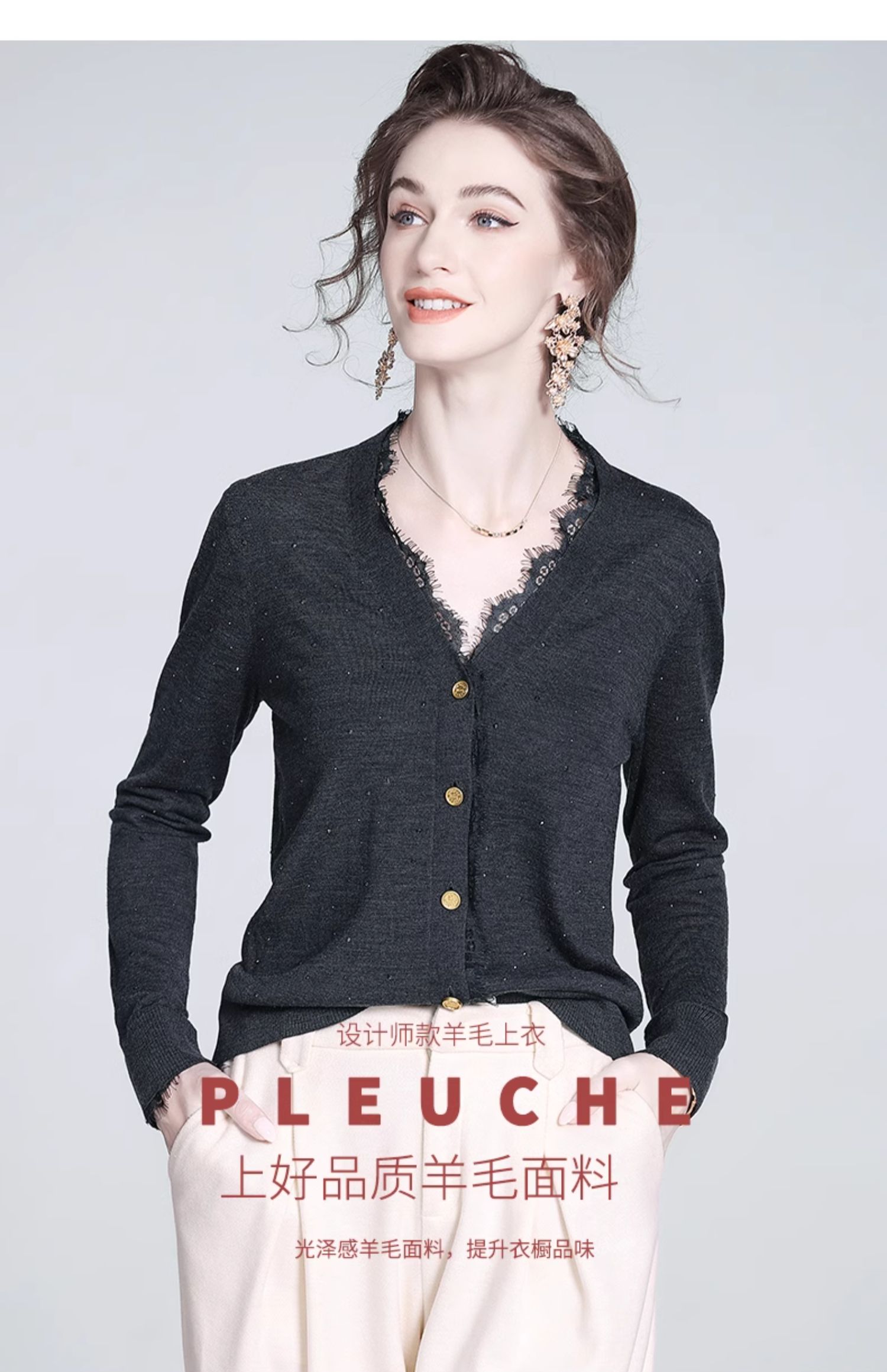 羊毛針織衫女2025秋新款高級感韓系開衫外套蕾絲邊V領毛衣打底衫