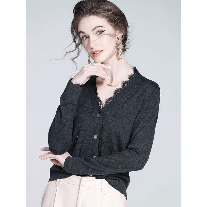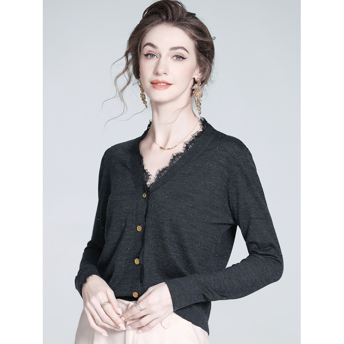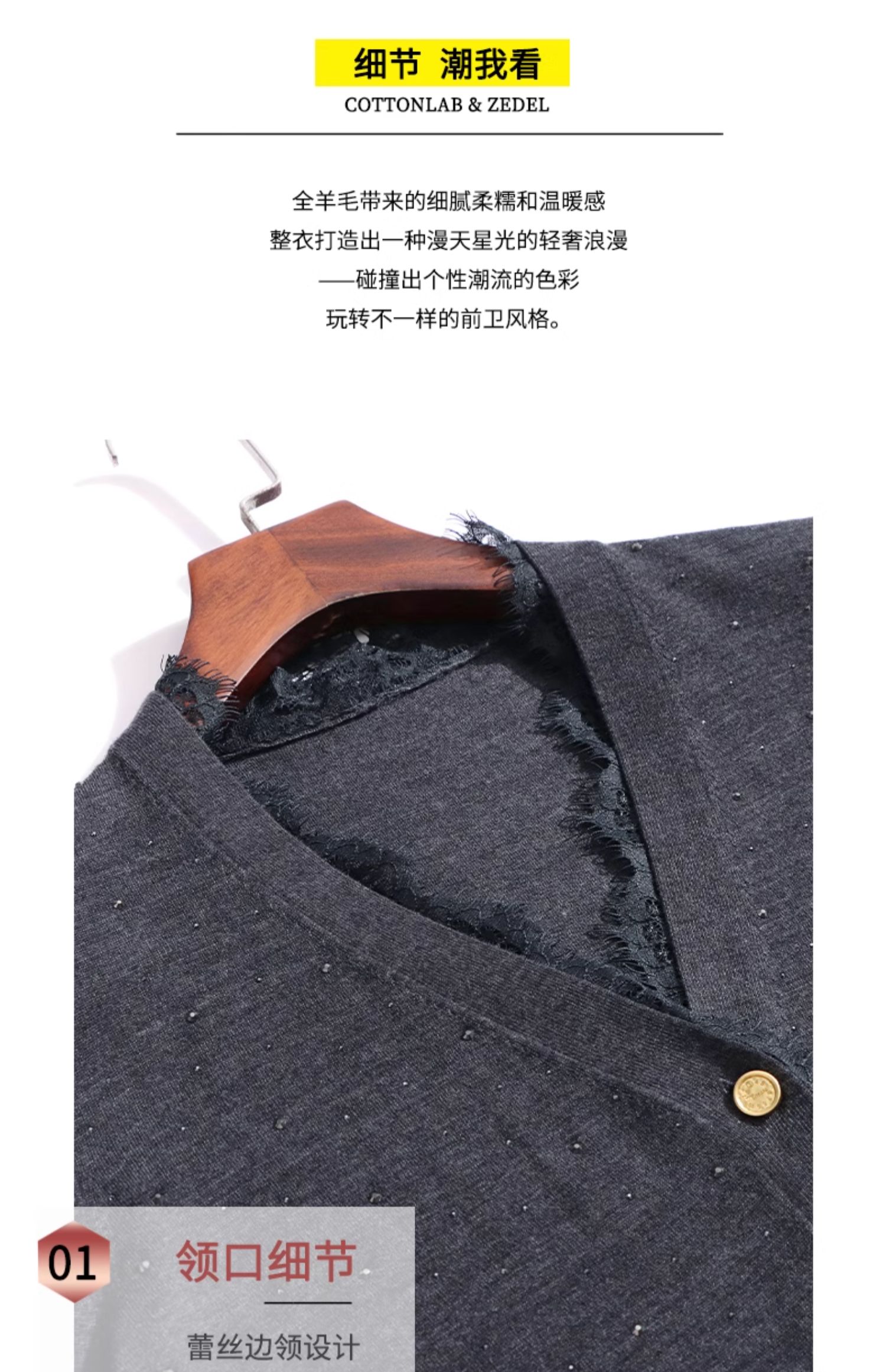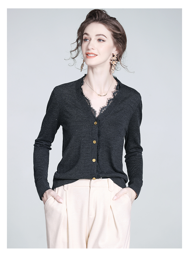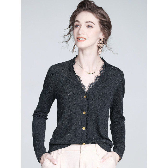 羊毛針織衫女2025秋新款高級感韓系開衫外套蕾絲邊V領毛衣打底衫