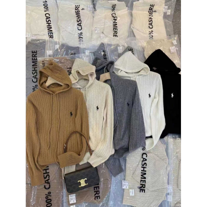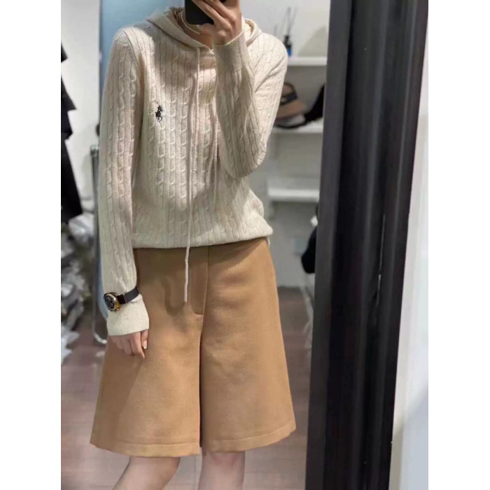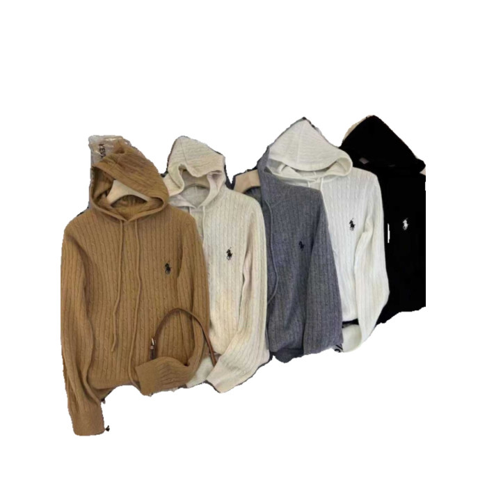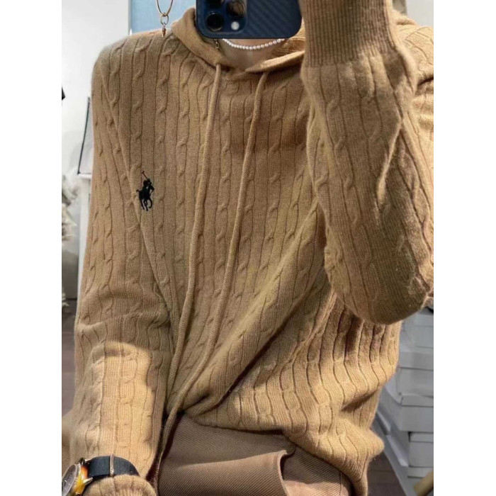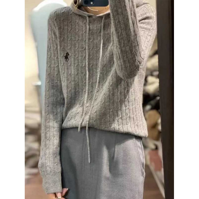 重磅保羅刺綉連帽衫100%純羊毛女絞花套頭毛衣上衣打底衫針織衛衣