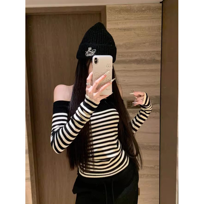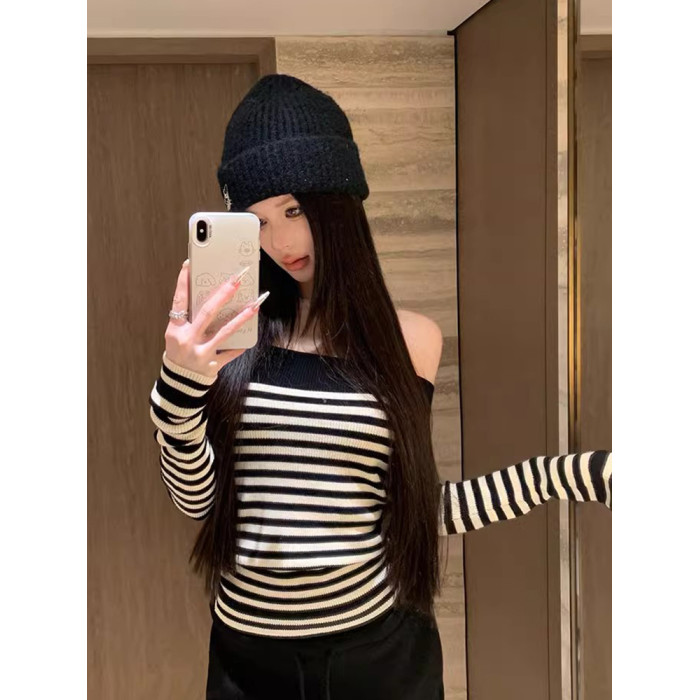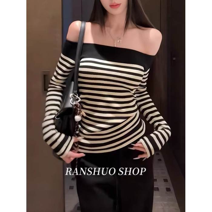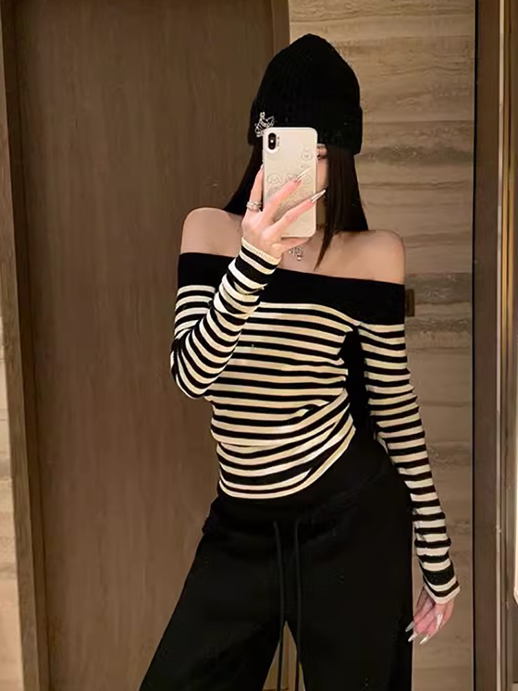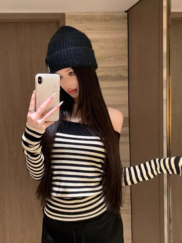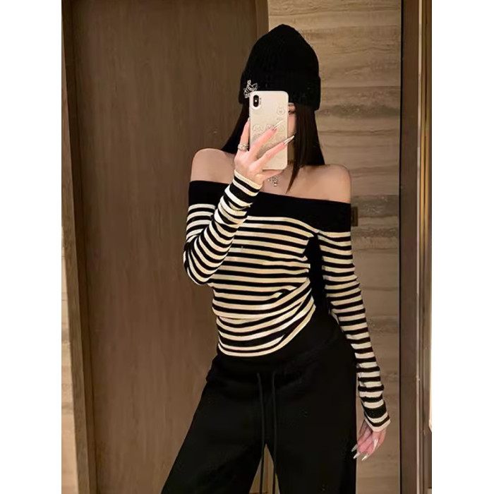 一字肩黑白條紋針織衫女秋冬內搭顯瘦打底衫純欲辣妹露肩撞色毛衣
