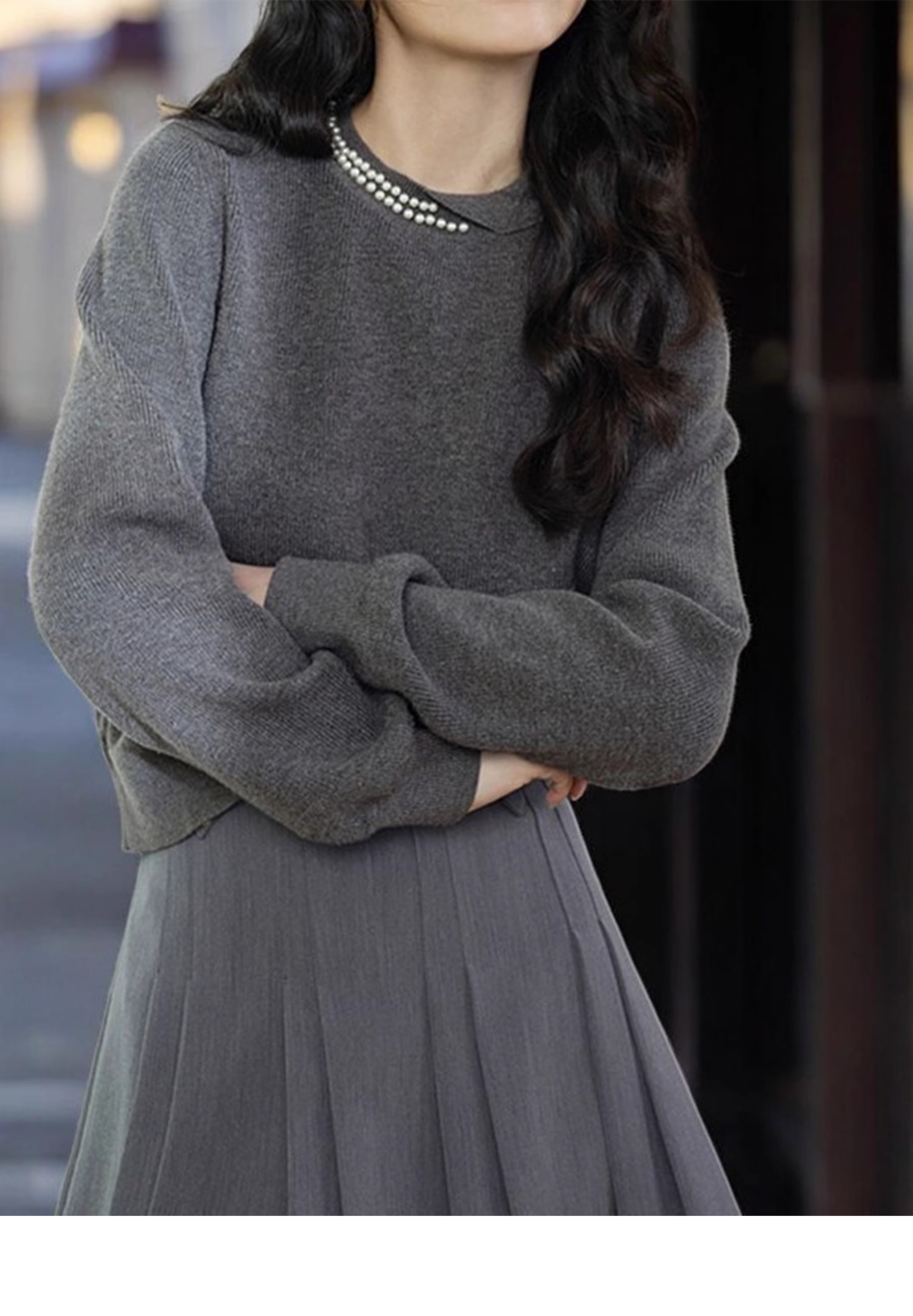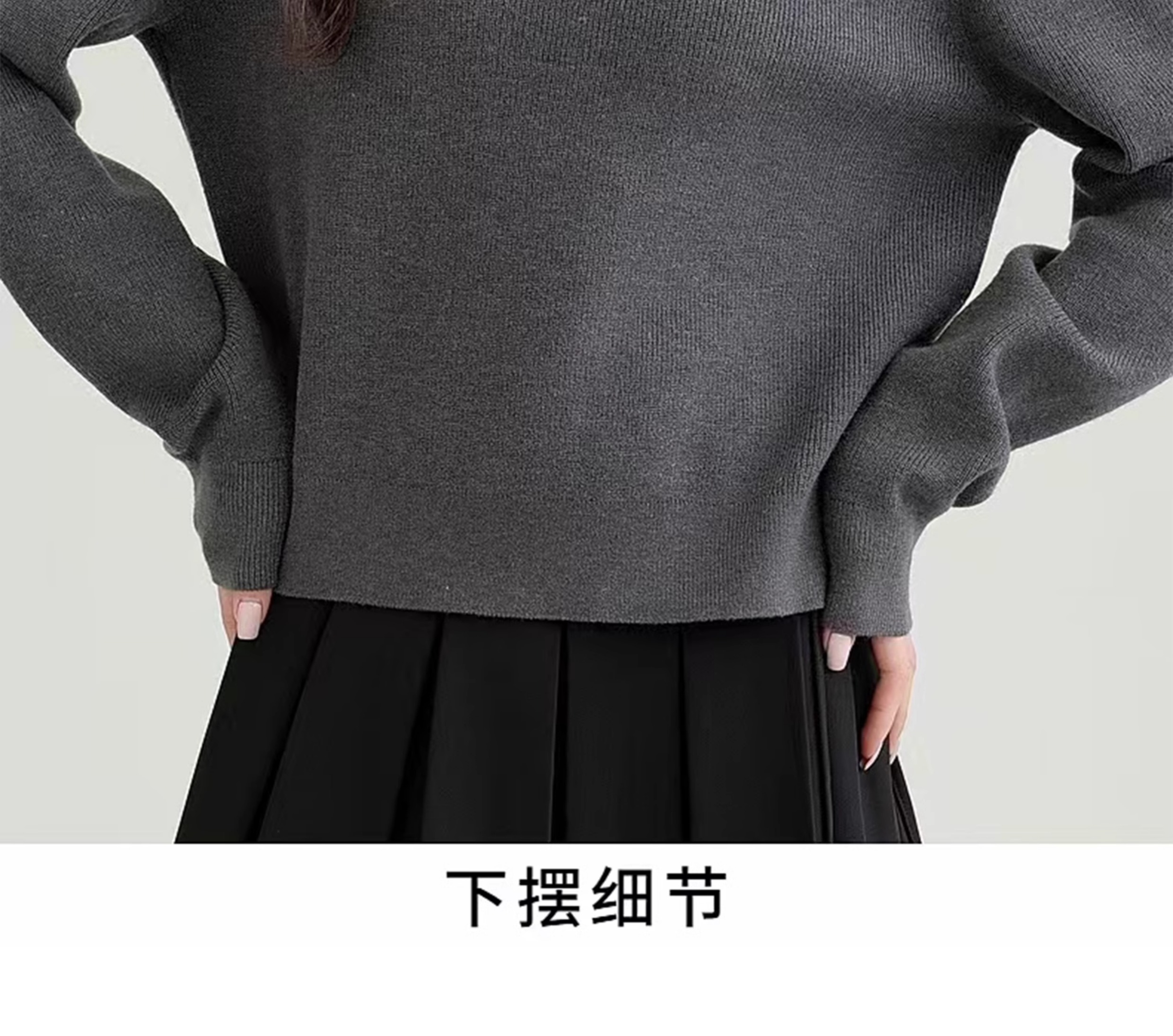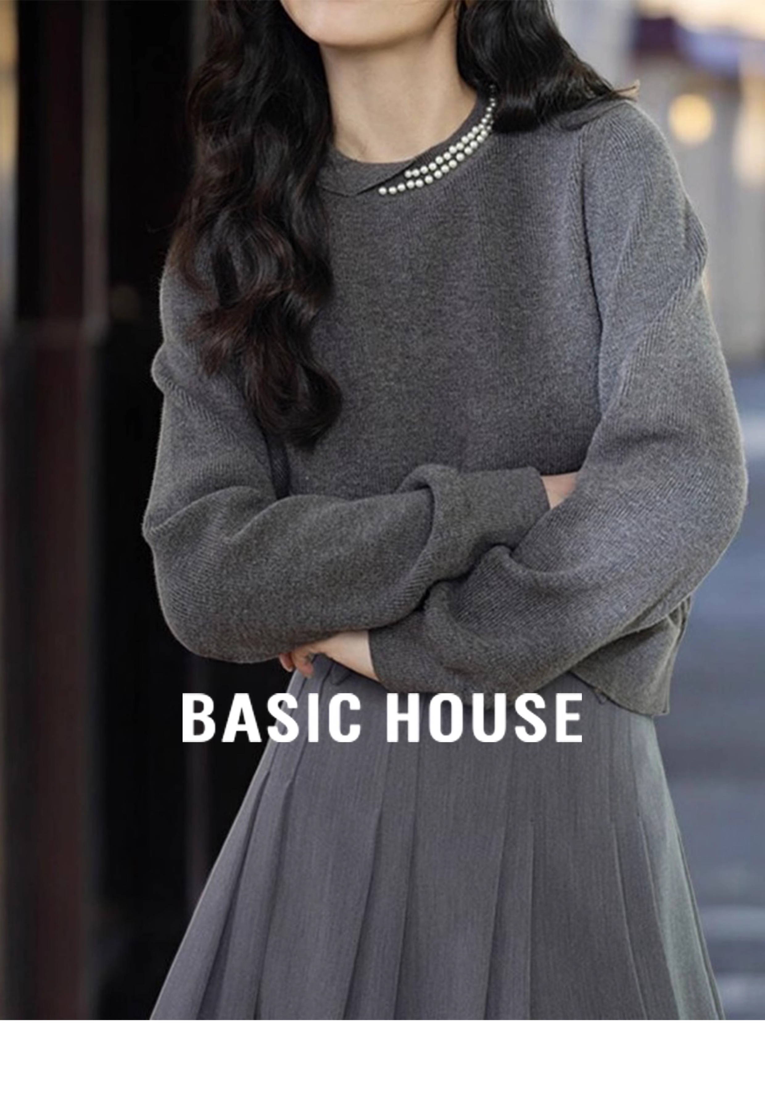Basic House/百家好100%羊毛灰色圓領毛衣女秋季高級感內搭打底衫