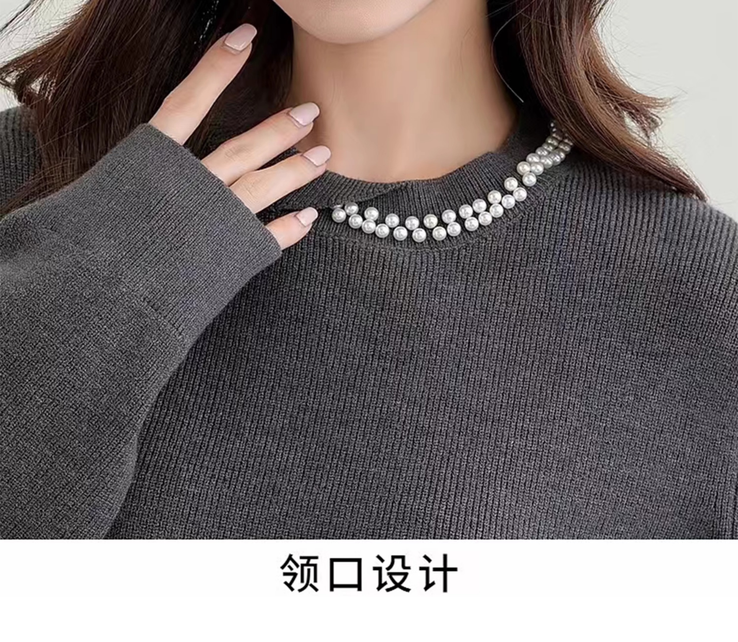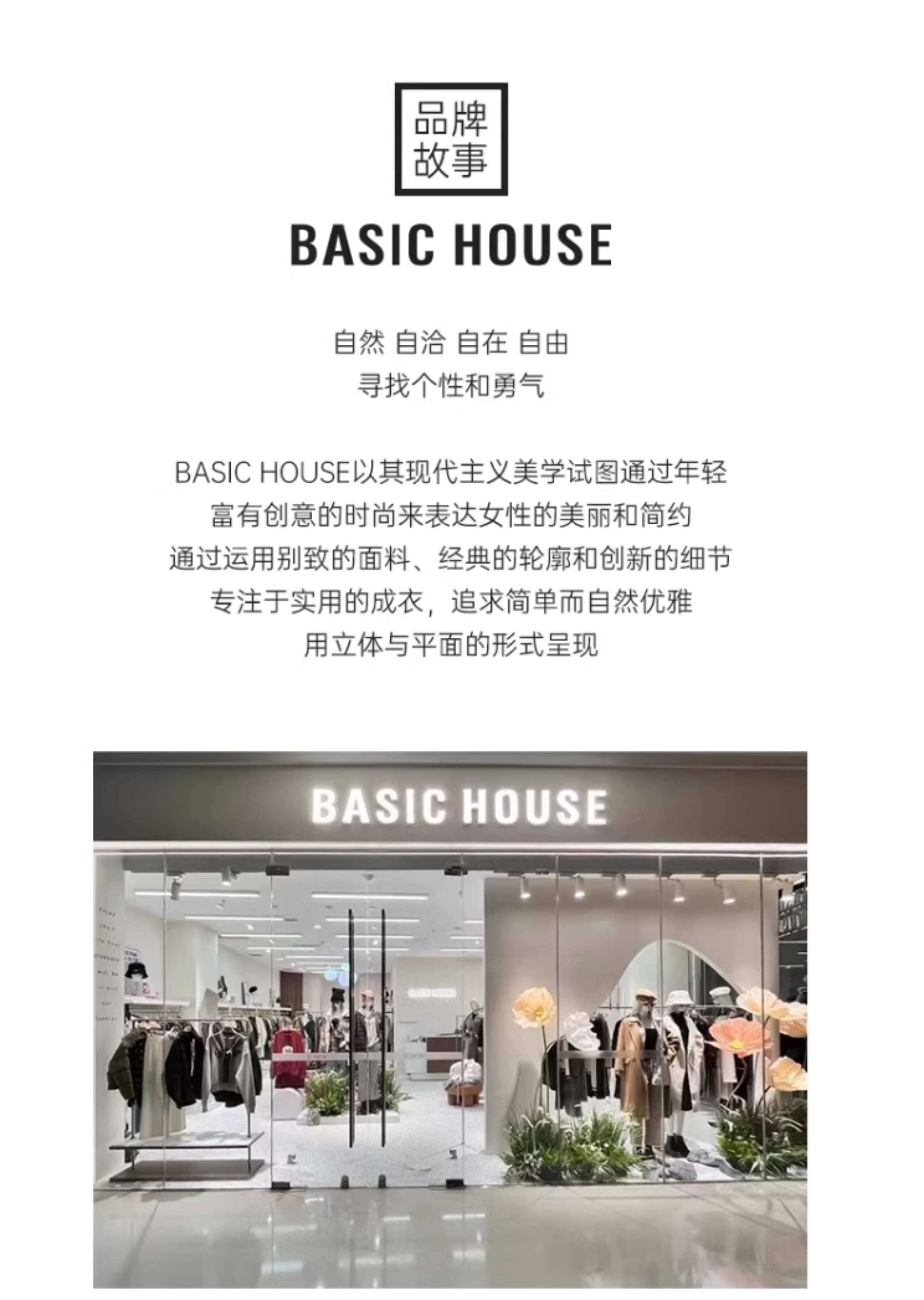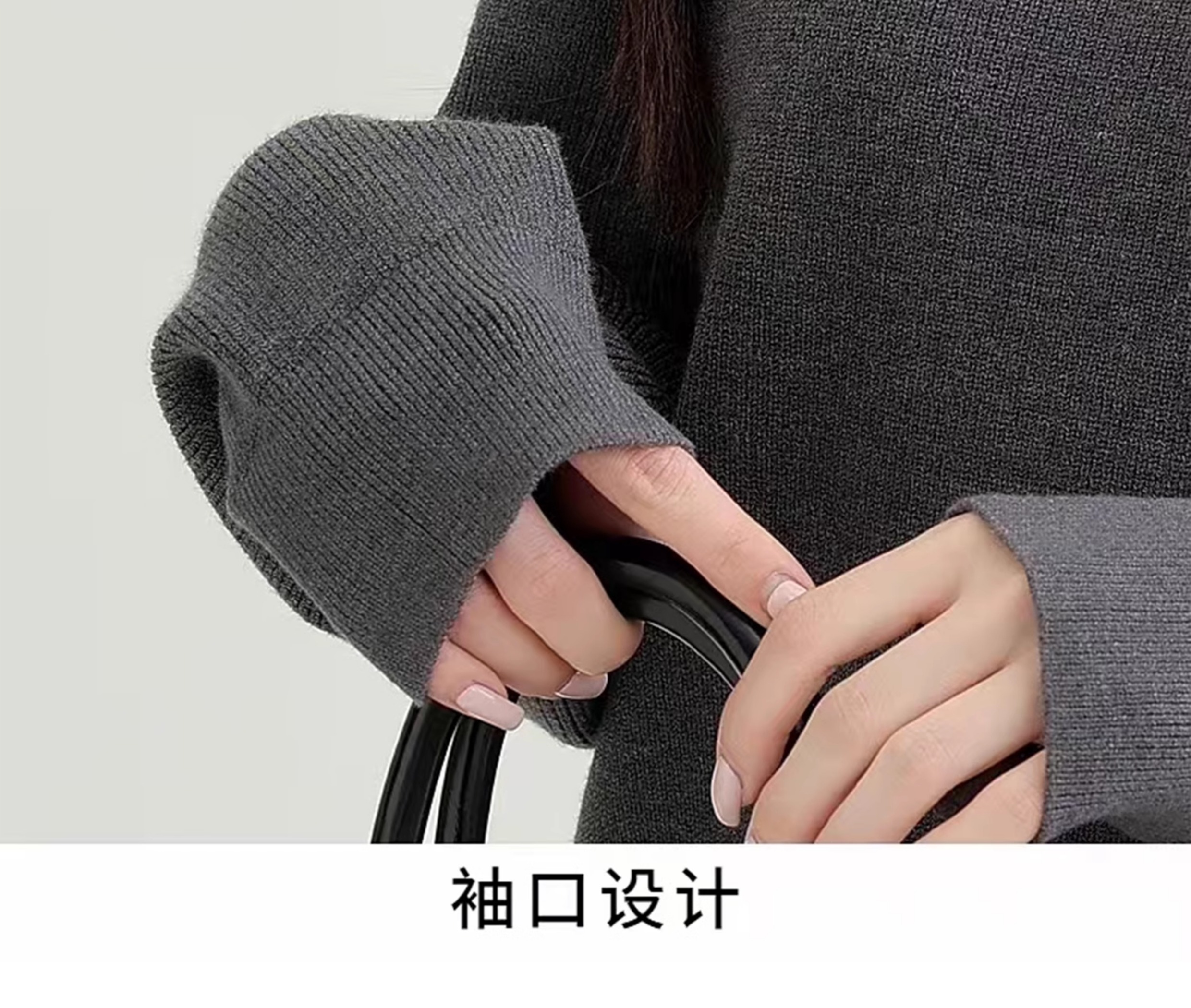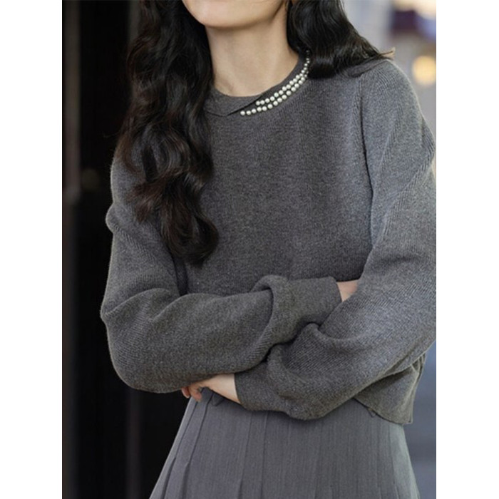 Basic House/百家好100%羊毛灰色圓領毛衣女秋季高級感內搭打底衫