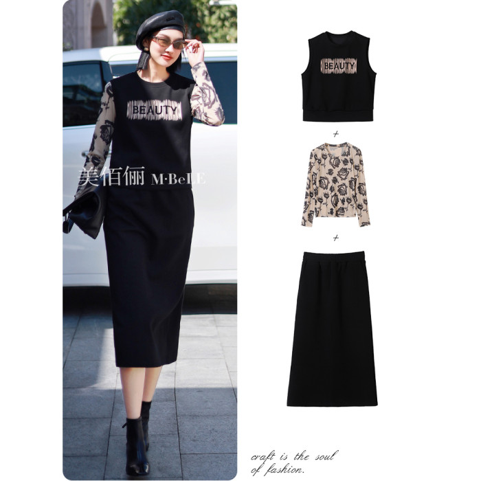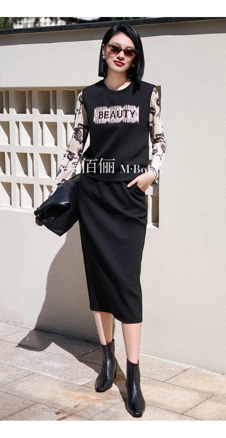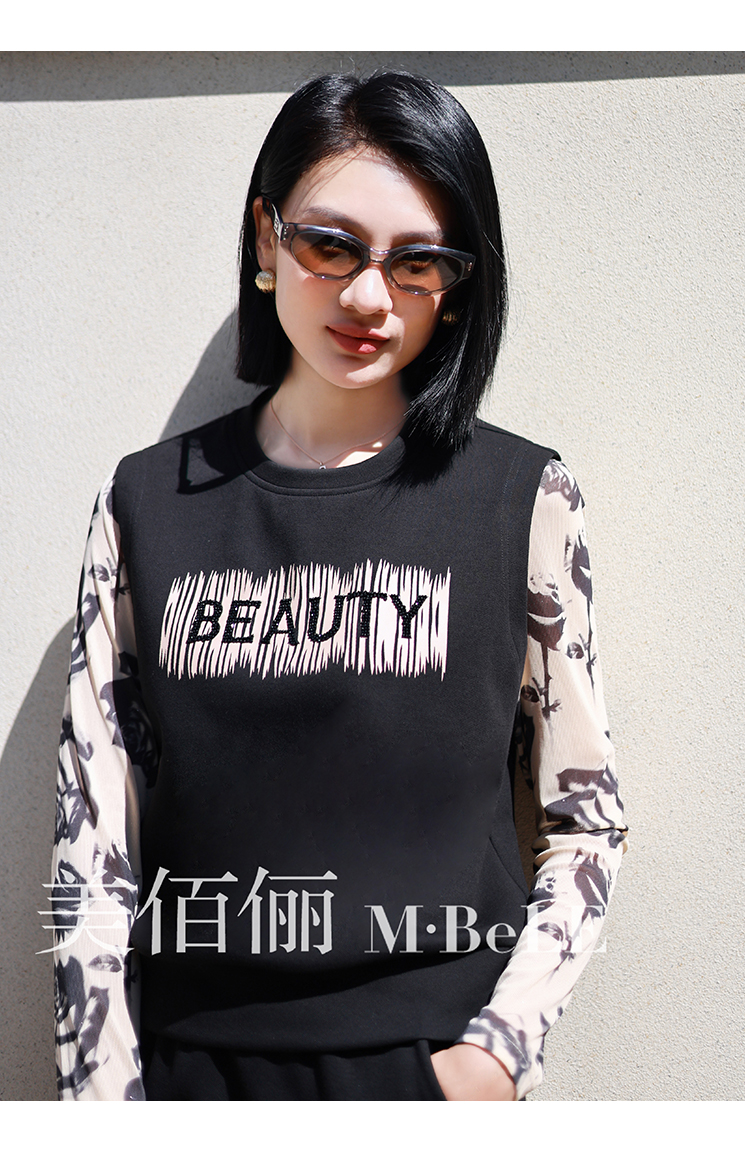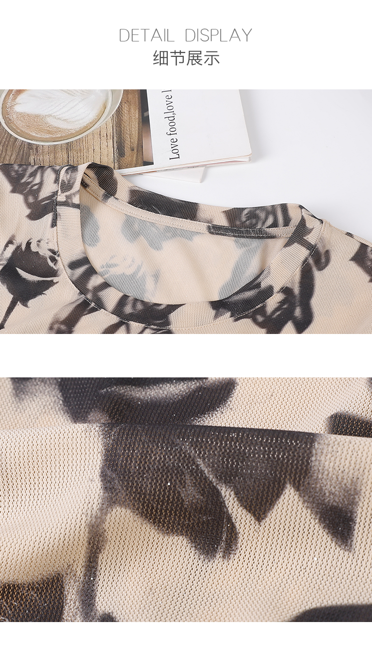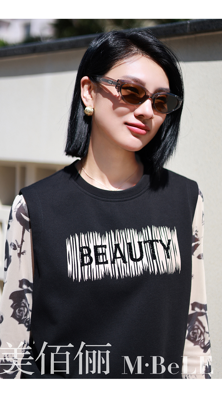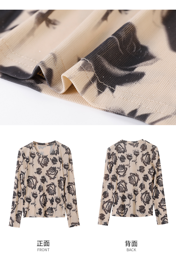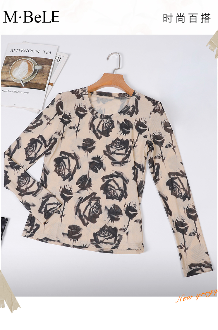 美佰儷2024秋冬新款玫瑰花印花圓領長袖恤女士修身顯瘦打底衫上衣
