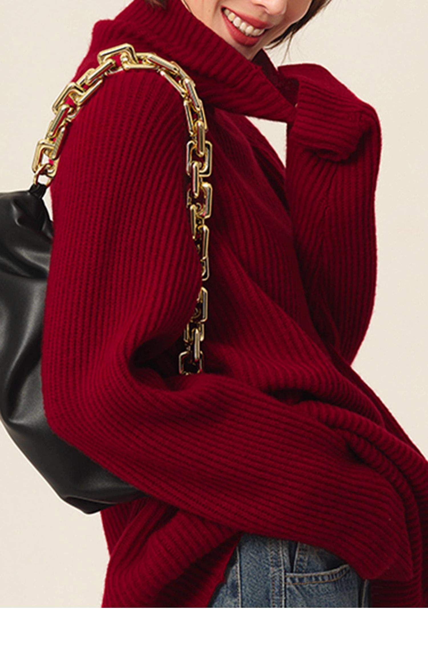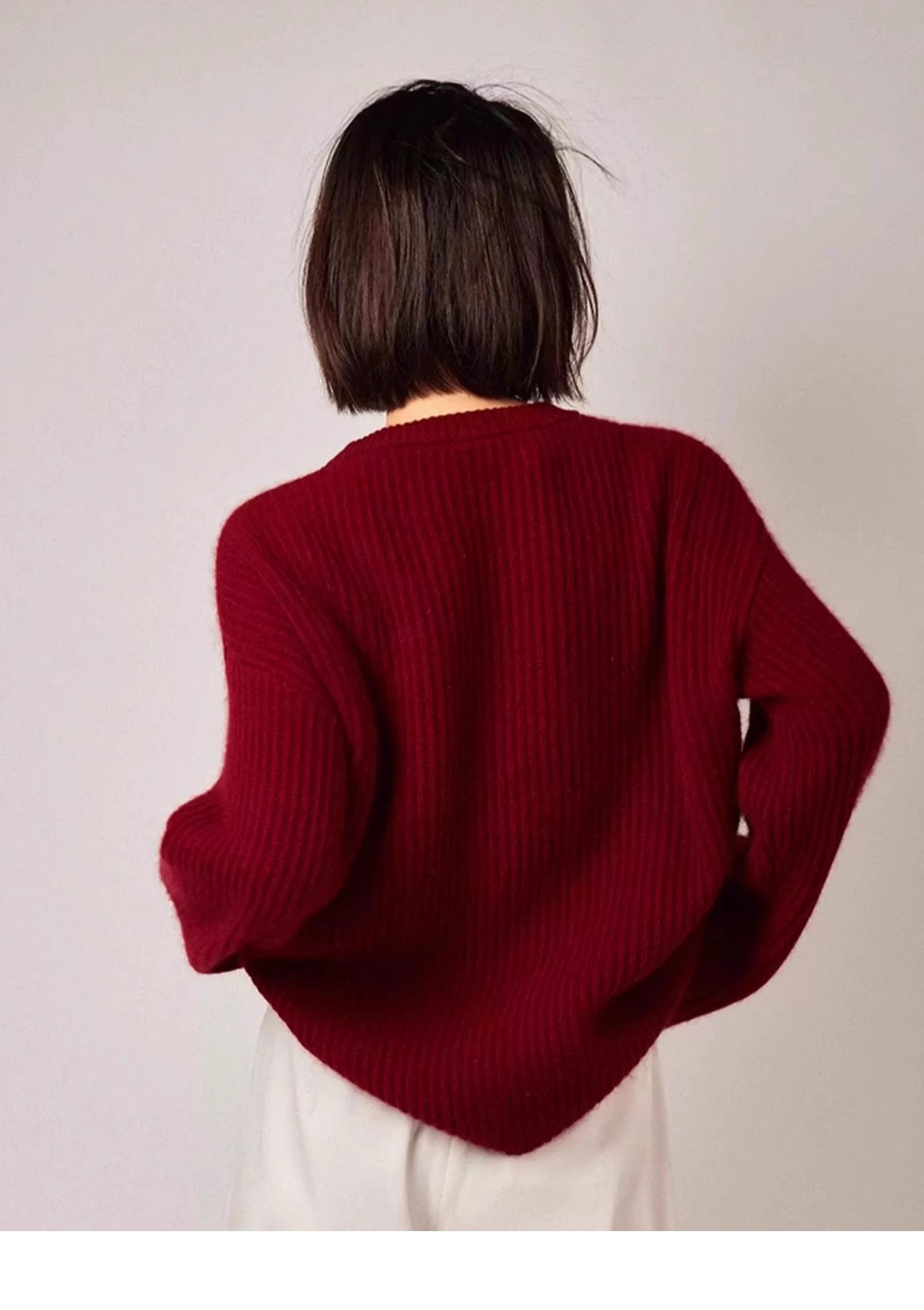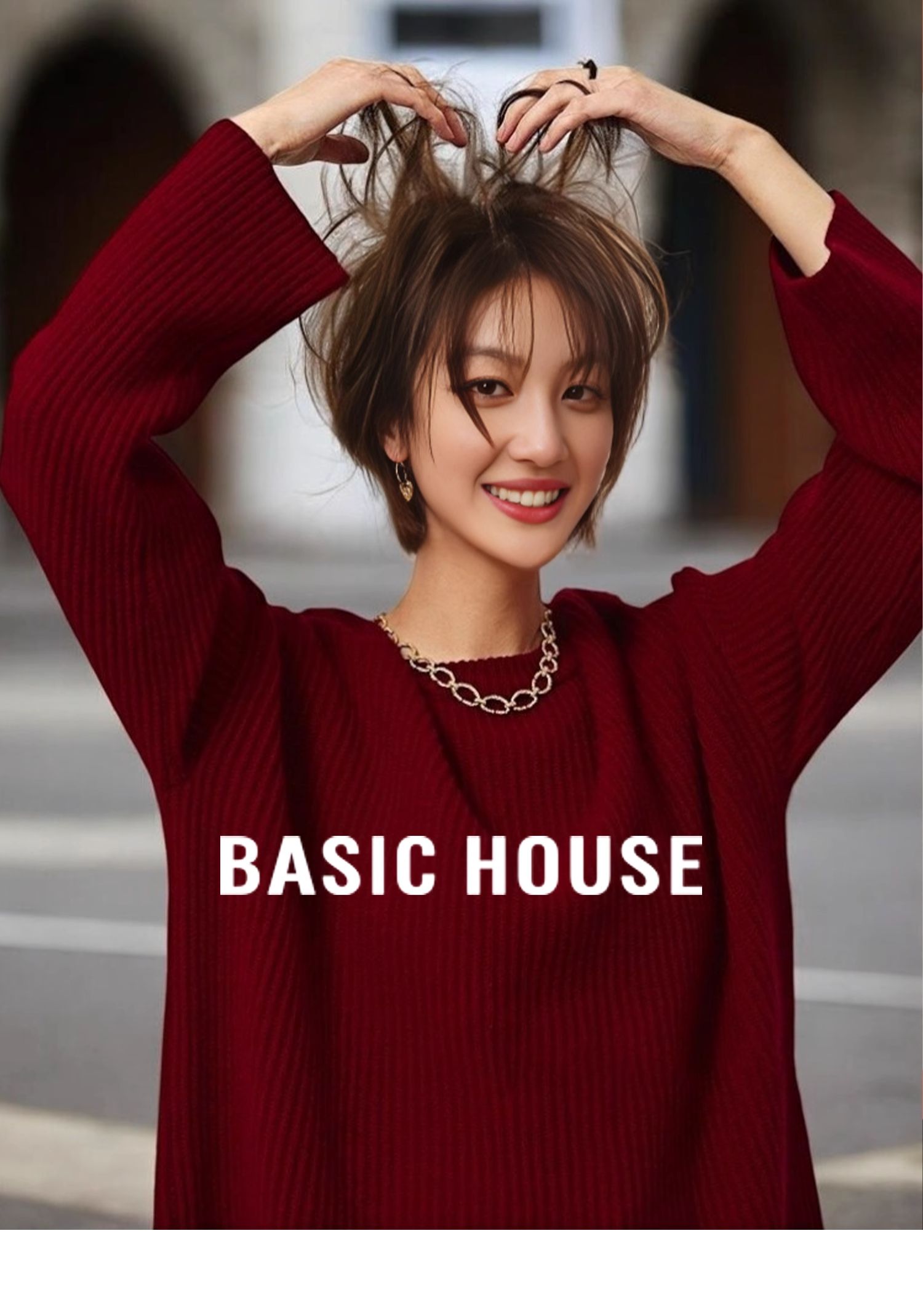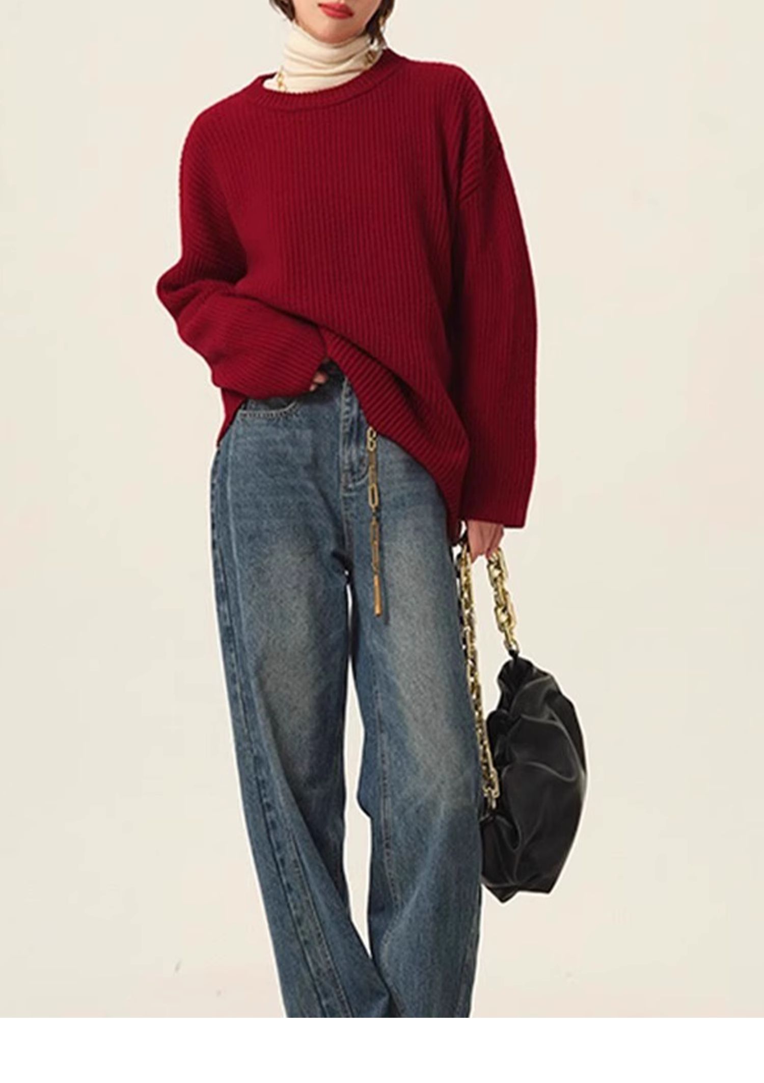 Basic House/百家好慵懶風紅色毛衣女秋季新款內搭圓領針織打底衫