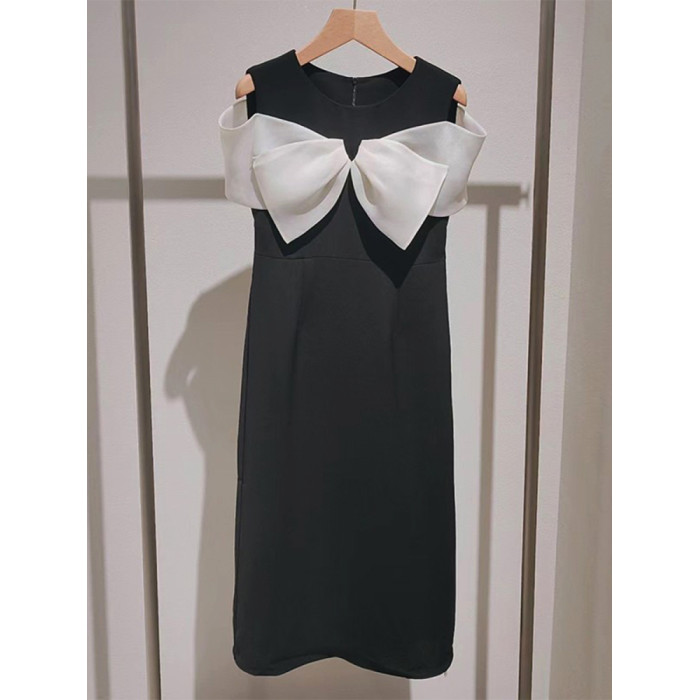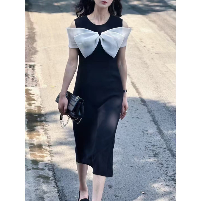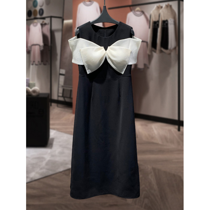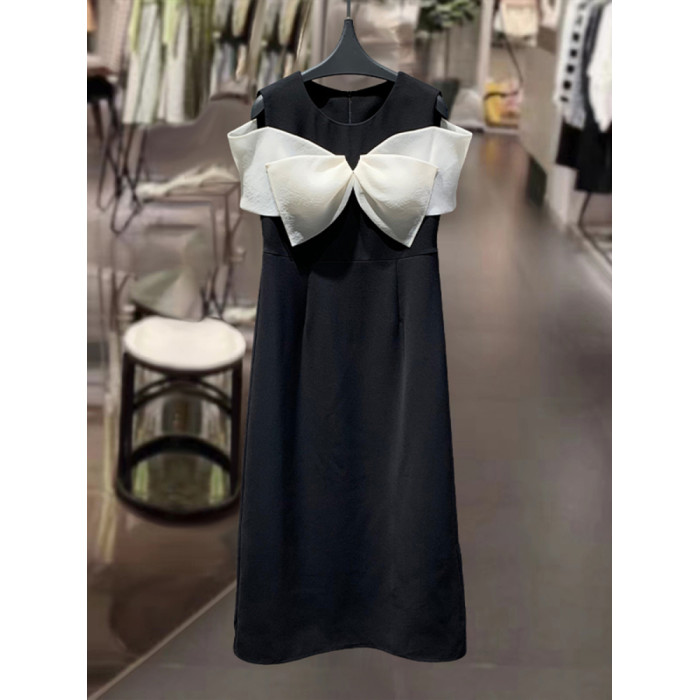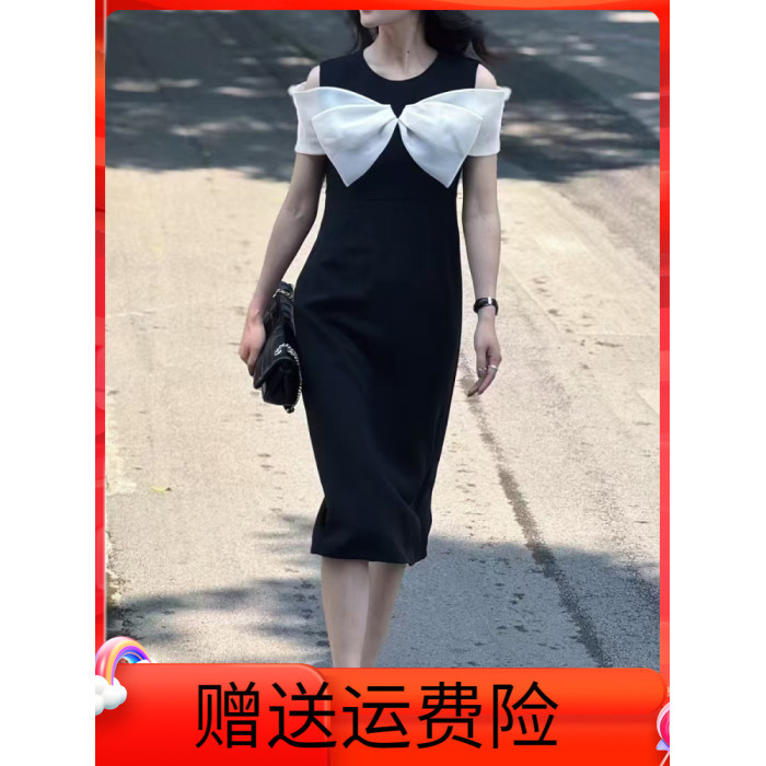 繁雲調撞色蝴蝶結露肩連衣裙女2025夏新款時尚收腰顯瘦中長款裙子