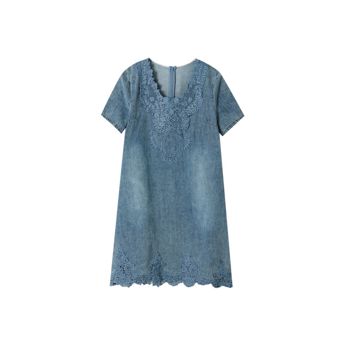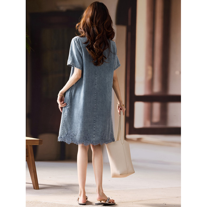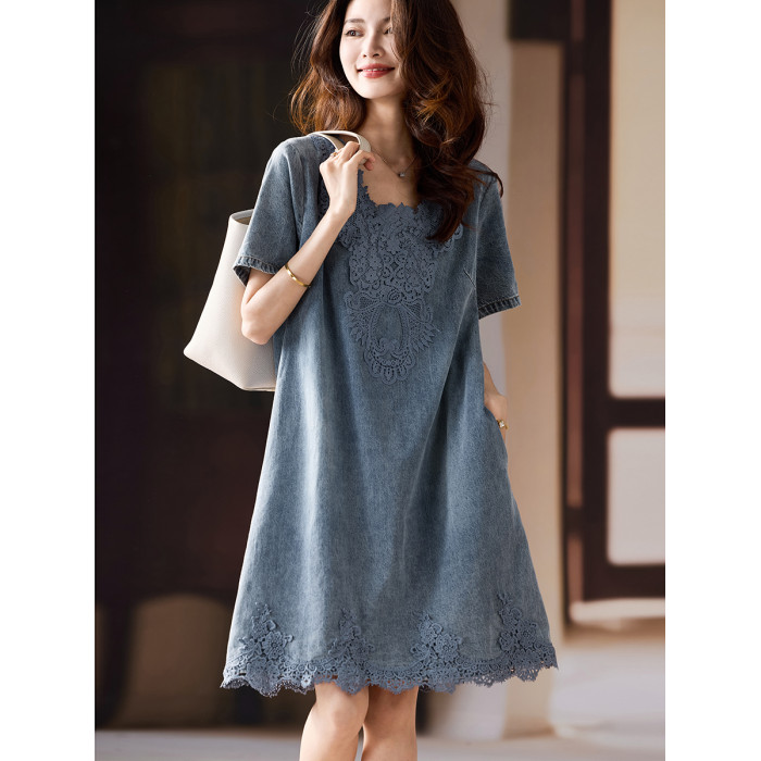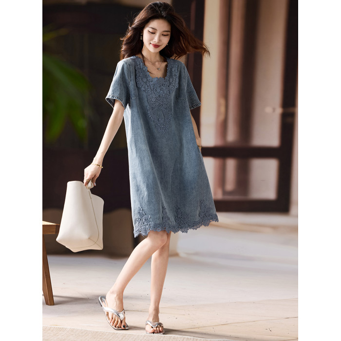 素木氣質蕾絲牛仔連衣裙女2025年夏季寬松裙子歐貨大碼新款女裝潮