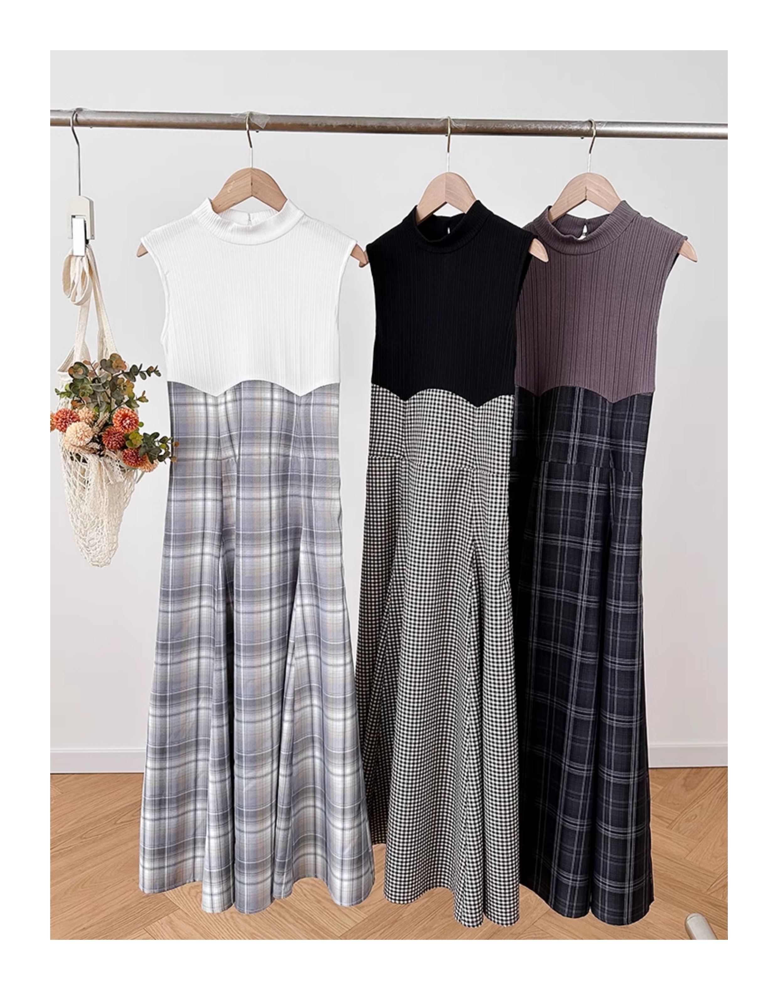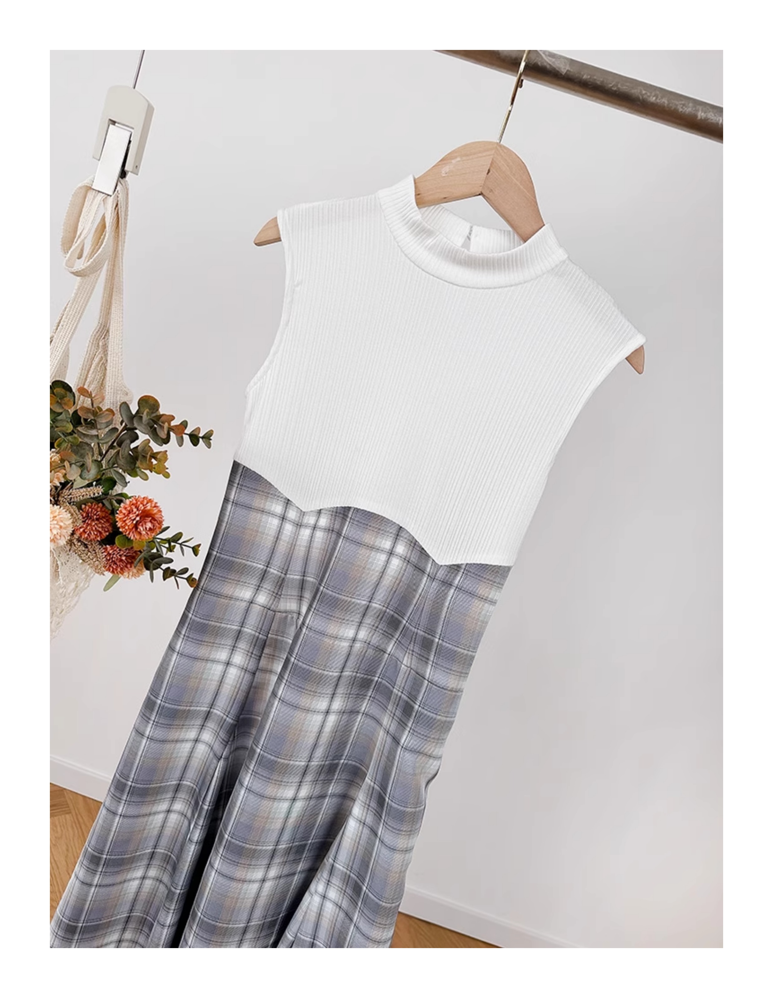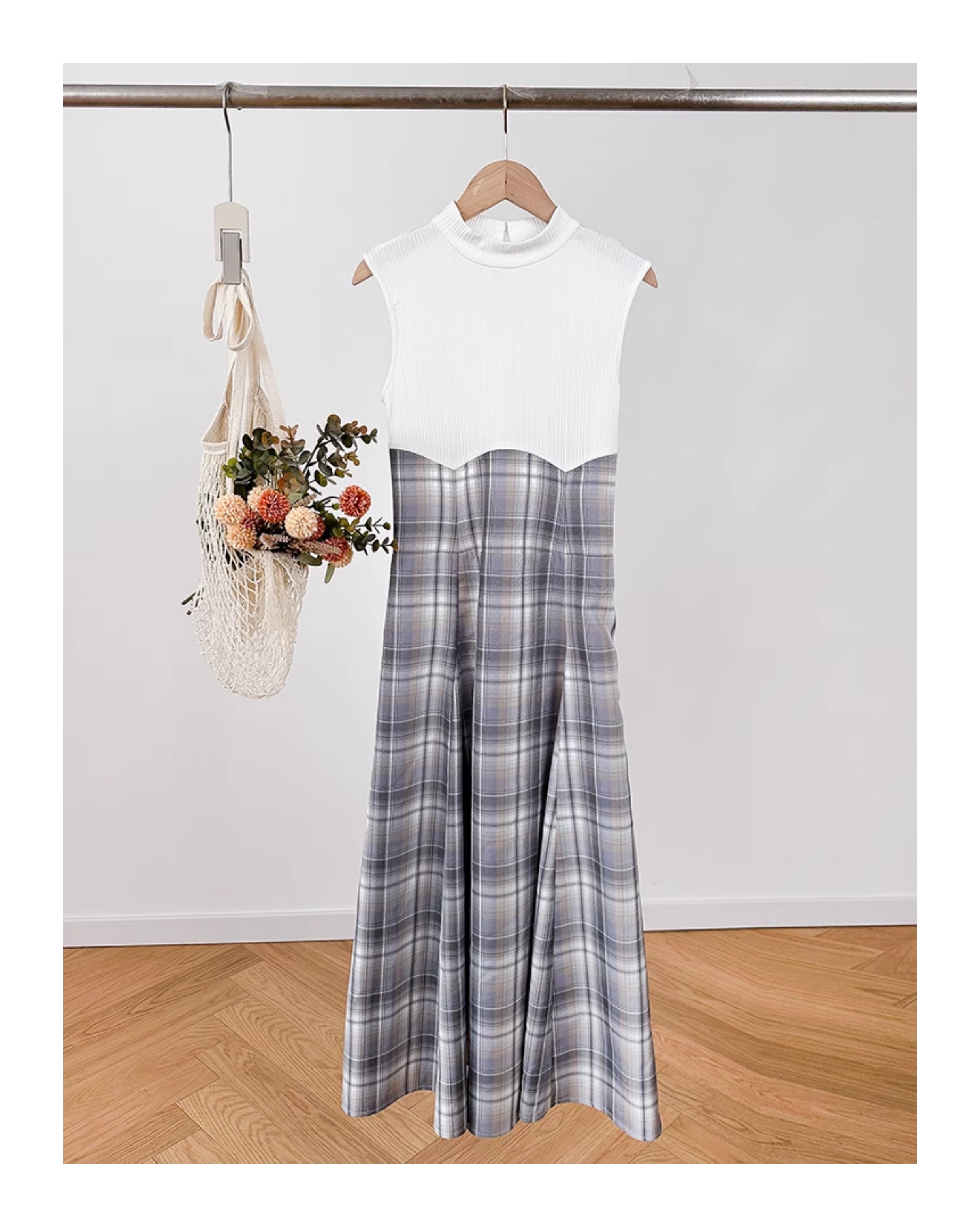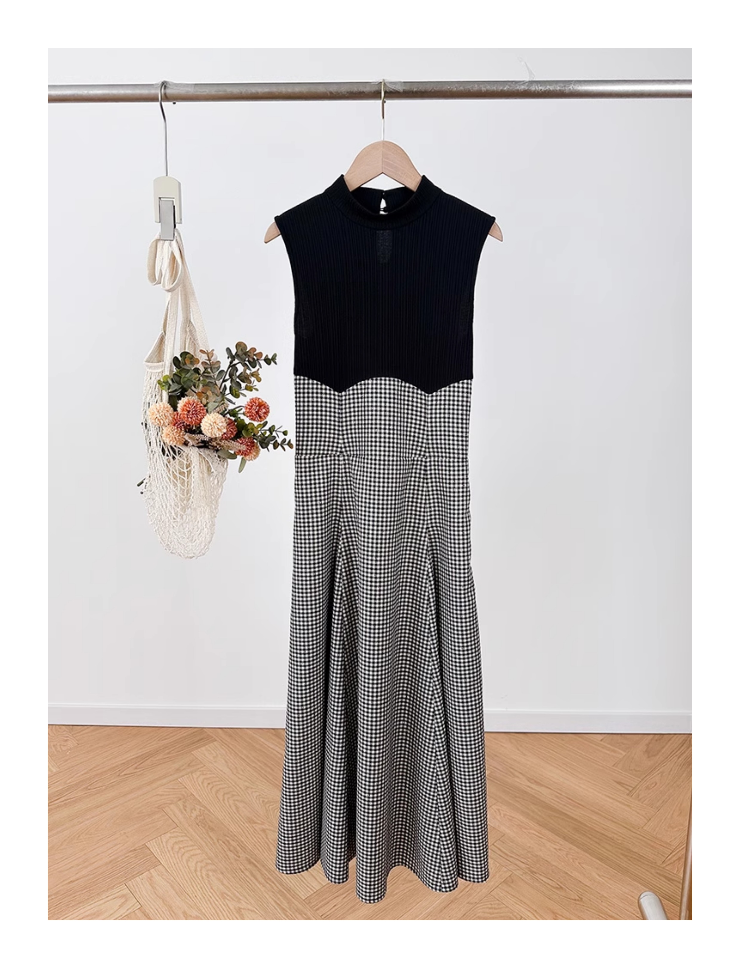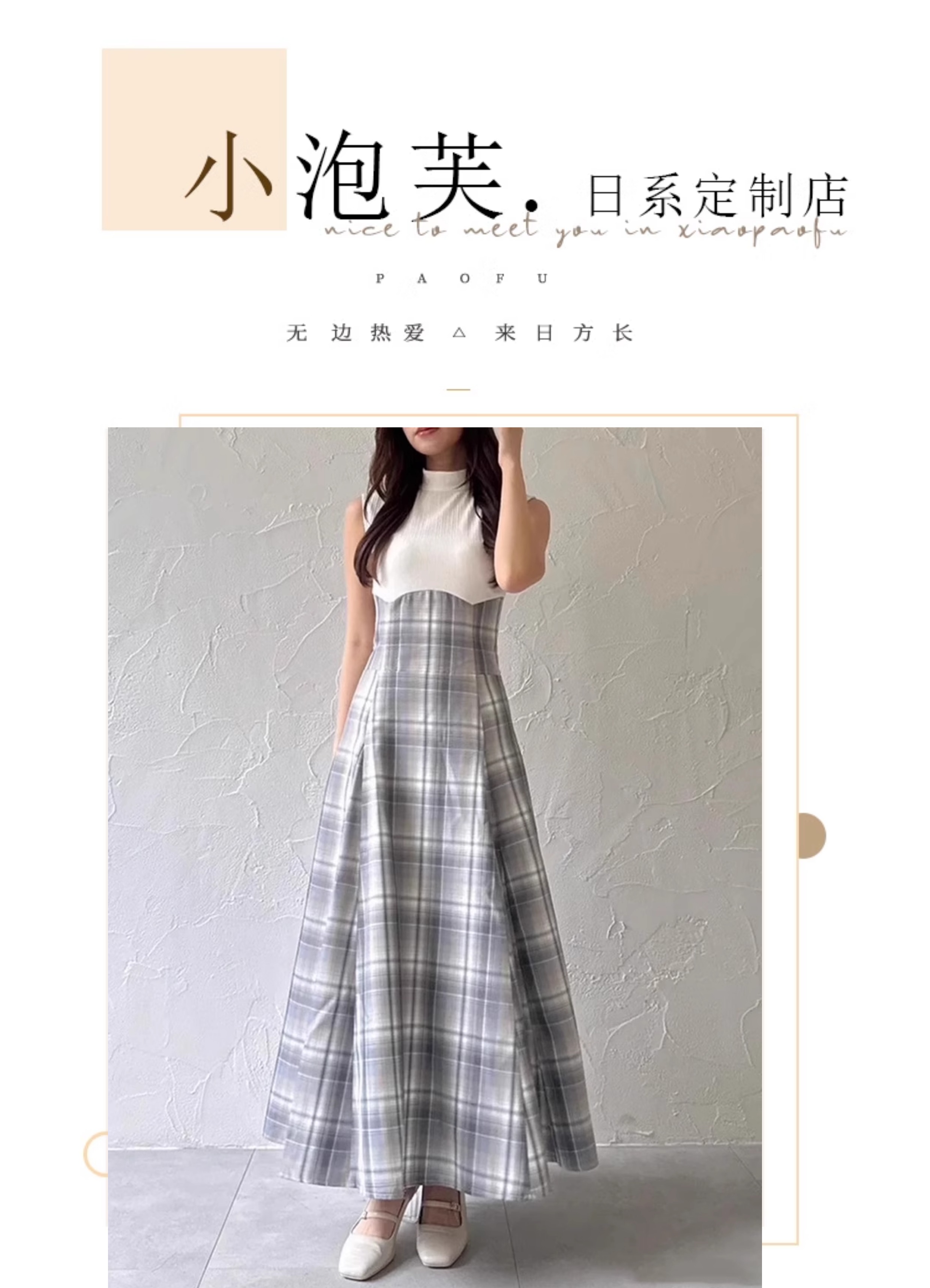 小泡芙日系春夏新款女裝時尚拼接無袖圓領格紋背心長款連衣裙女
