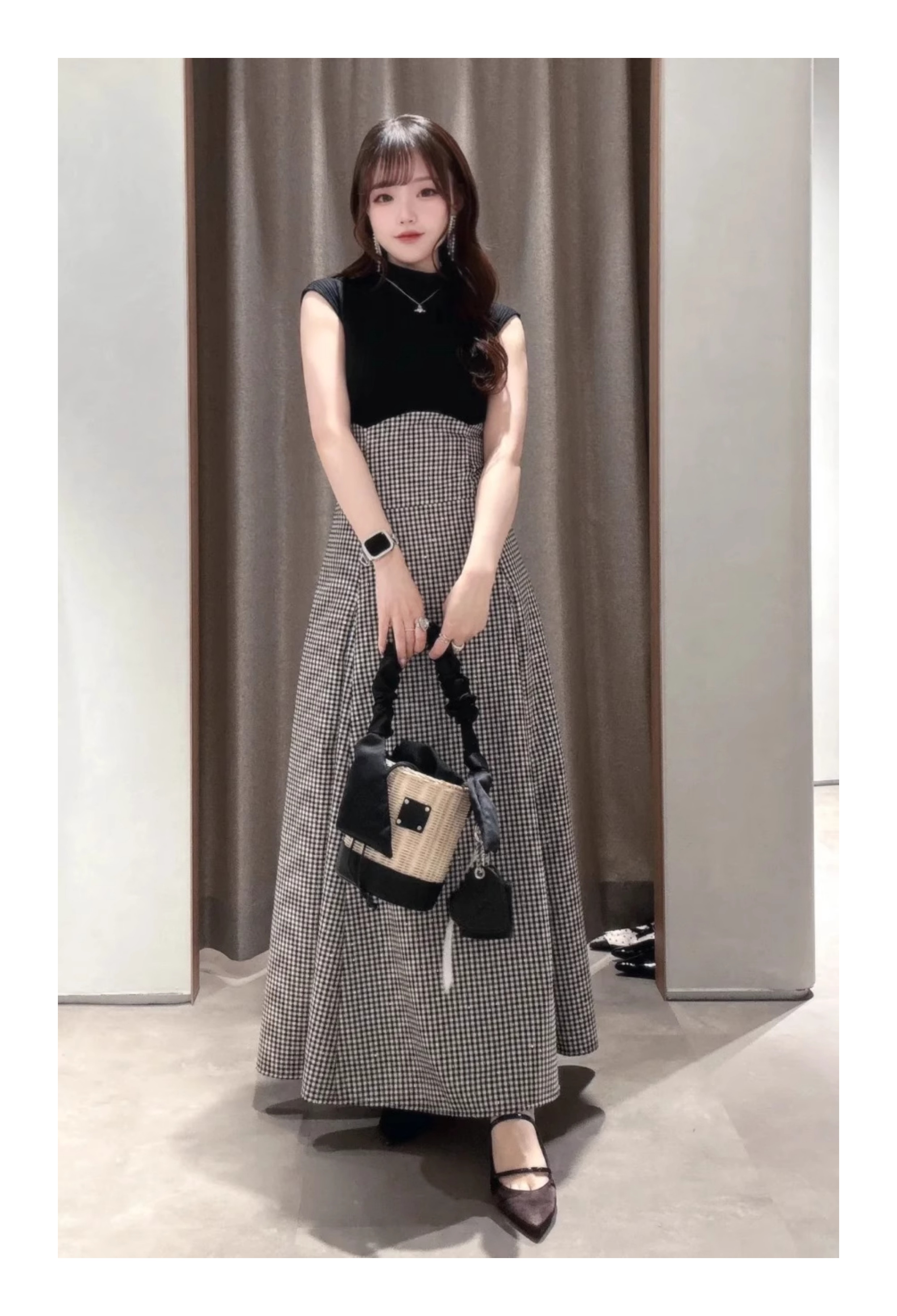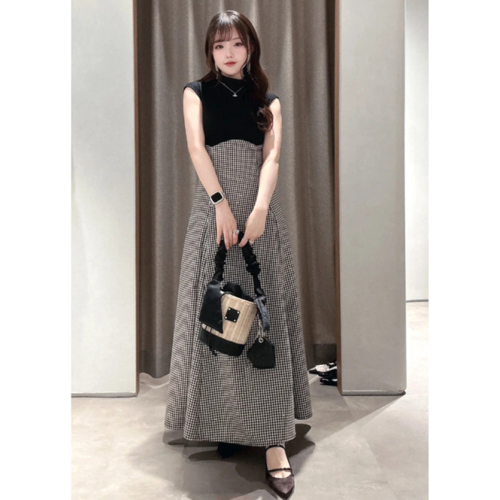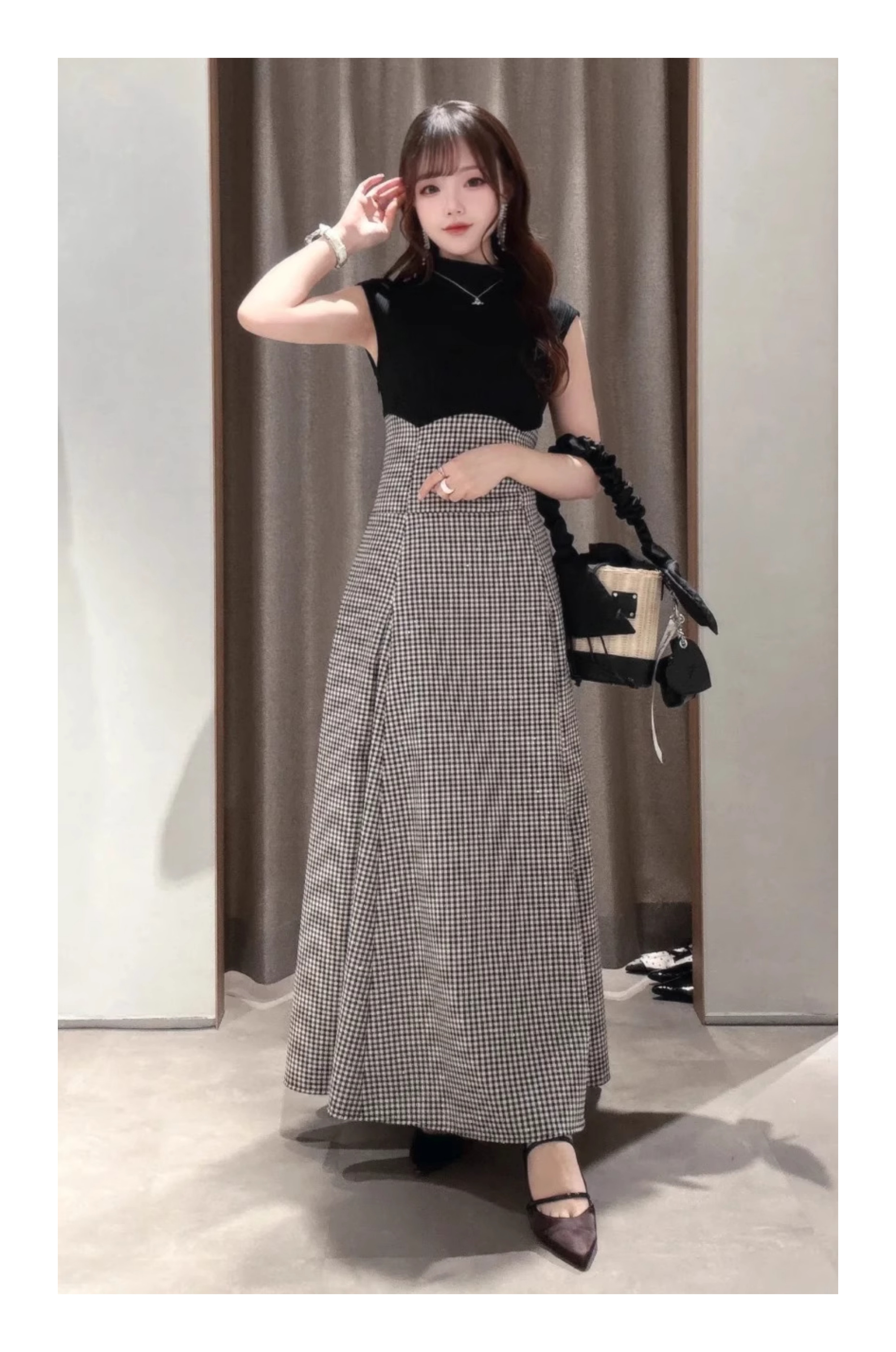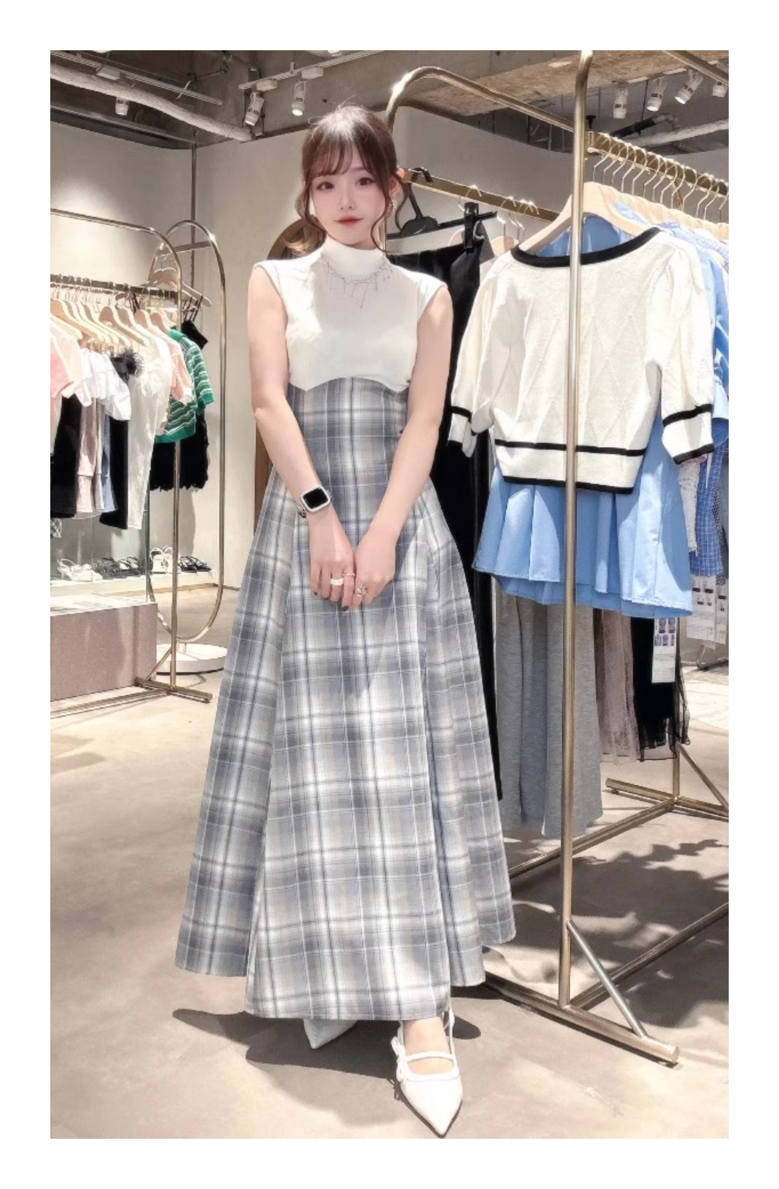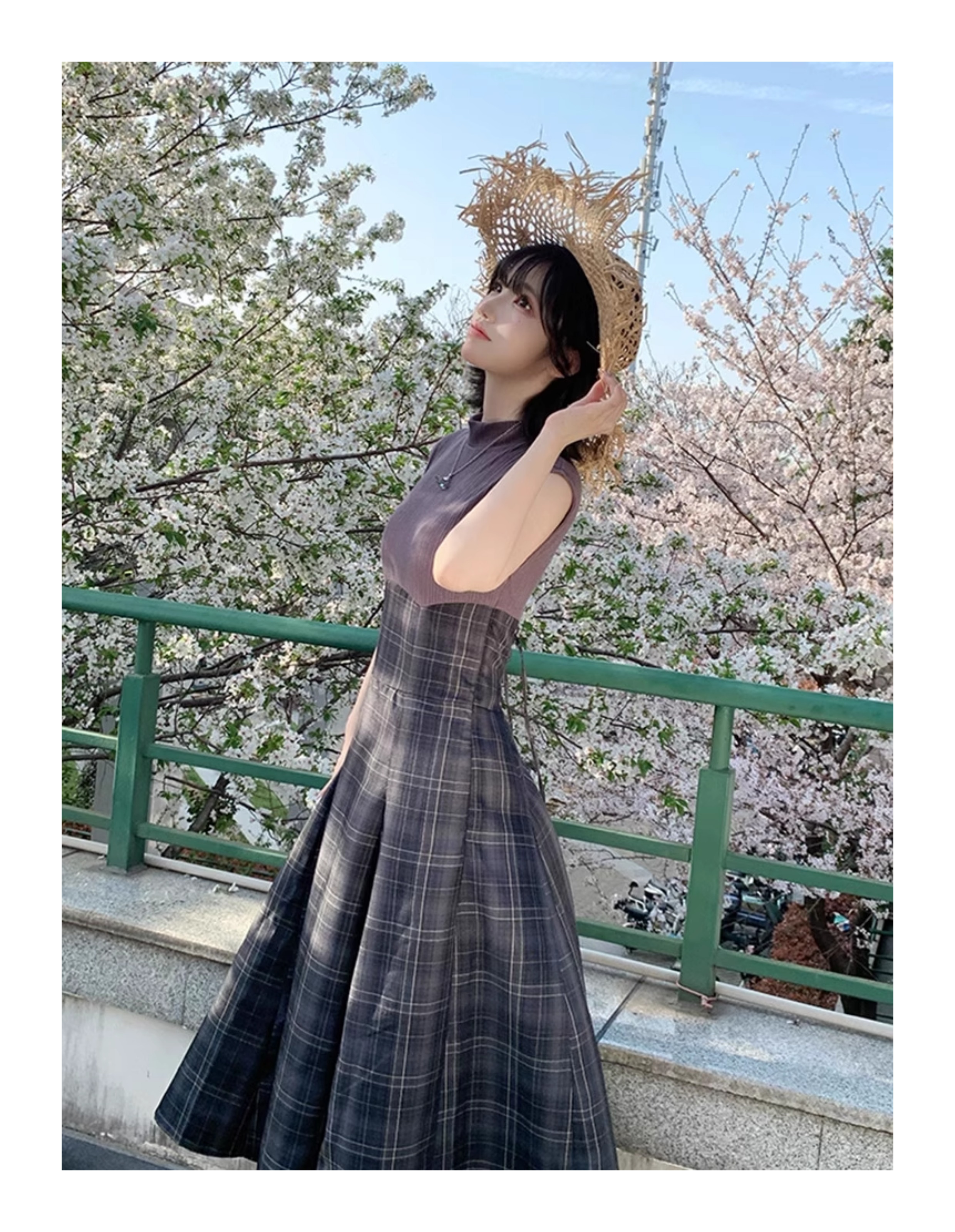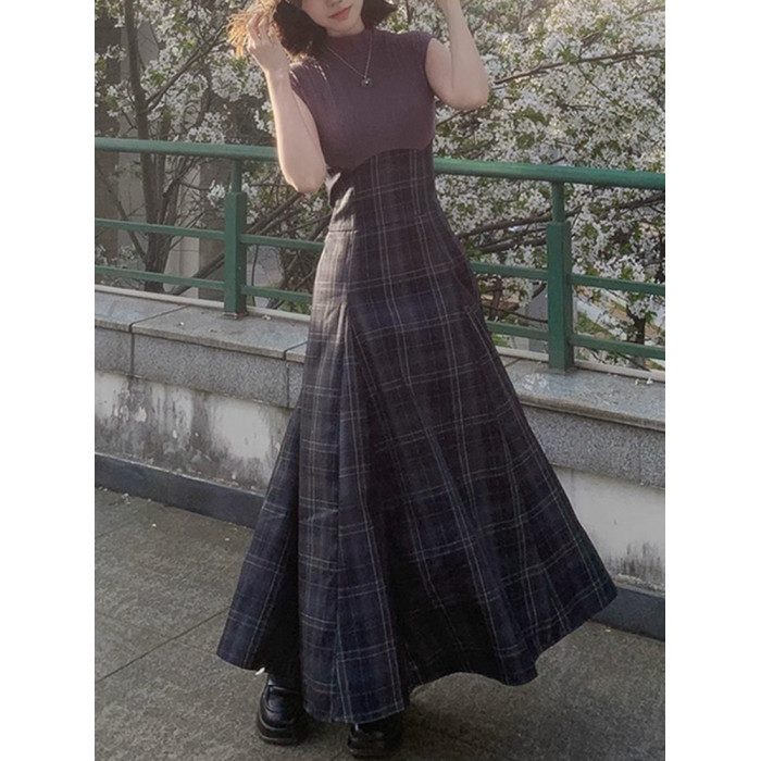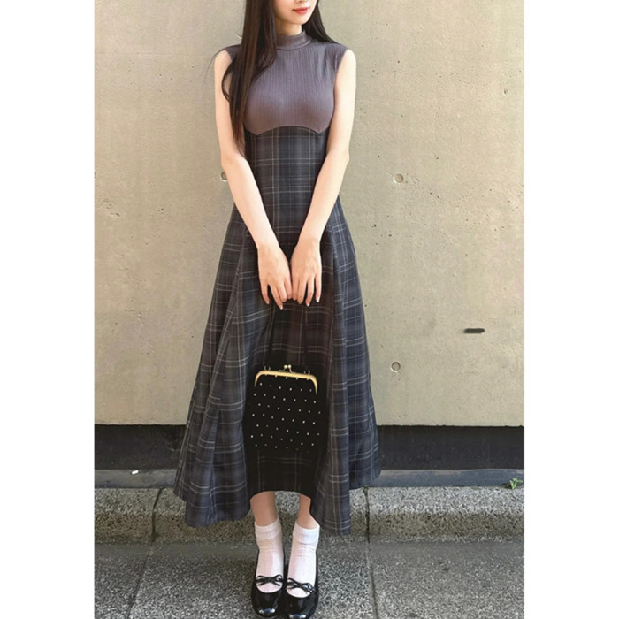 小泡芙日系春夏新款女裝時尚拼接無袖圓領格紋背心長款連衣裙女