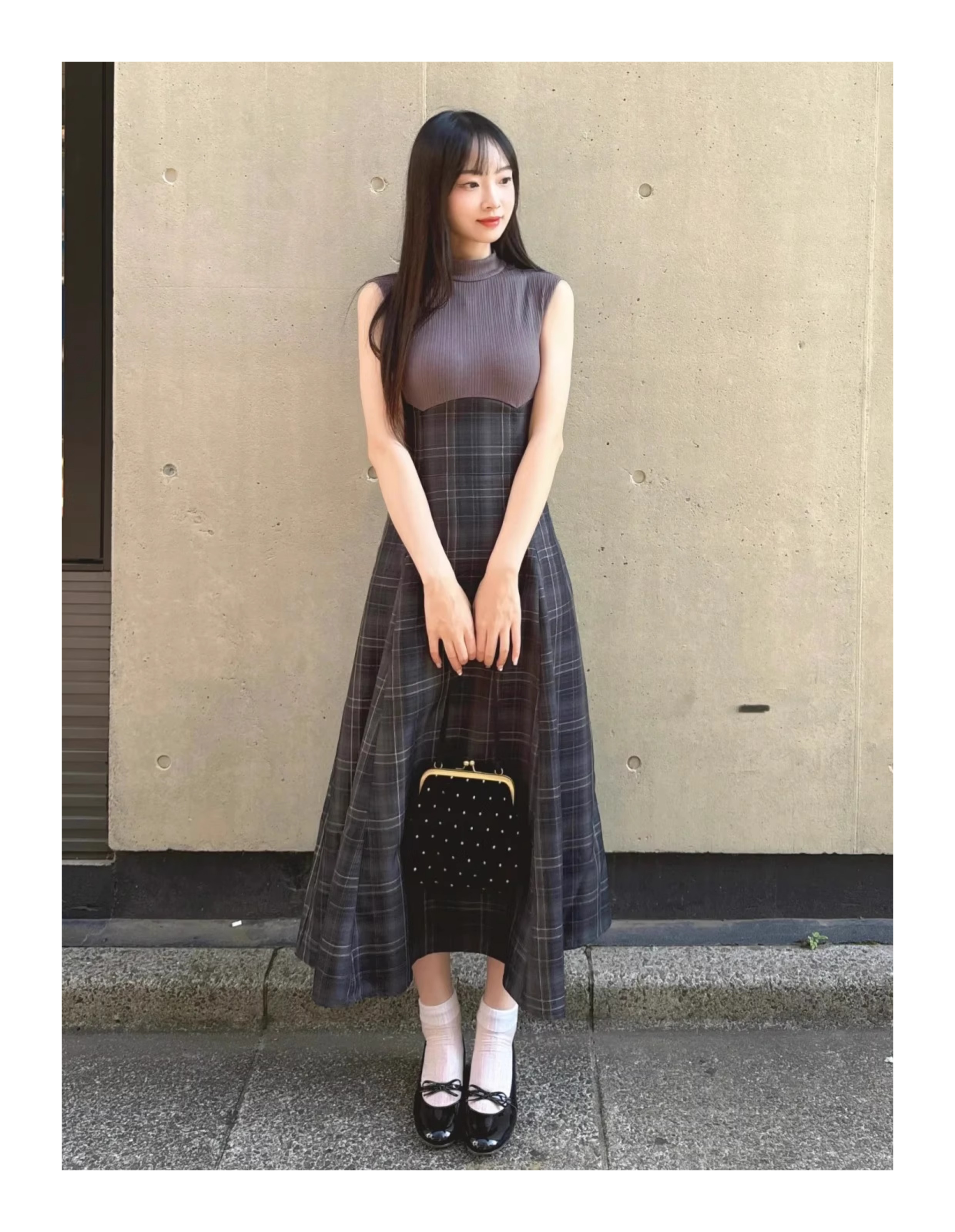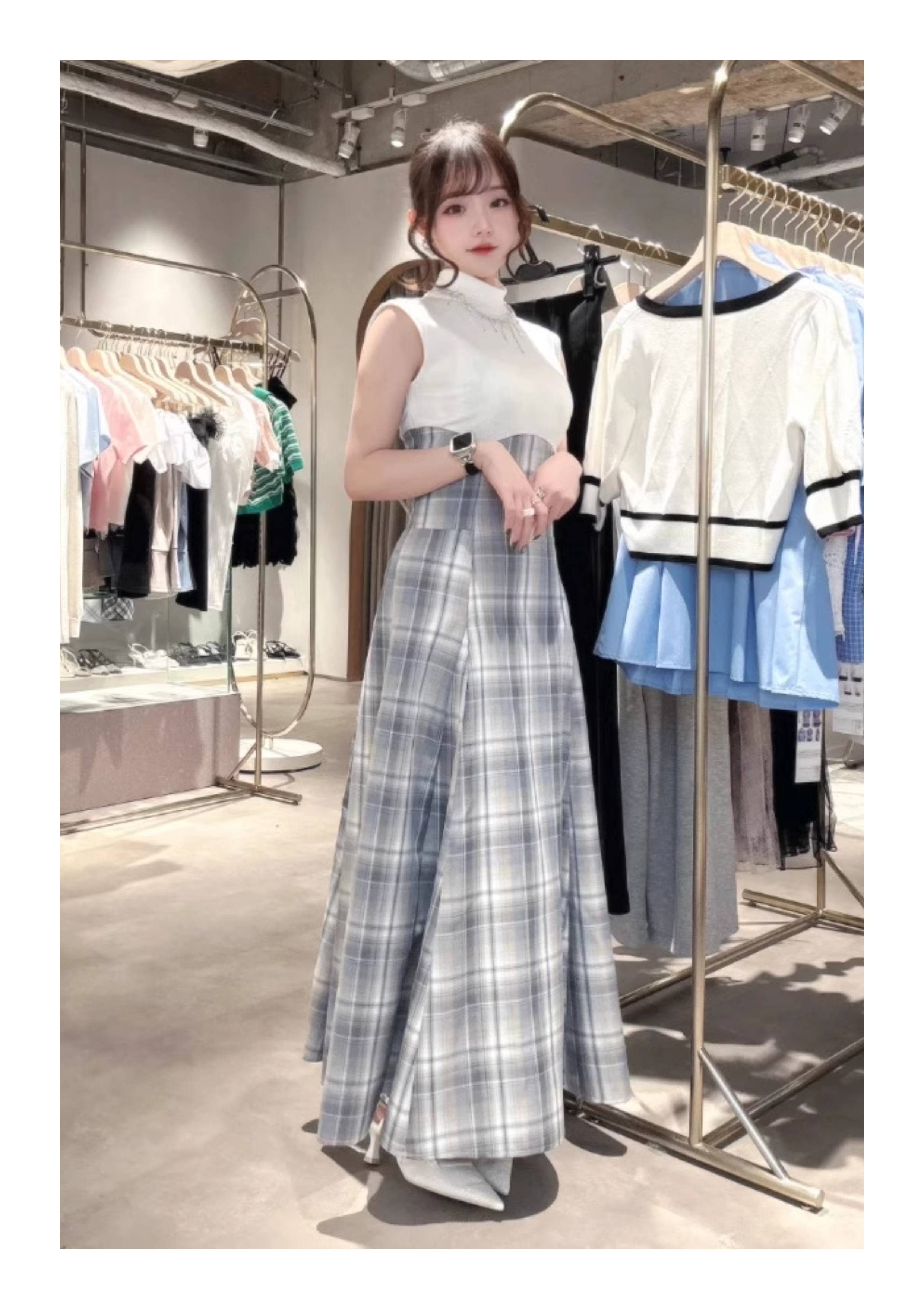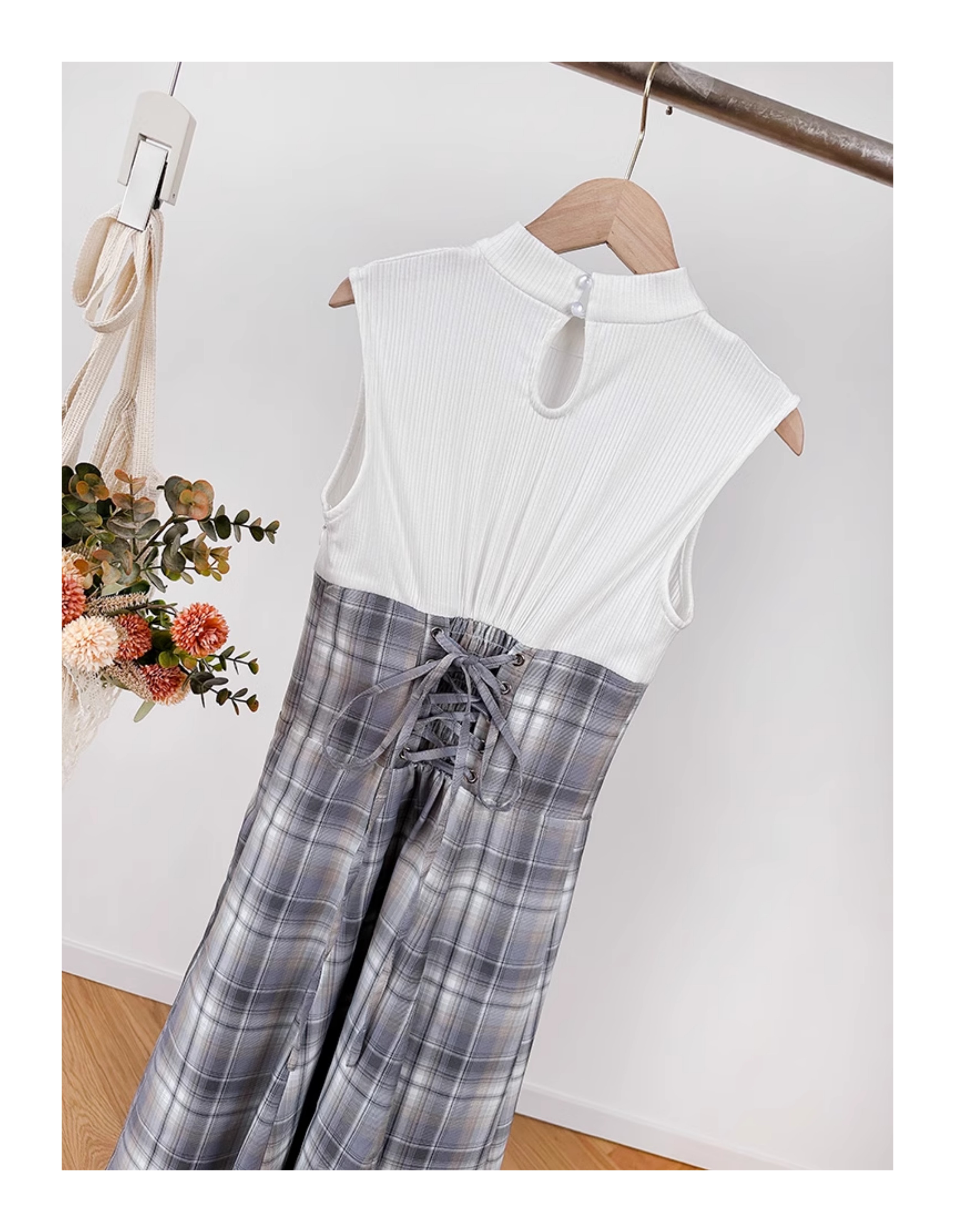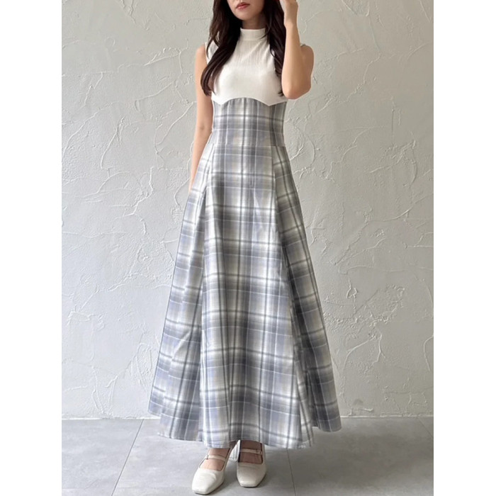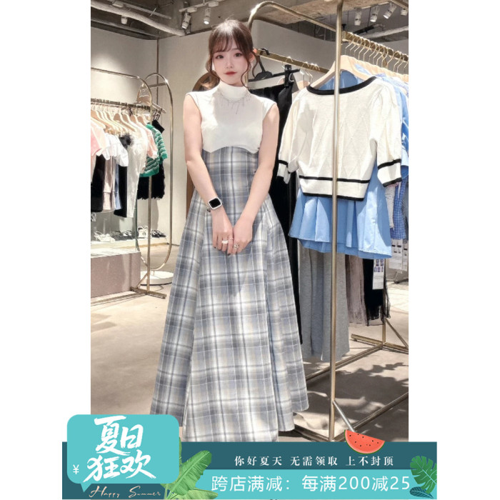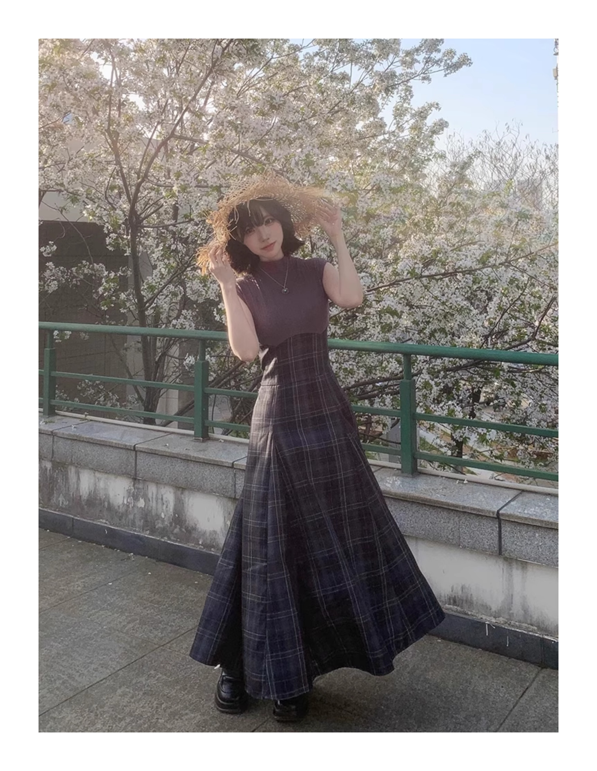 小泡芙日系春夏新款女裝時尚拼接無袖圓領格紋背心長款連衣裙女