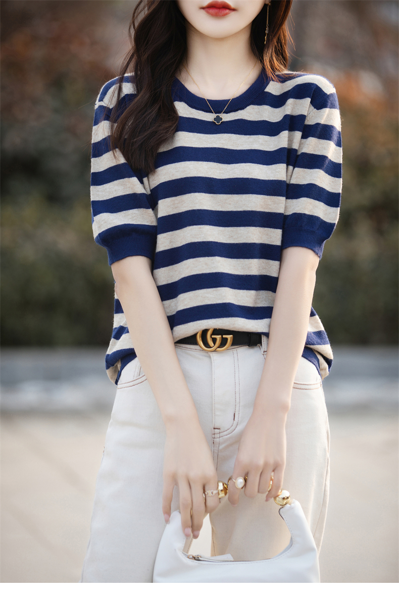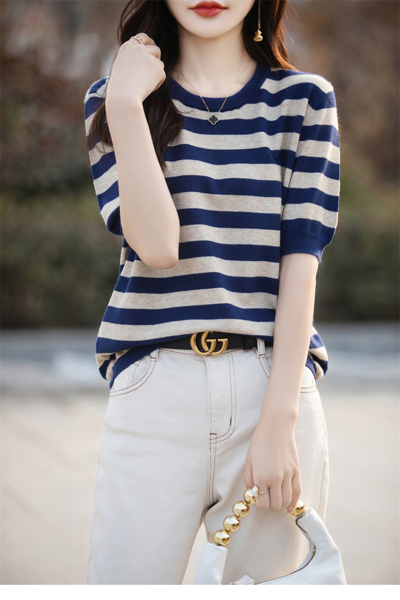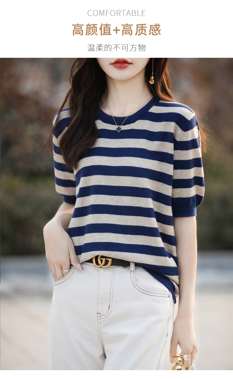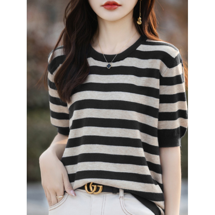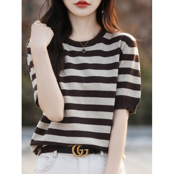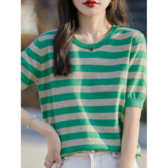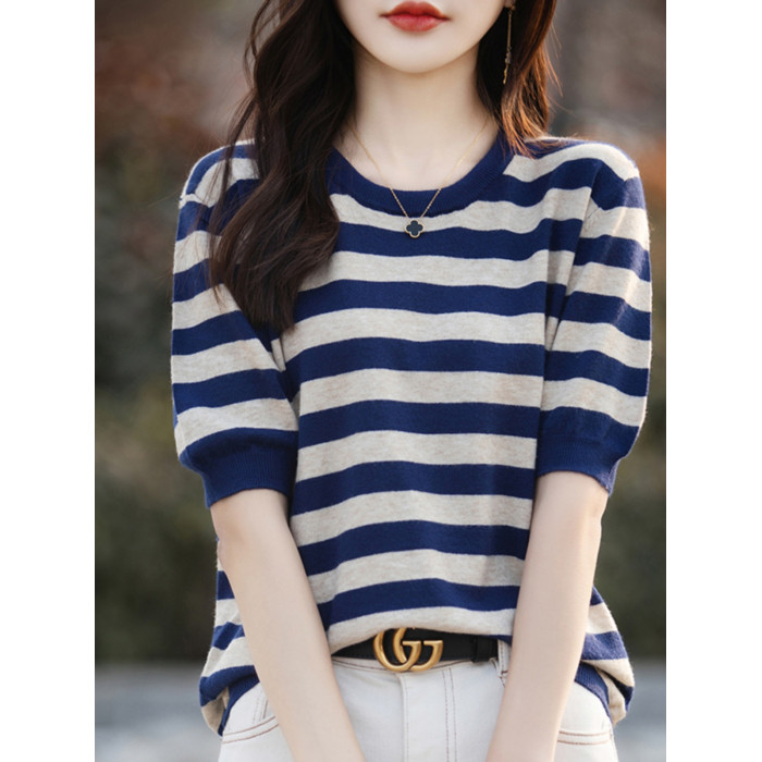 夏季新款條紋圓領短袖女寬松半袖薄款針織毛衣打底衫春秋季上衣