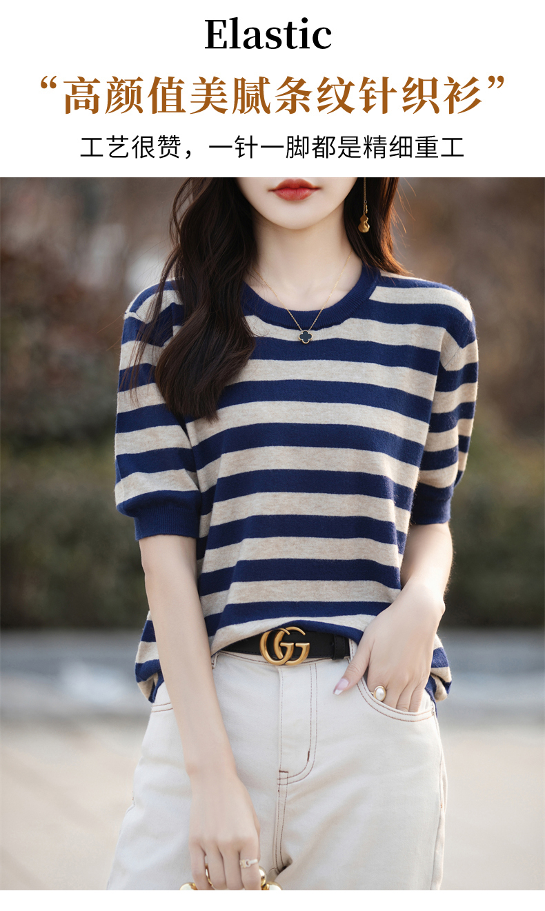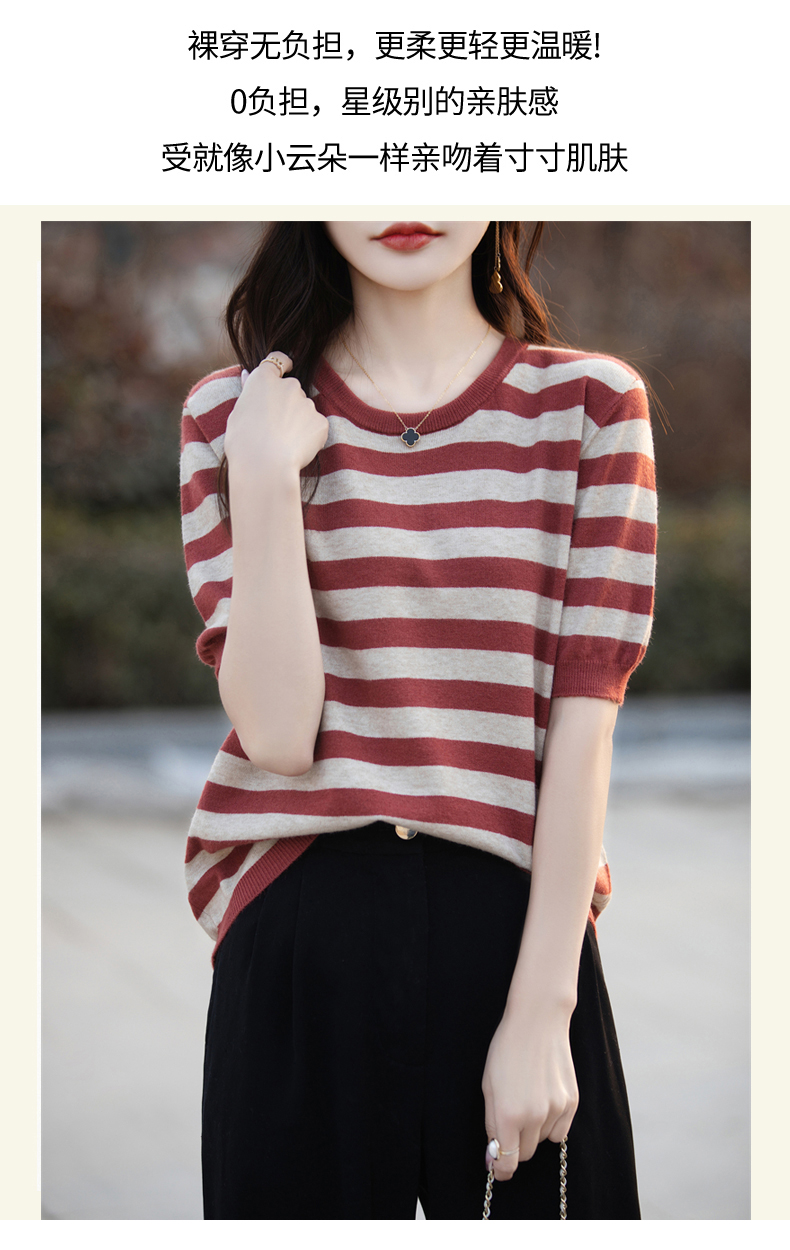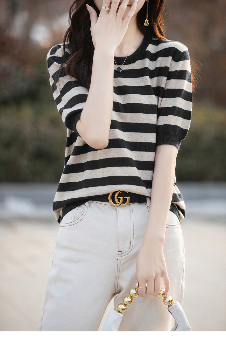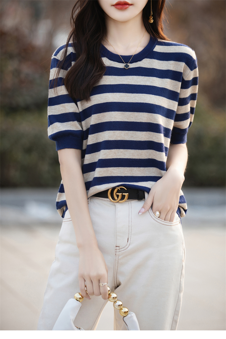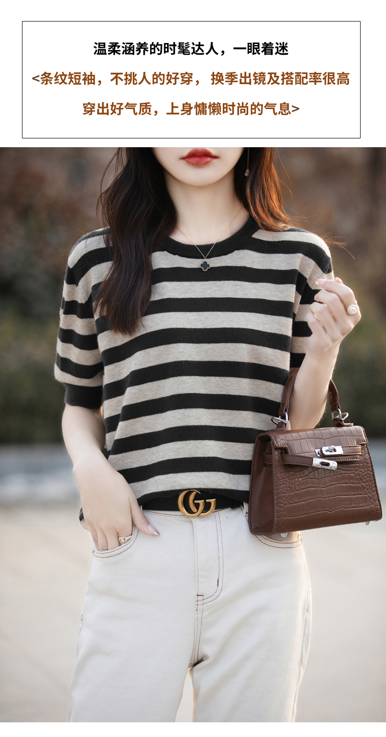 夏季新款條紋圓領短袖女寬松半袖薄款針織毛衣打底衫春秋季上衣