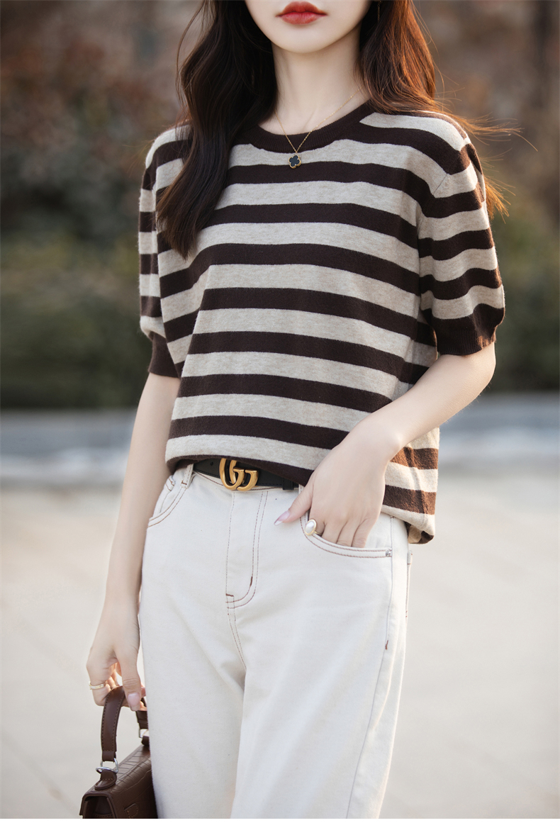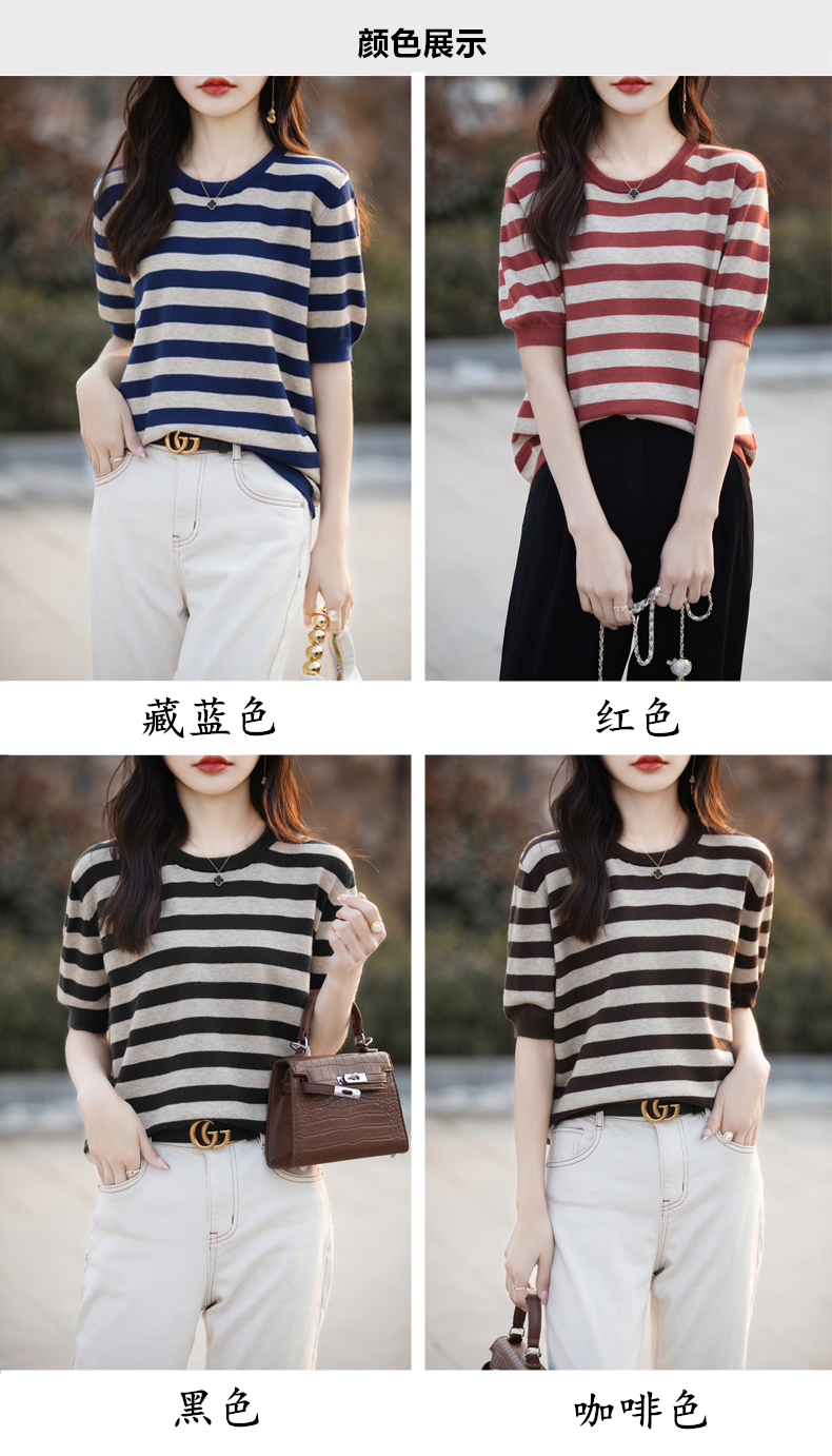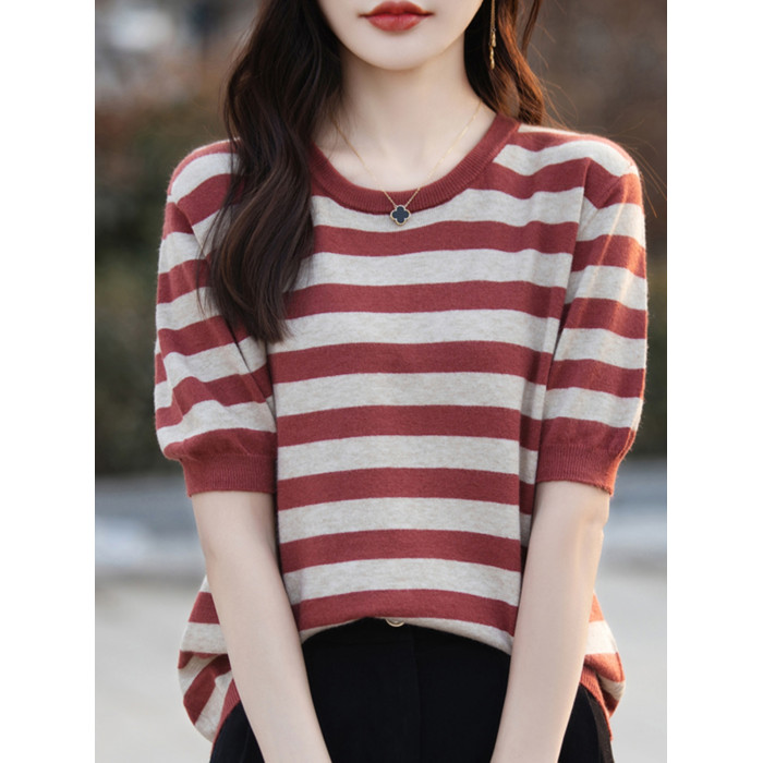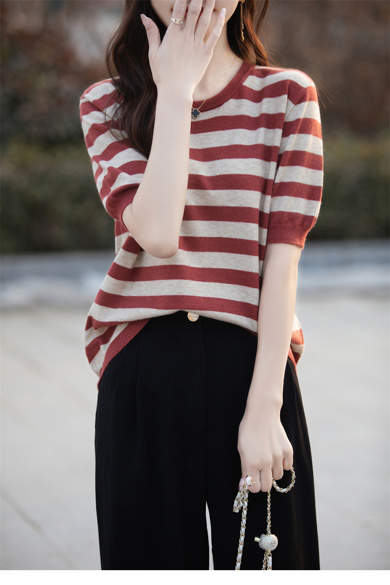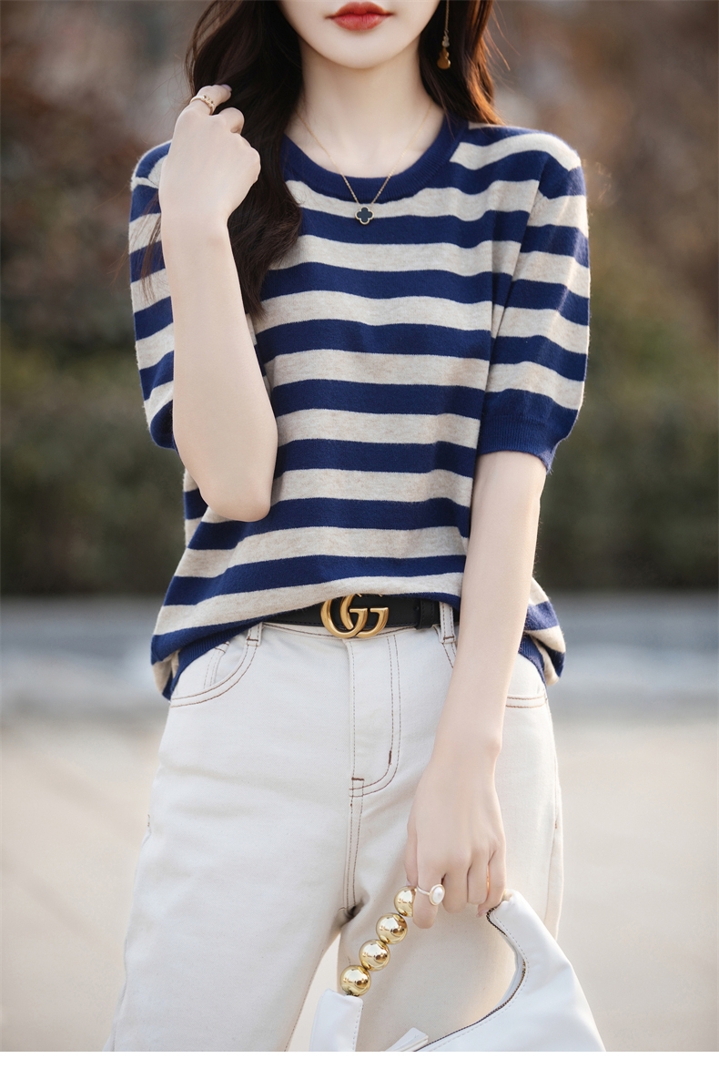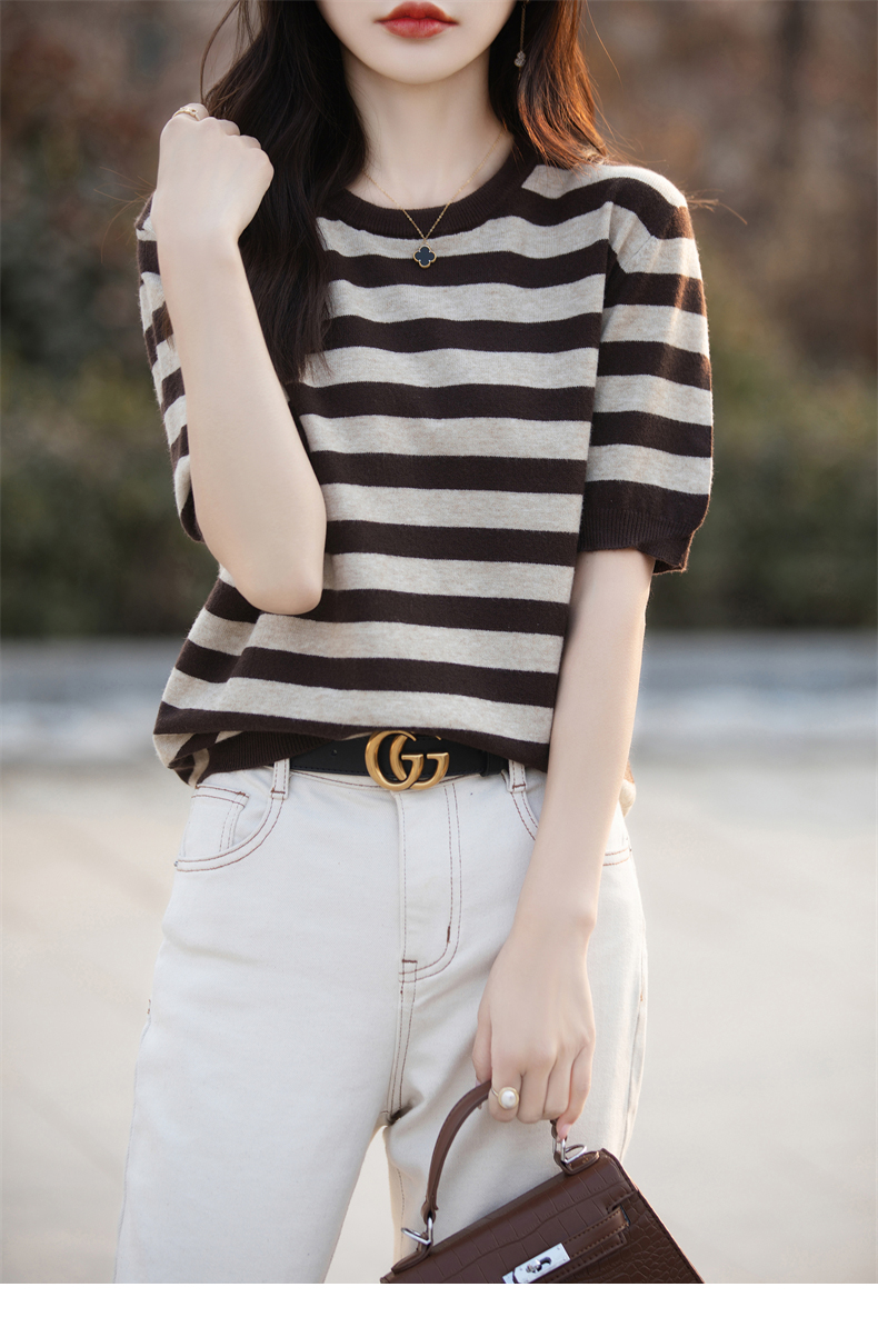 夏季新款條紋圓領短袖女寬松半袖薄款針織毛衣打底衫春秋季上衣