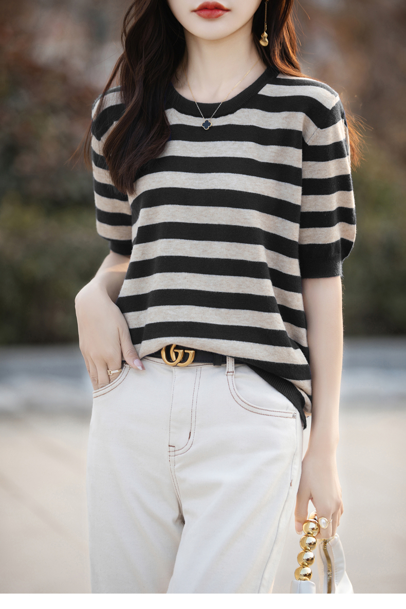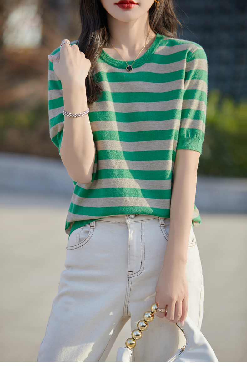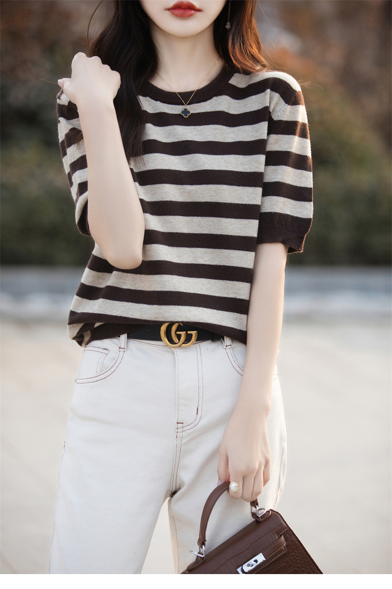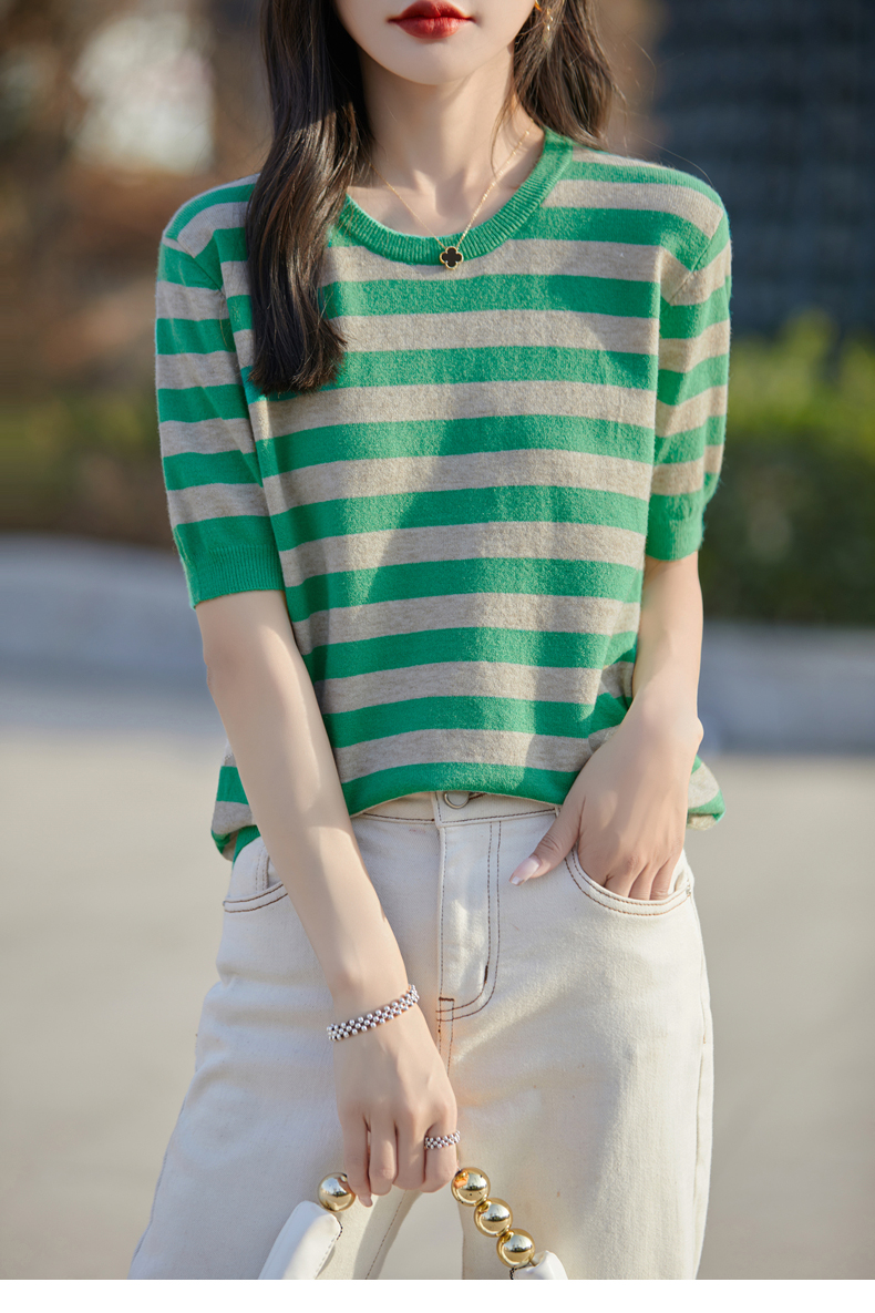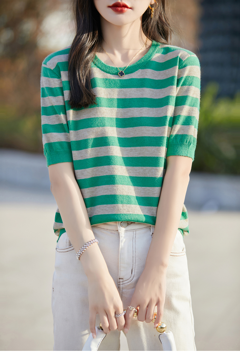 夏季新款條紋圓領短袖女寬松半袖薄款針織毛衣打底衫春秋季上衣