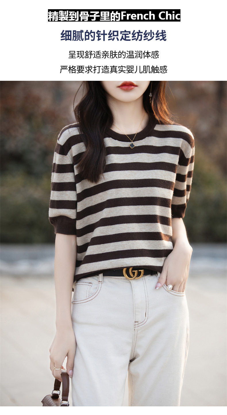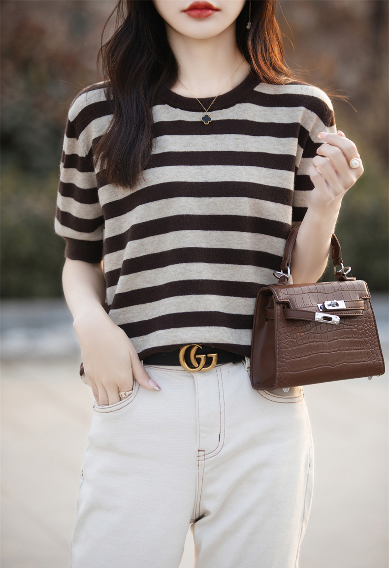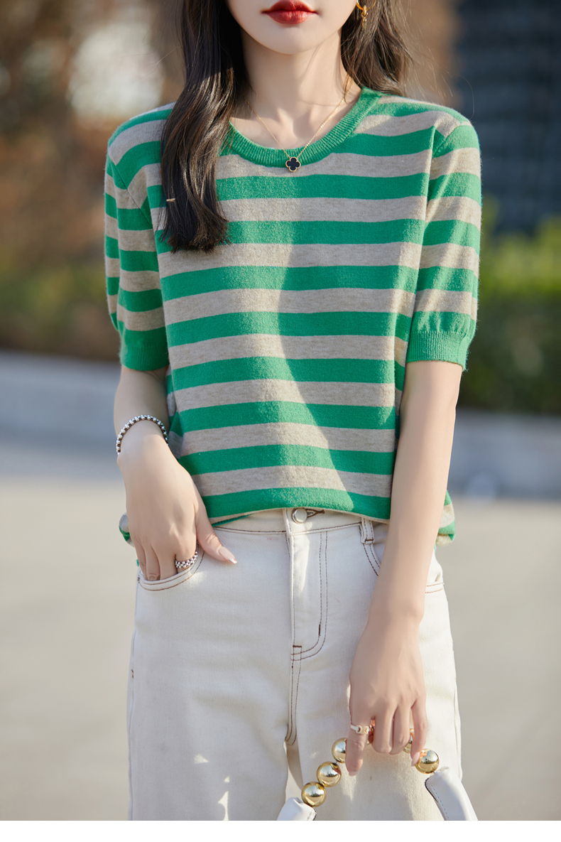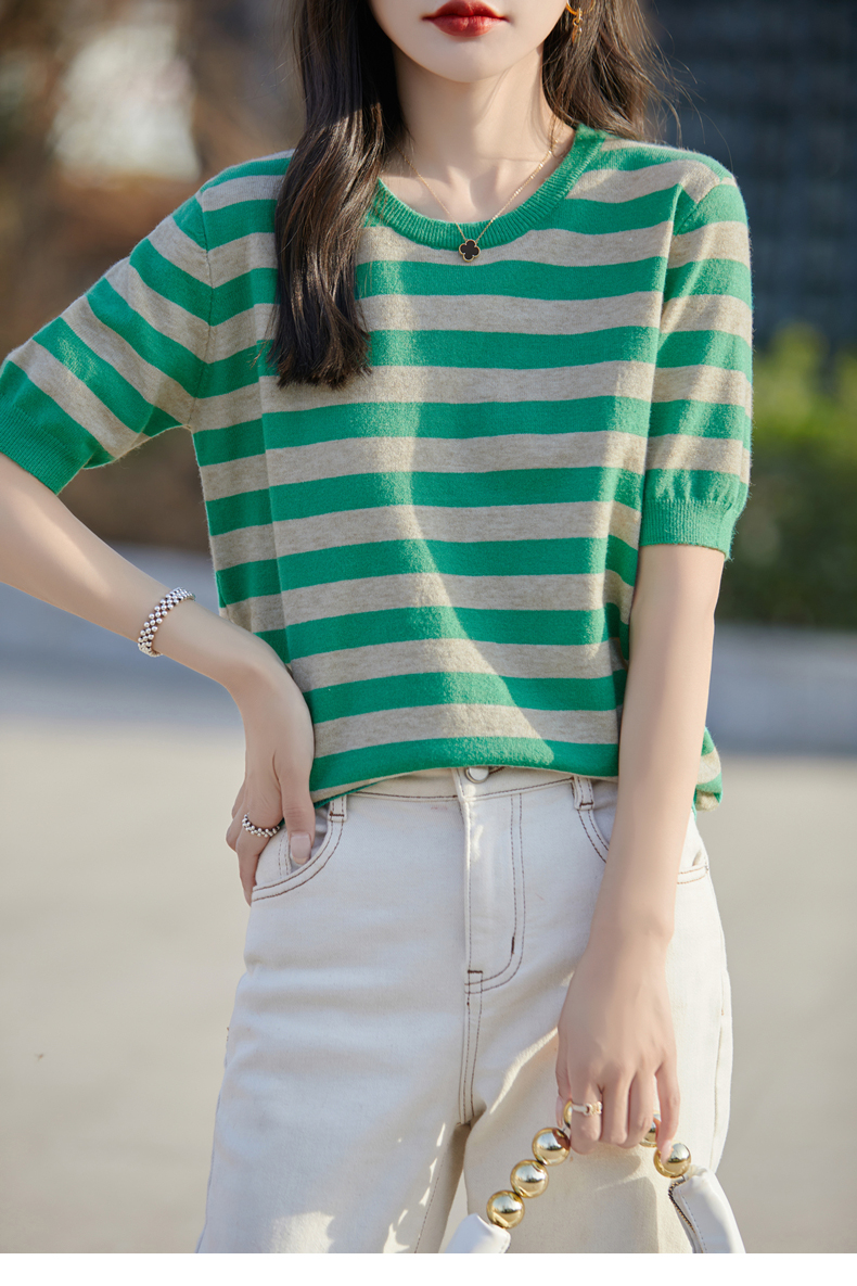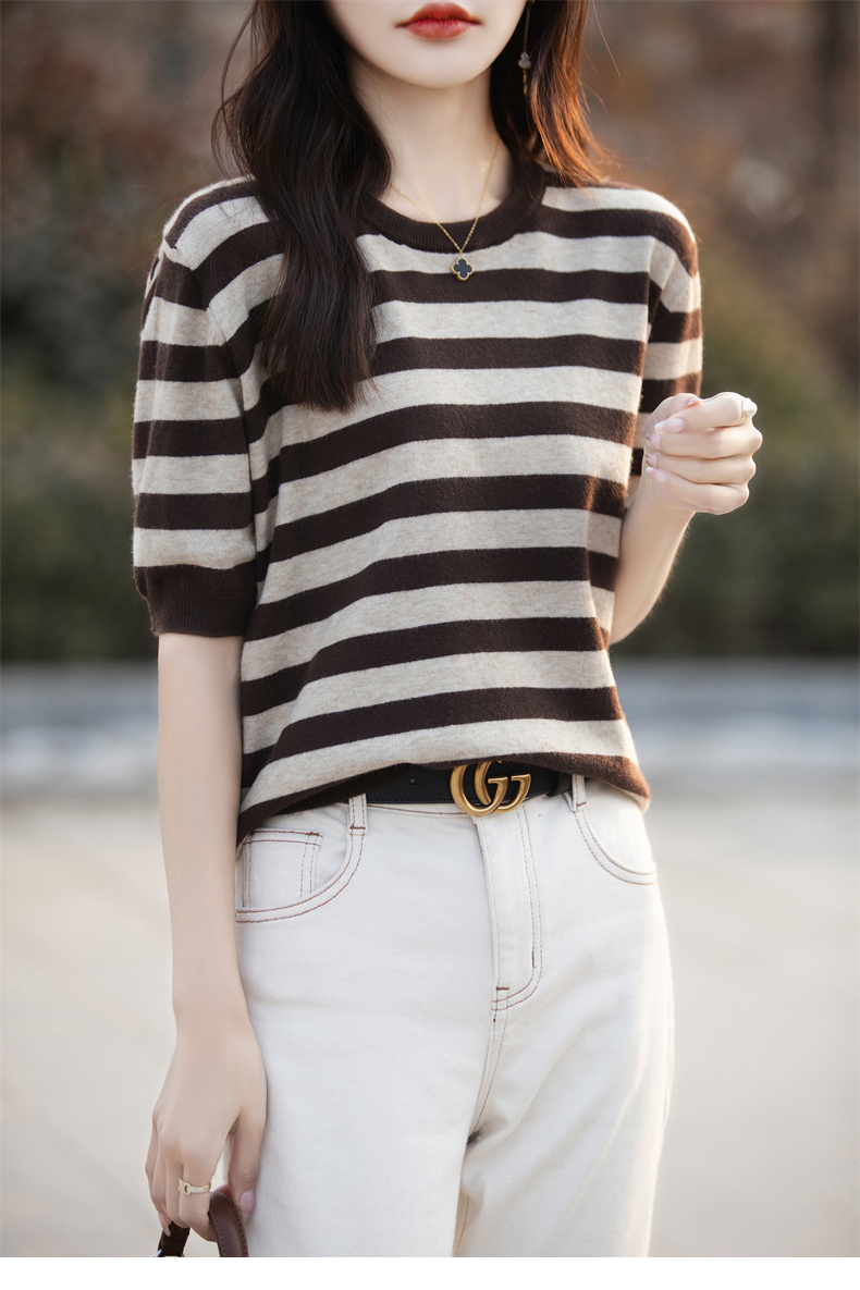 夏季新款條紋圓領短袖女寬松半袖薄款針織毛衣打底衫春秋季上衣