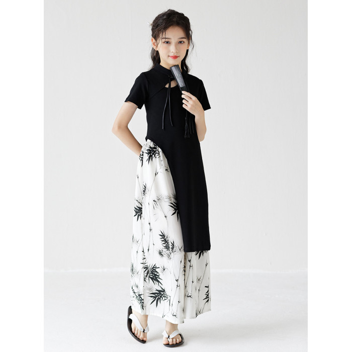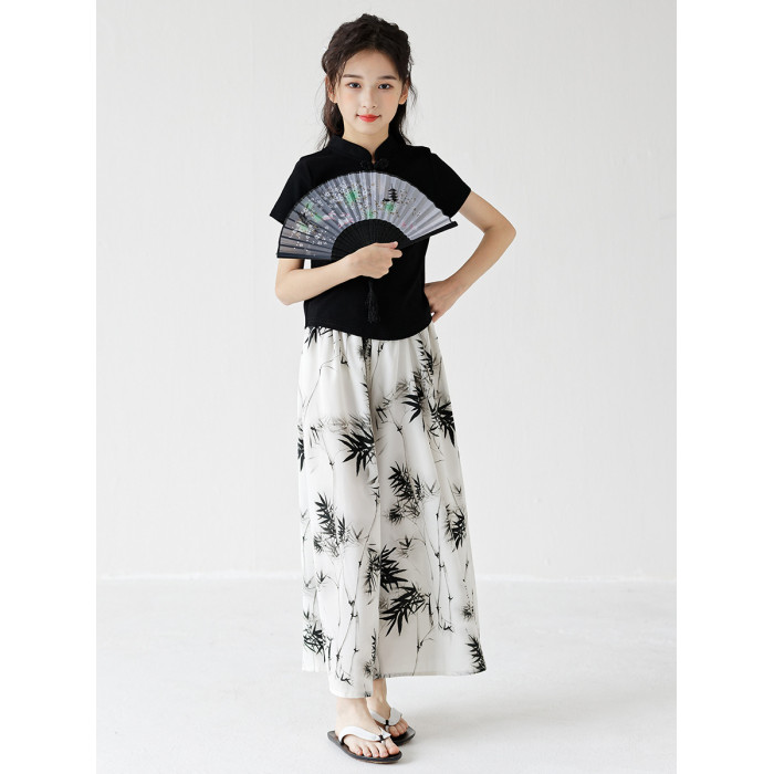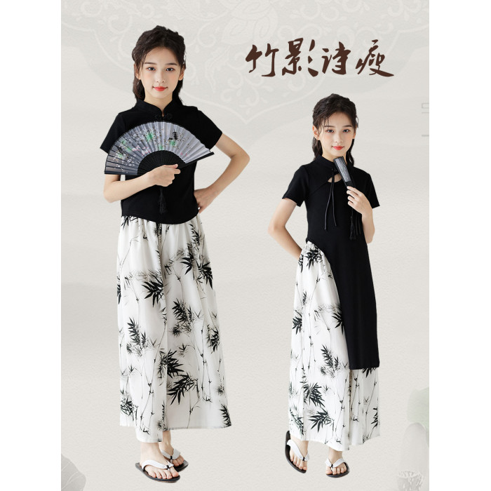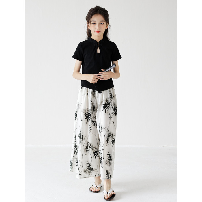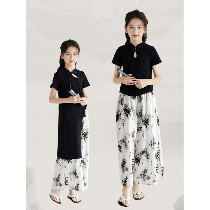 女童套裝新中式濶腿褲2025夏新款女大童漢服國風夏裝親子裝兩件套