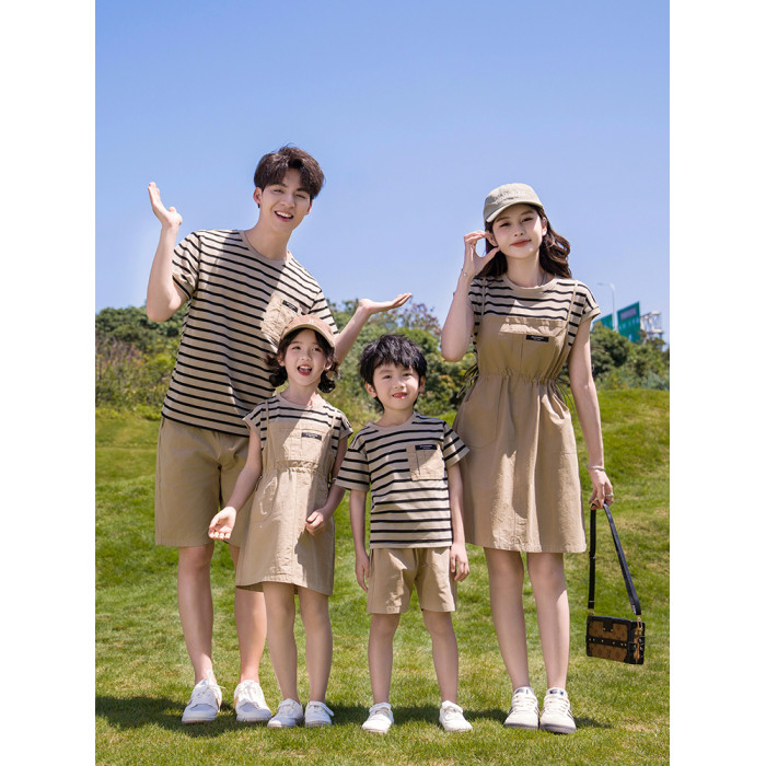 高級親子裝一家三口四口短袖夏裝母子全家款夏季多巴胺母女連衣裙