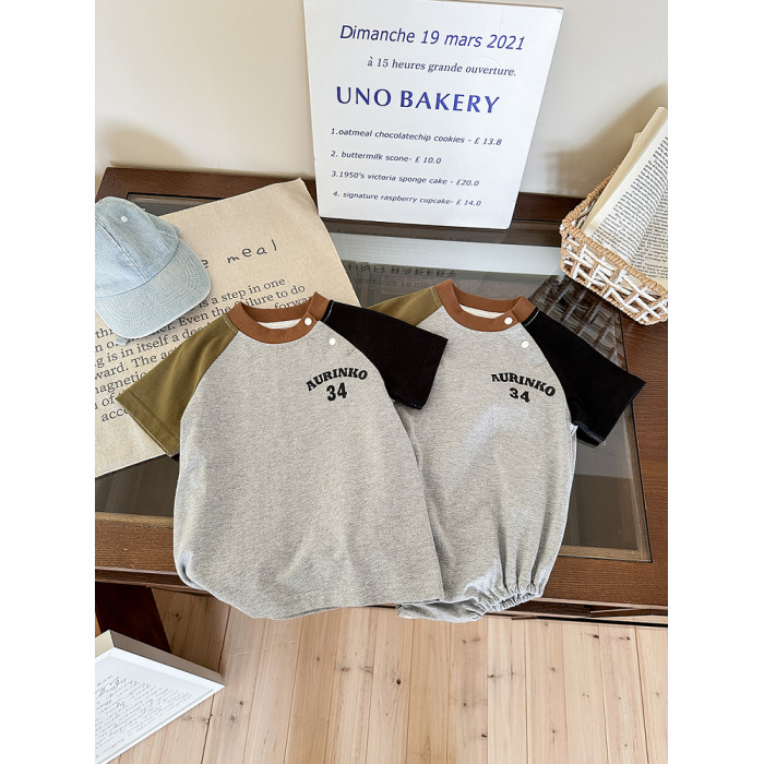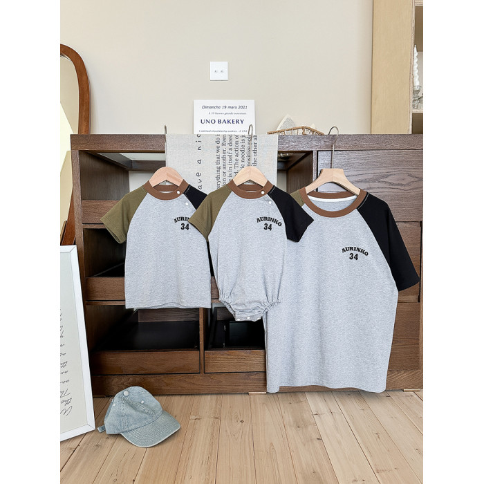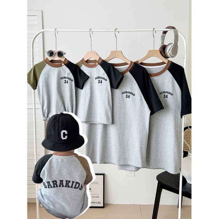 親子裝一家三口插肩袖美式夏裝拼色男童短袖柔軟百搭母女母子T恤