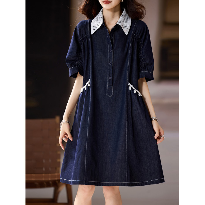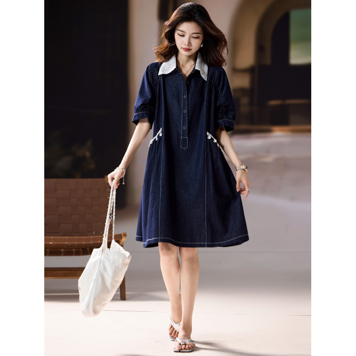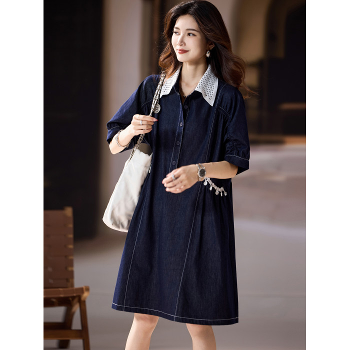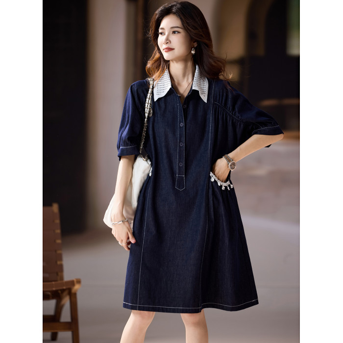 素木翻領拼接牛仔連衣裙女夏季2025年新款寬松裙子歐洲站大碼女裝