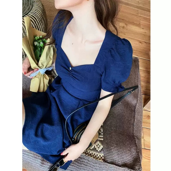 粉色甜美泡泡袖圓領連衣裙女2025夏季新款松弛感獨特漂亮收腰長裙