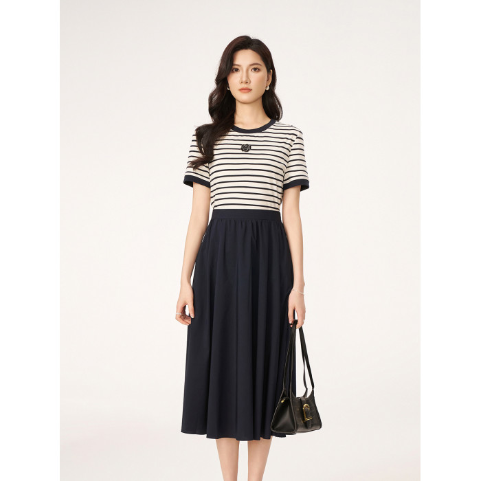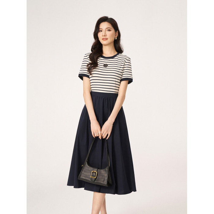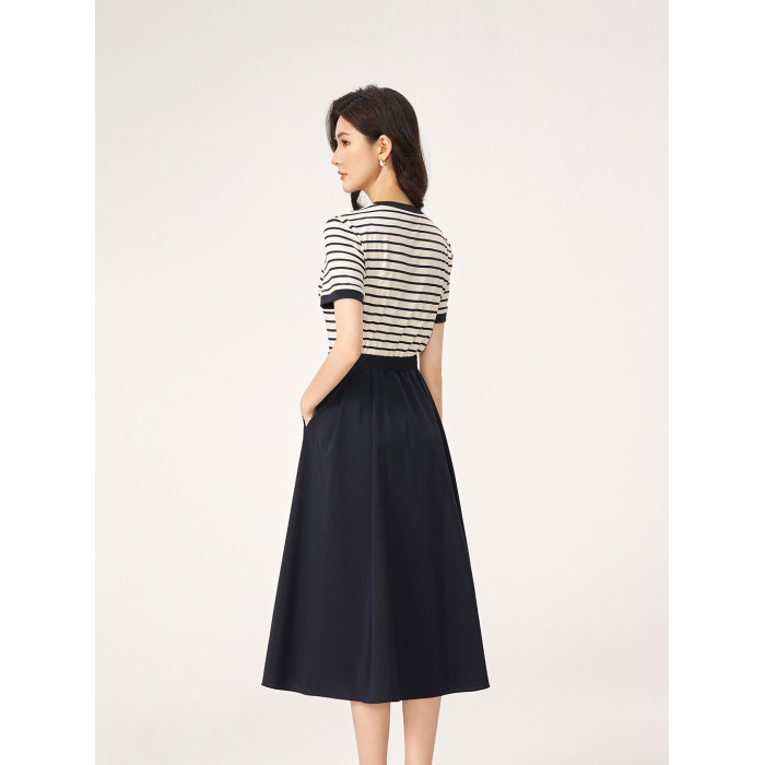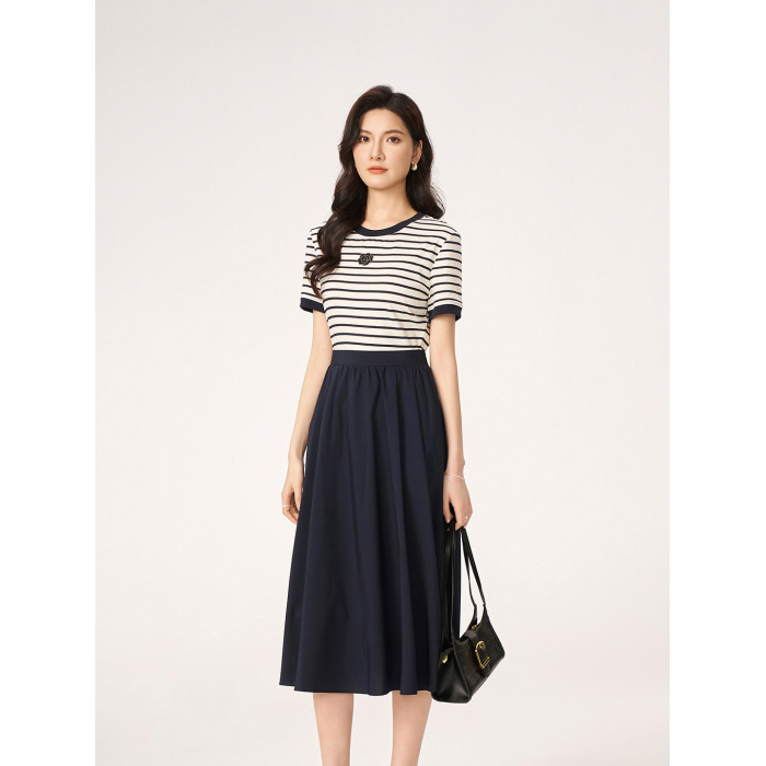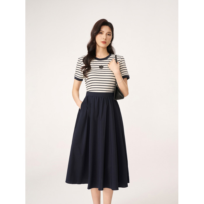 2025夏季新款商場同款法式輕奢高級感休閒條紋假兩件短袖連衣裙女
