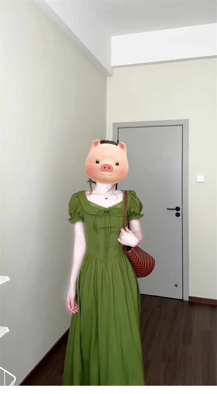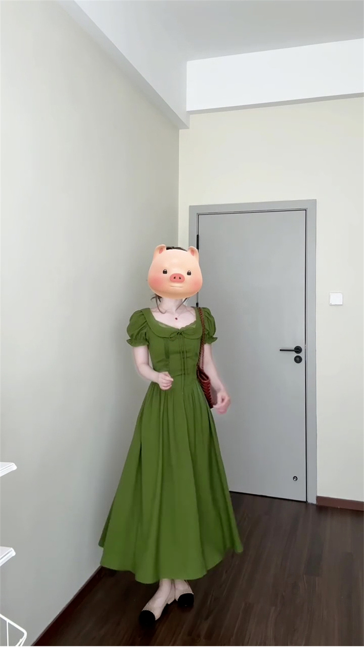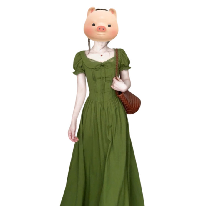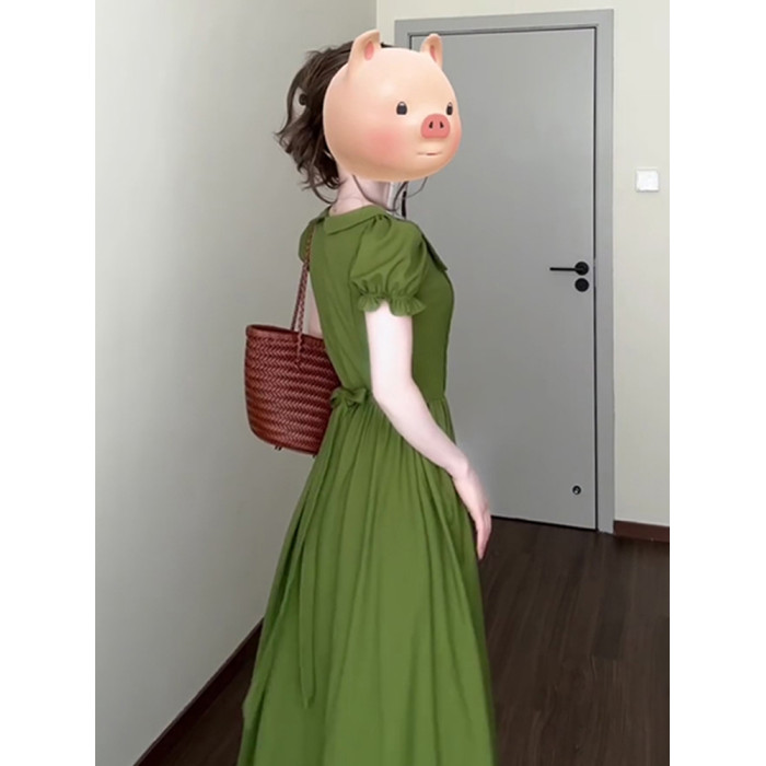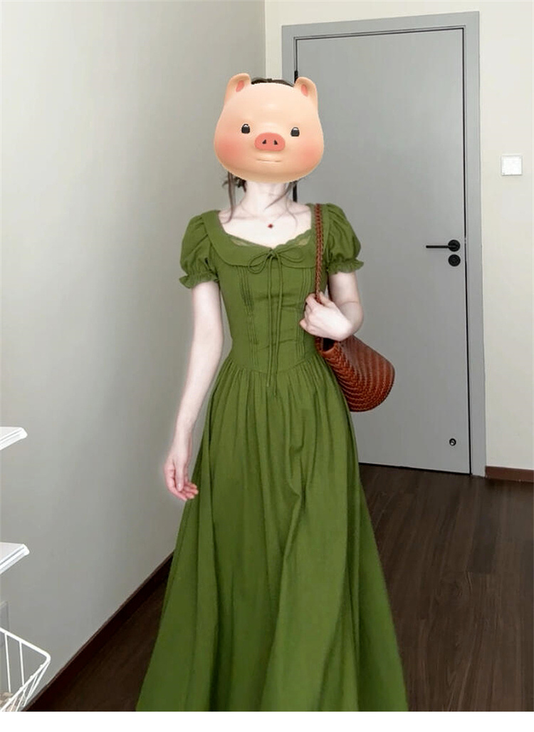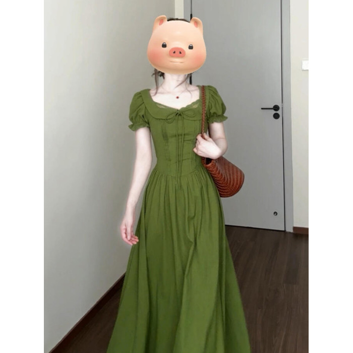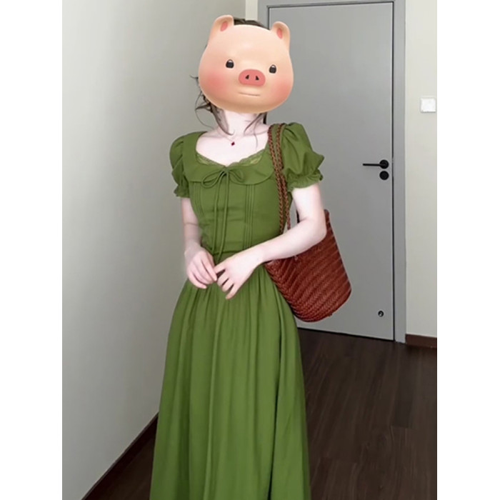 法式復古綠色收腰連衣裙子女裝夏季2025新款今年流行爆款氣質長裙
