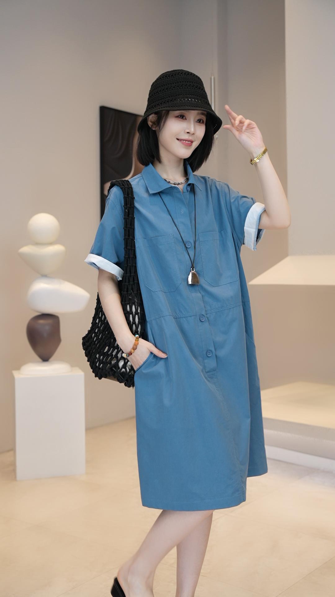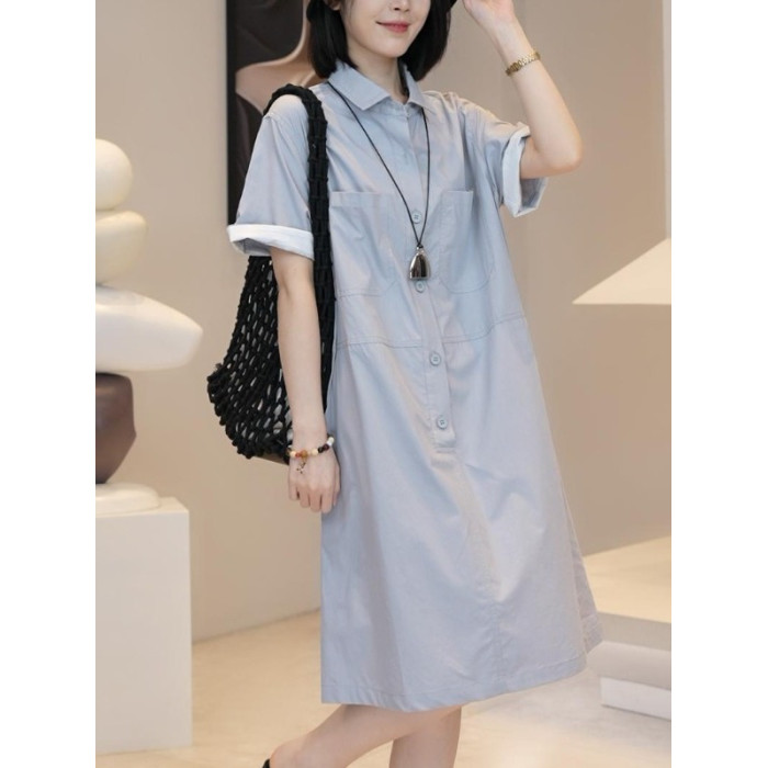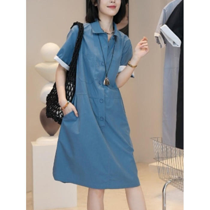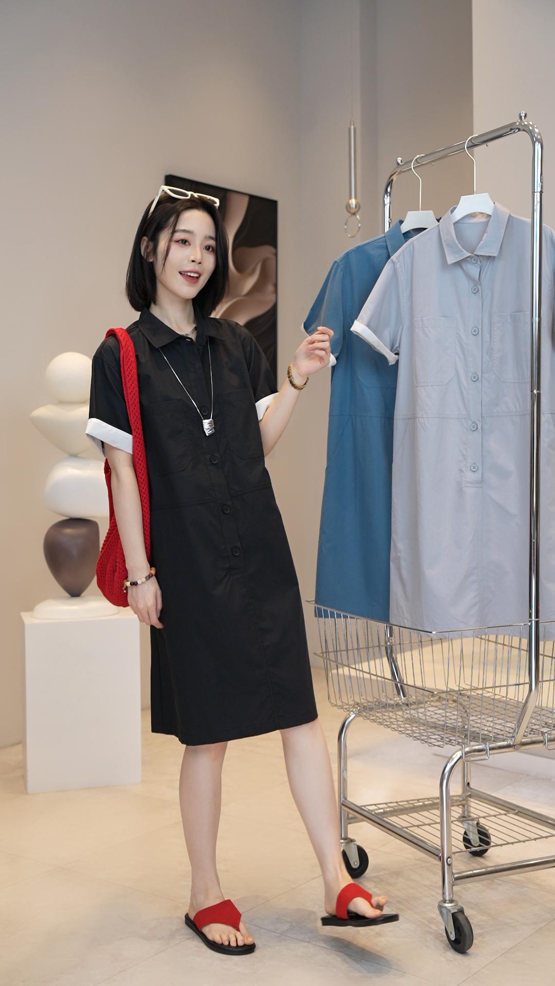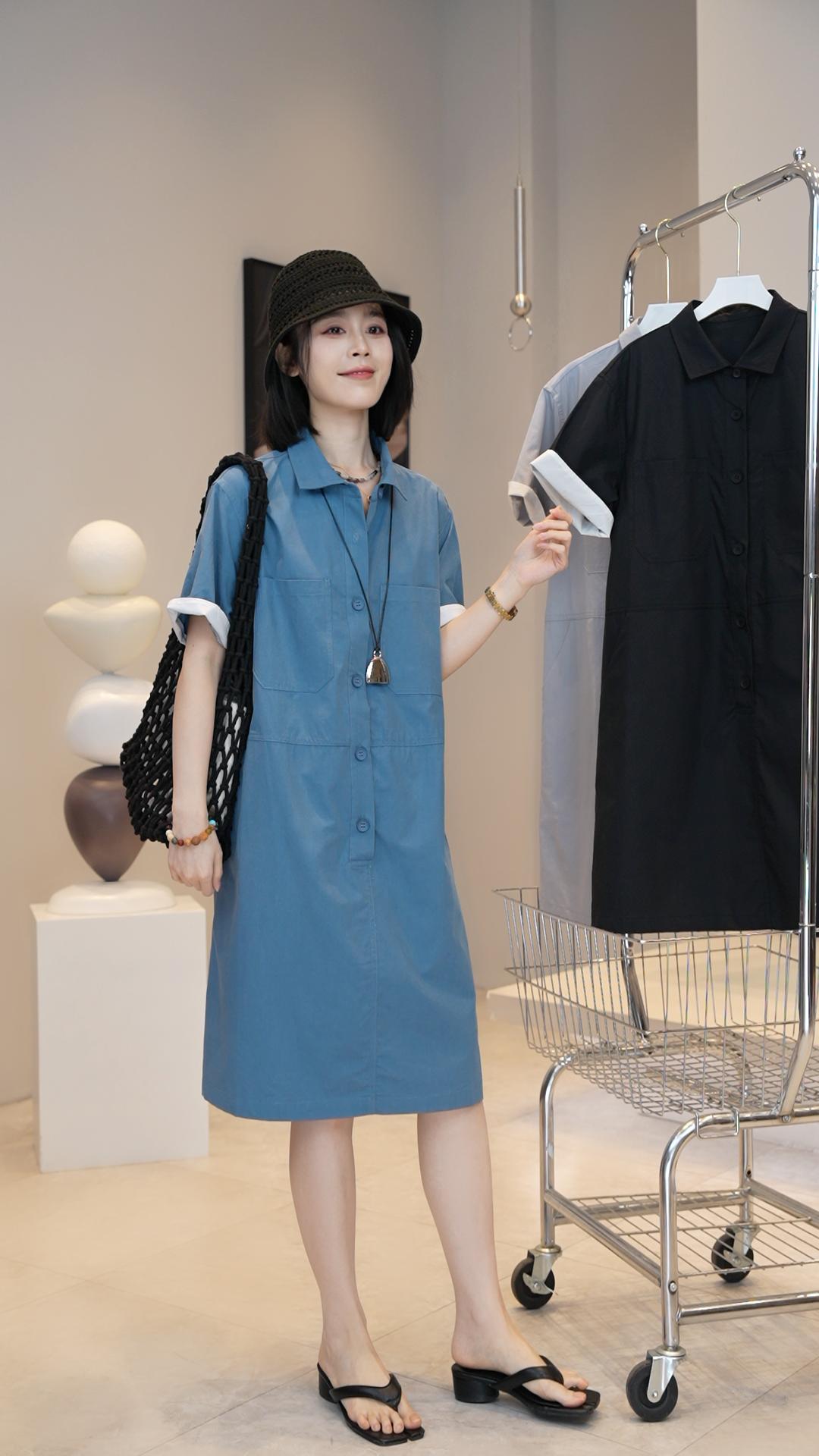 法式polo領短袖襯衫連衣裙女夏季寬松休閒連身裙小個子工裝直筒裙