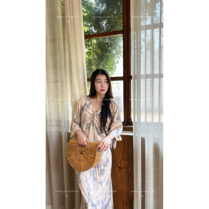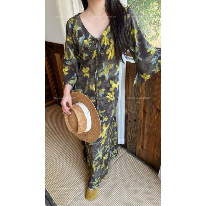 【朝花夕拾】HL棉綢夏季短袖氣質國風女神寬松時尚顯瘦長款連衣裙