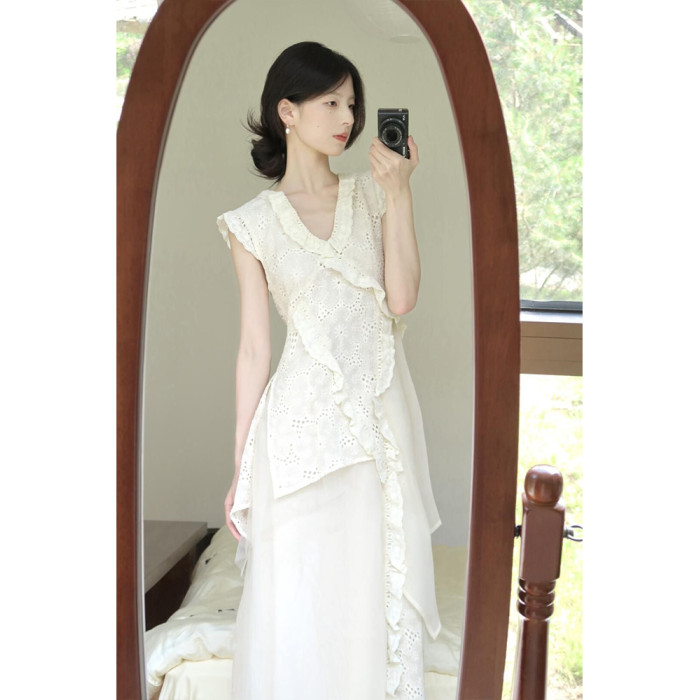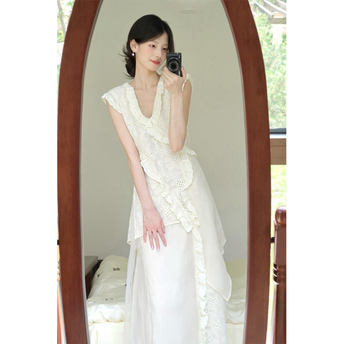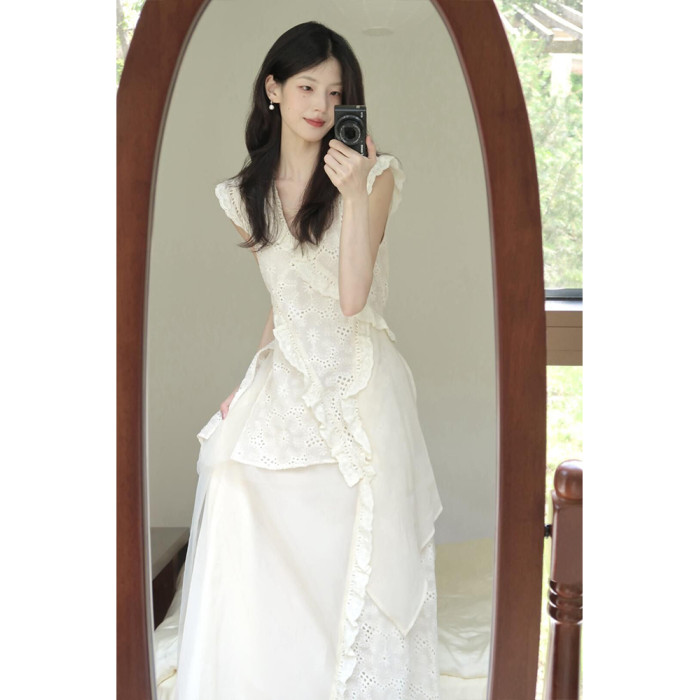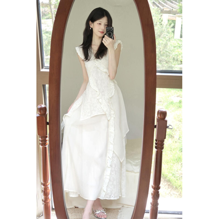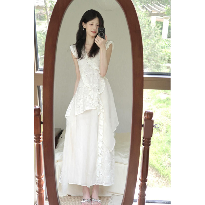 夏季新款法式高級感白色小飛袖連衣裙小個子溫柔風仙女a字長裙子