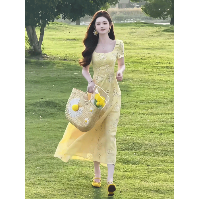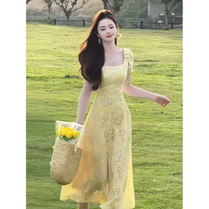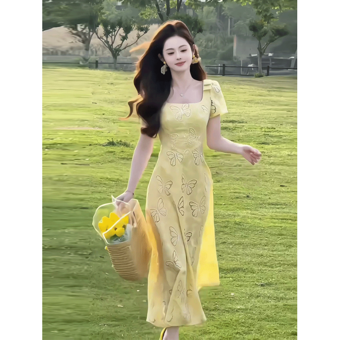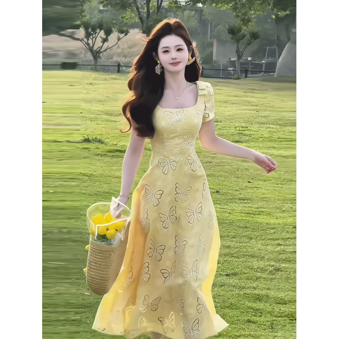 法式方領提花蝴蝶鏤空短袖連衣裙女2025夏季新款收腰顯瘦氣質長裙