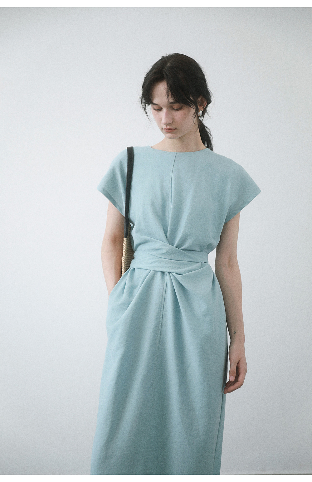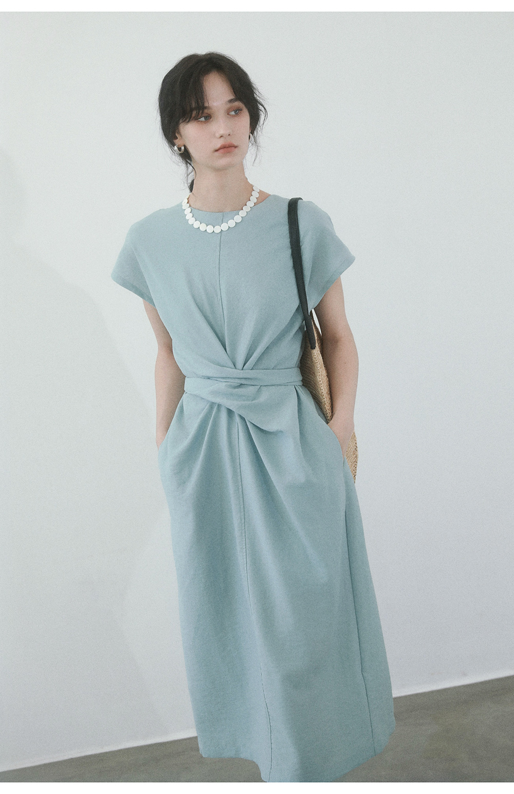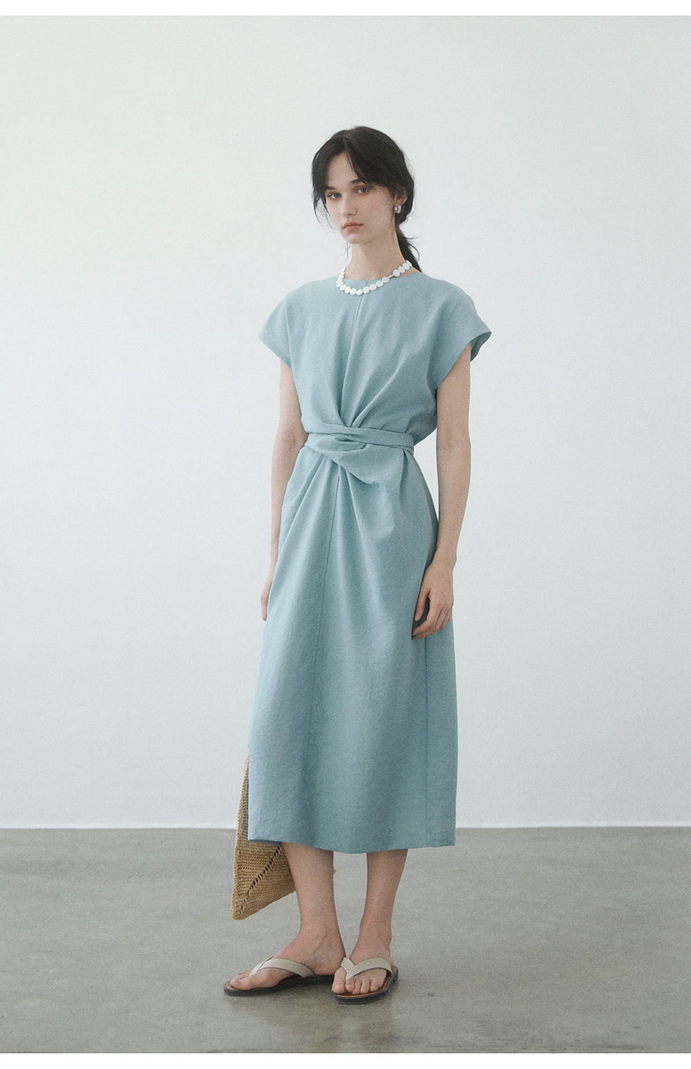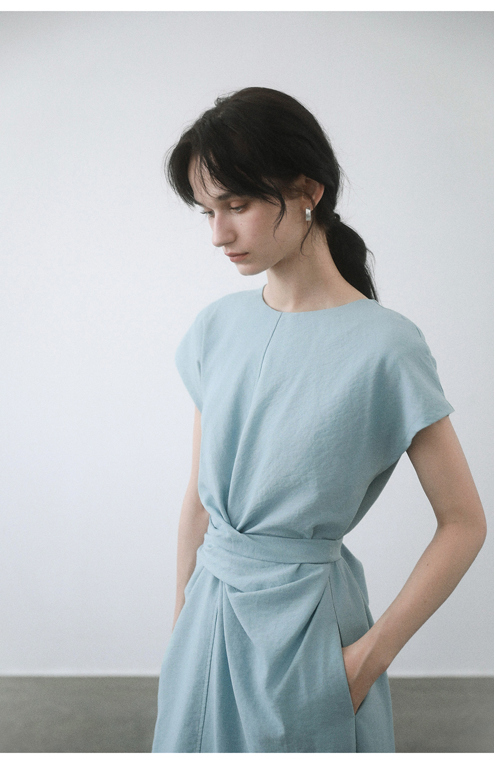 InPoet英珀 2025夏【亞麻】棉風信藍扭結綁帶連衣裙 簡約優雅淡人