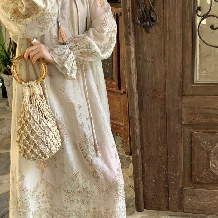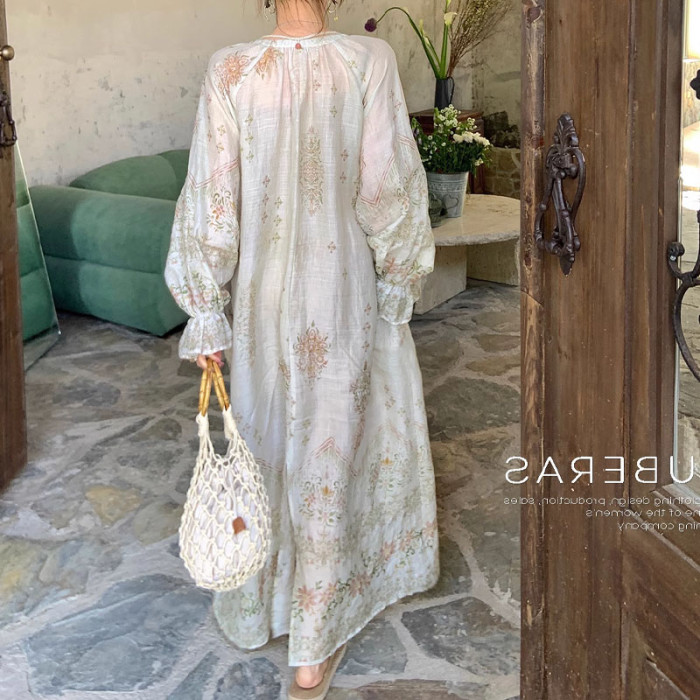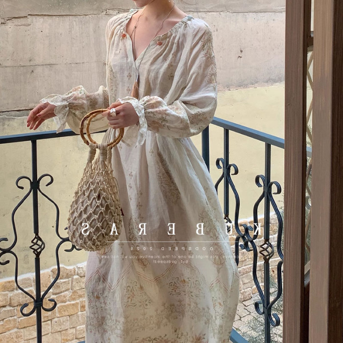 天絲麻植物暈染長袖寬松V領連衣裙女夏季休閒氣質復古印花A字長裙