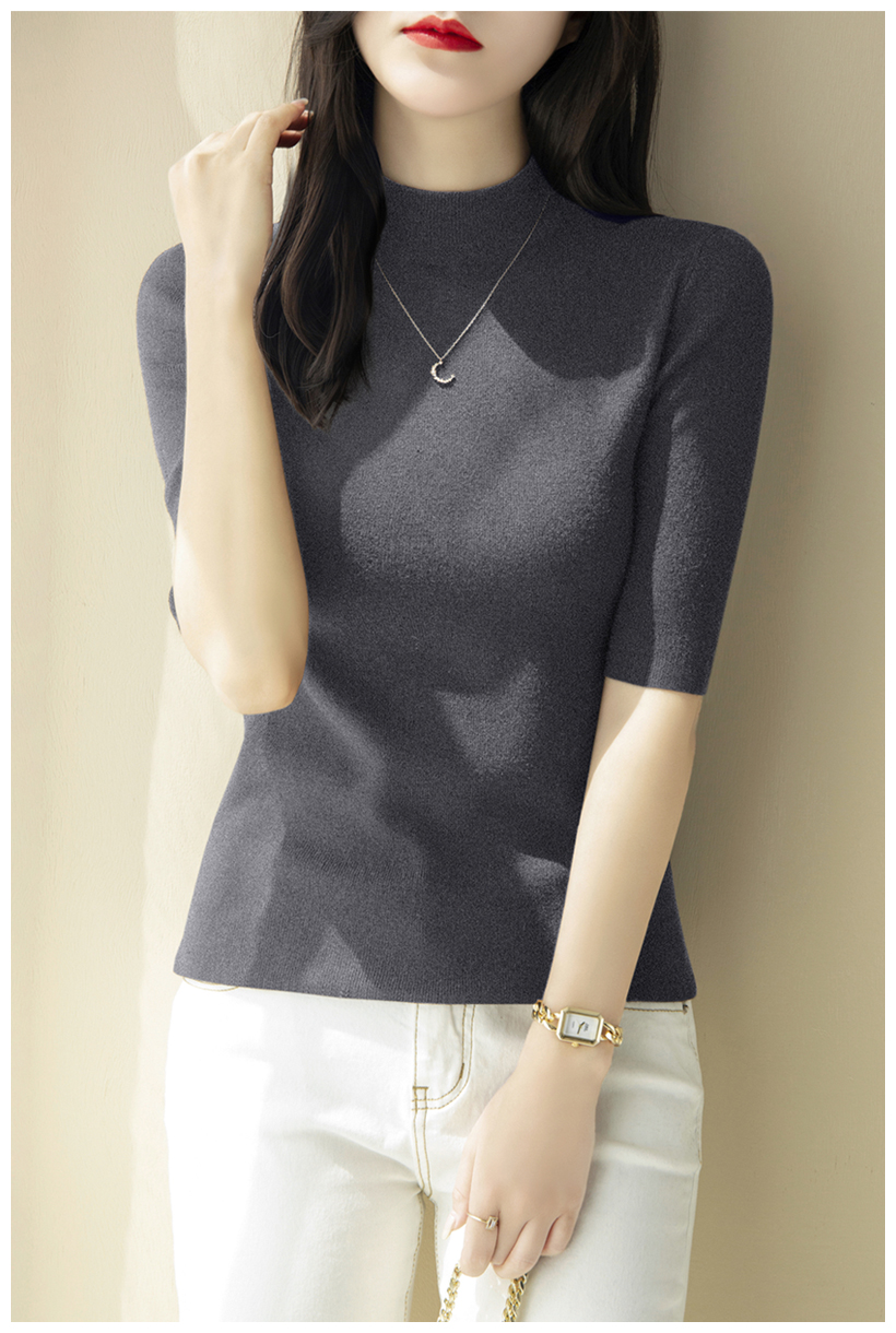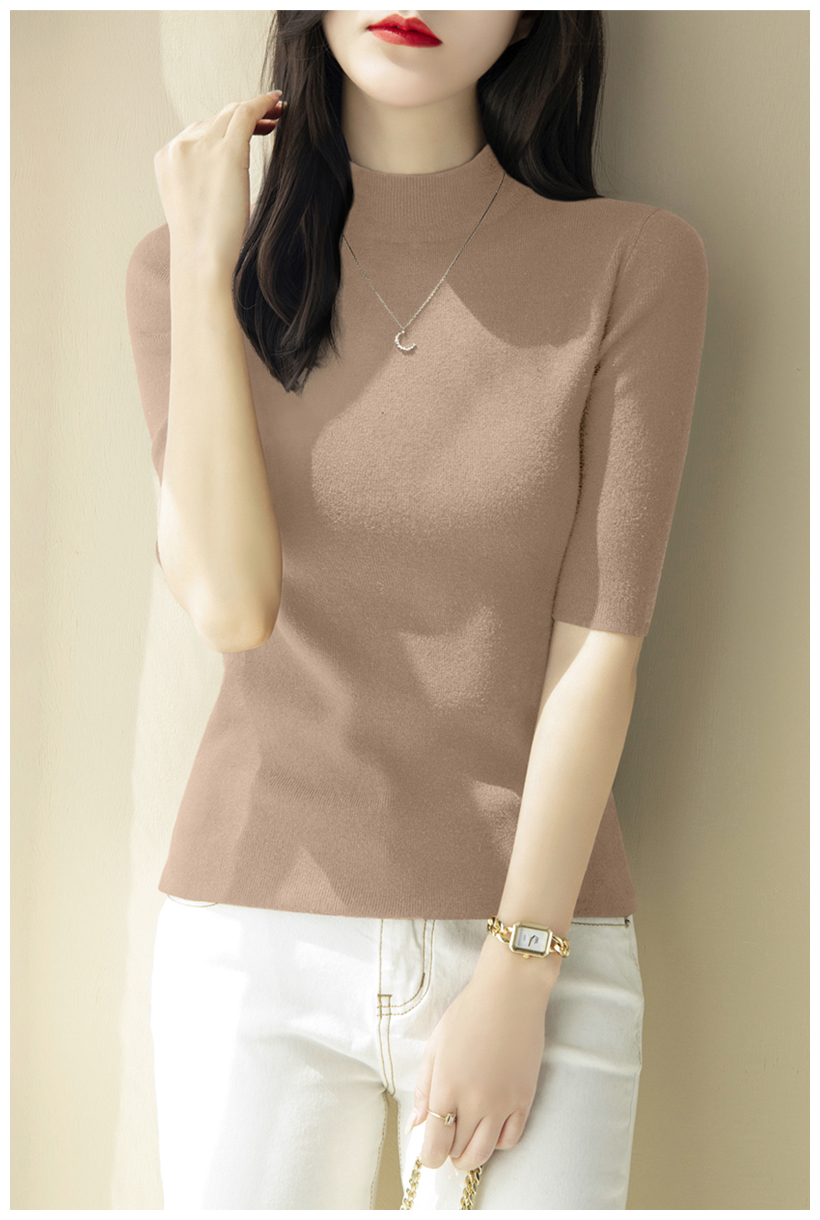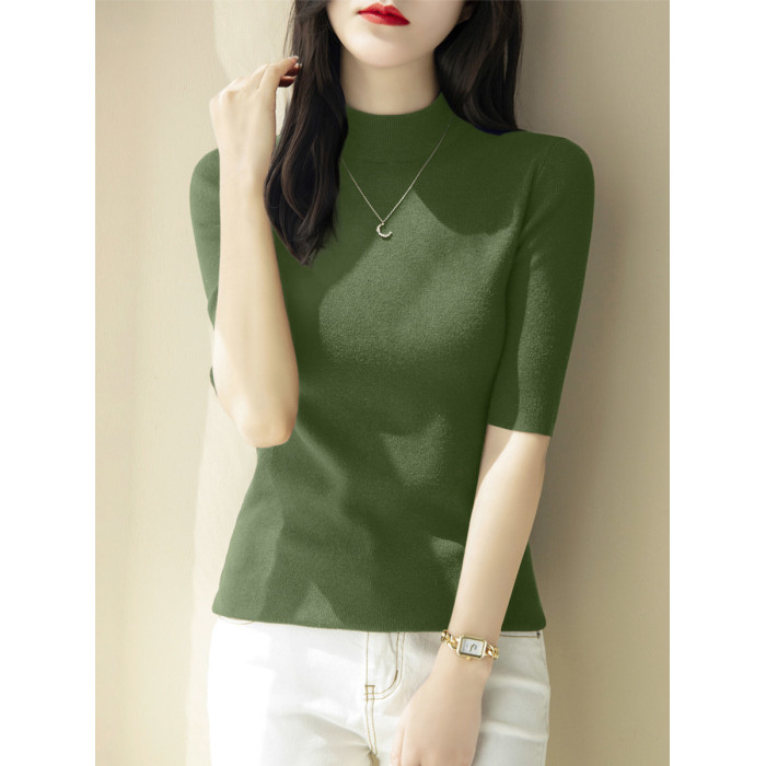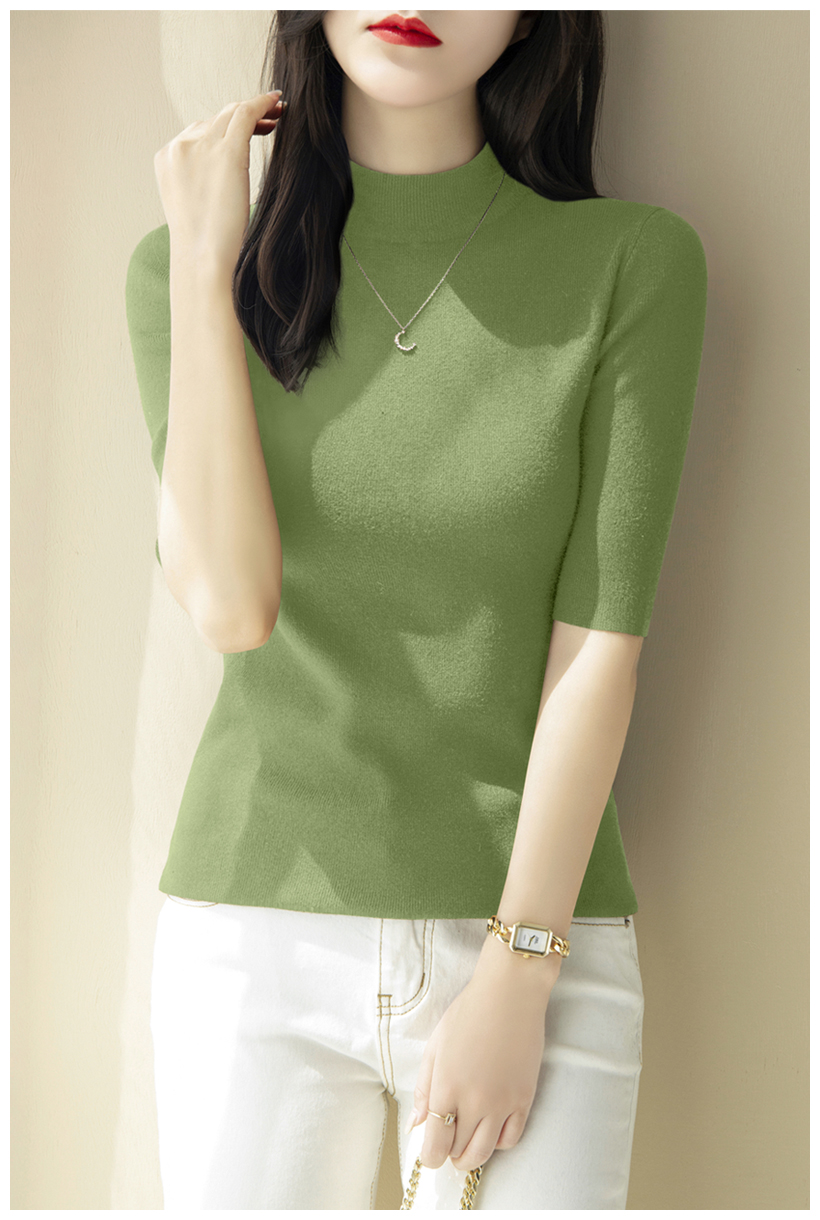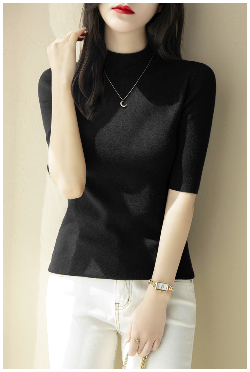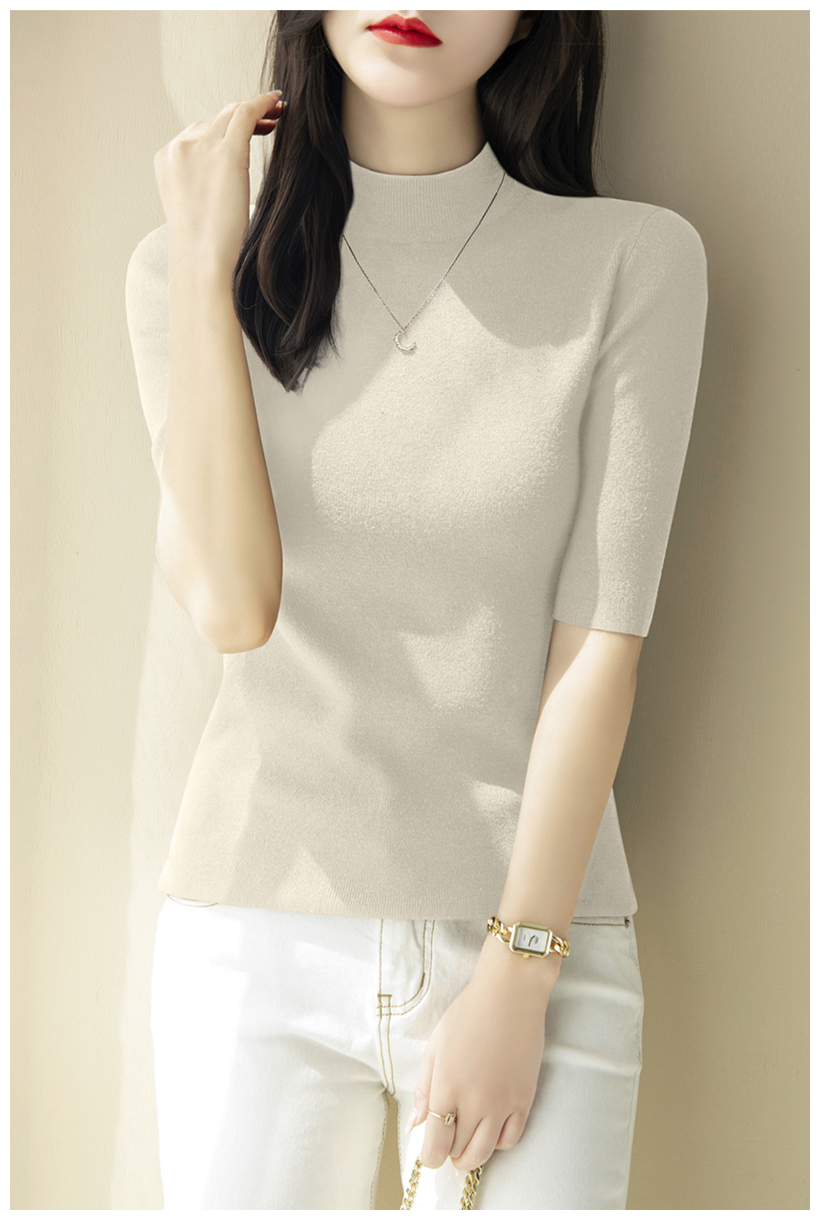 感時尚半高領修身五分袖針織衫女春季新款中袖百搭套頭打底衫