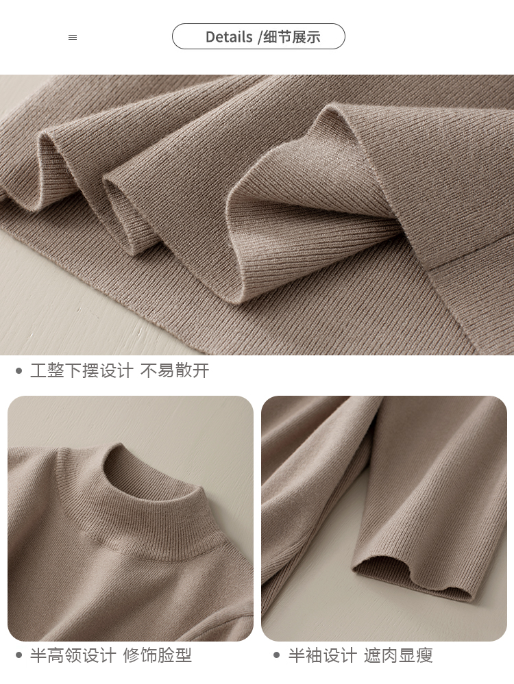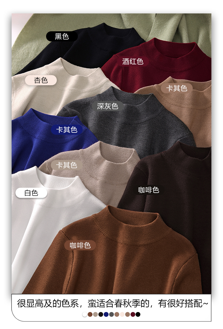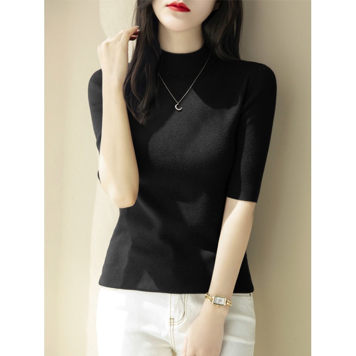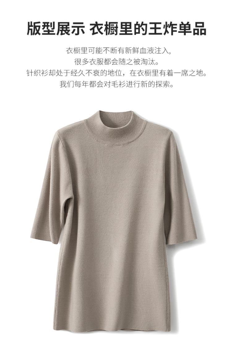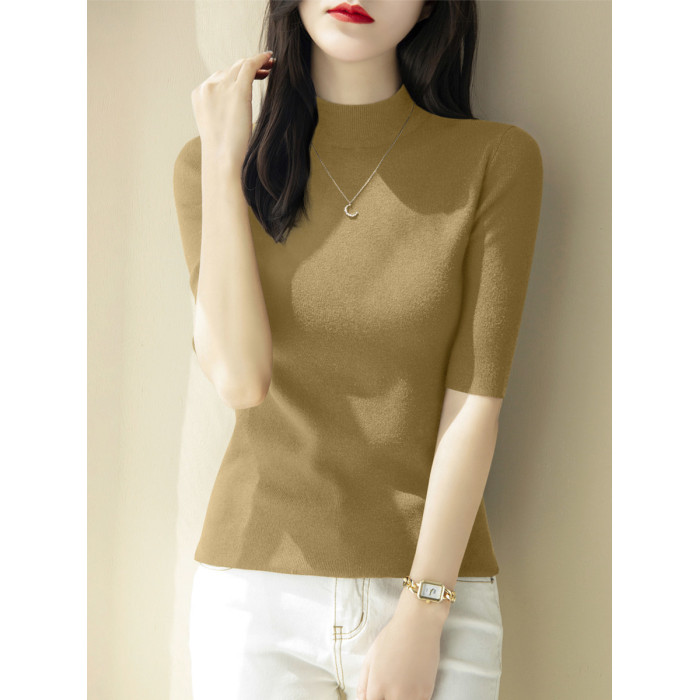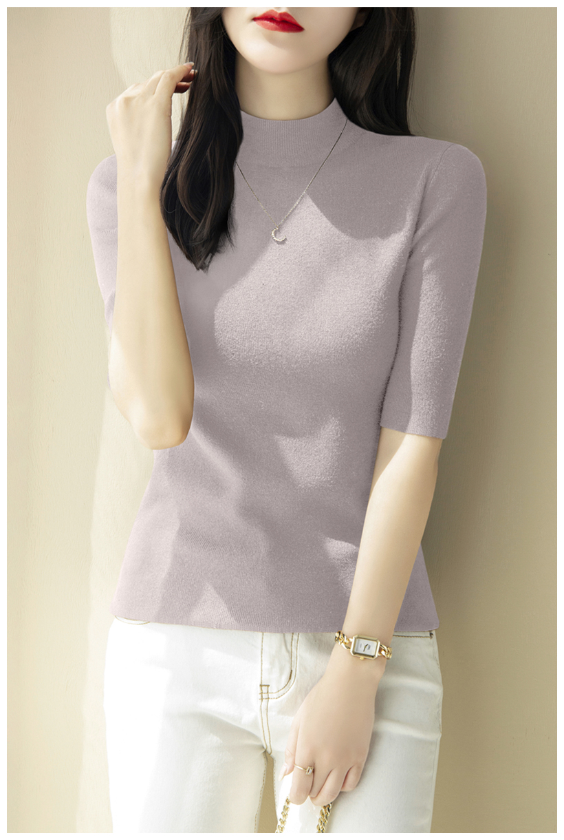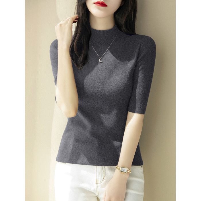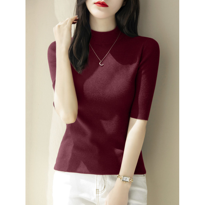 感時尚半高領修身五分袖針織衫女春季新款中袖百搭套頭打底衫