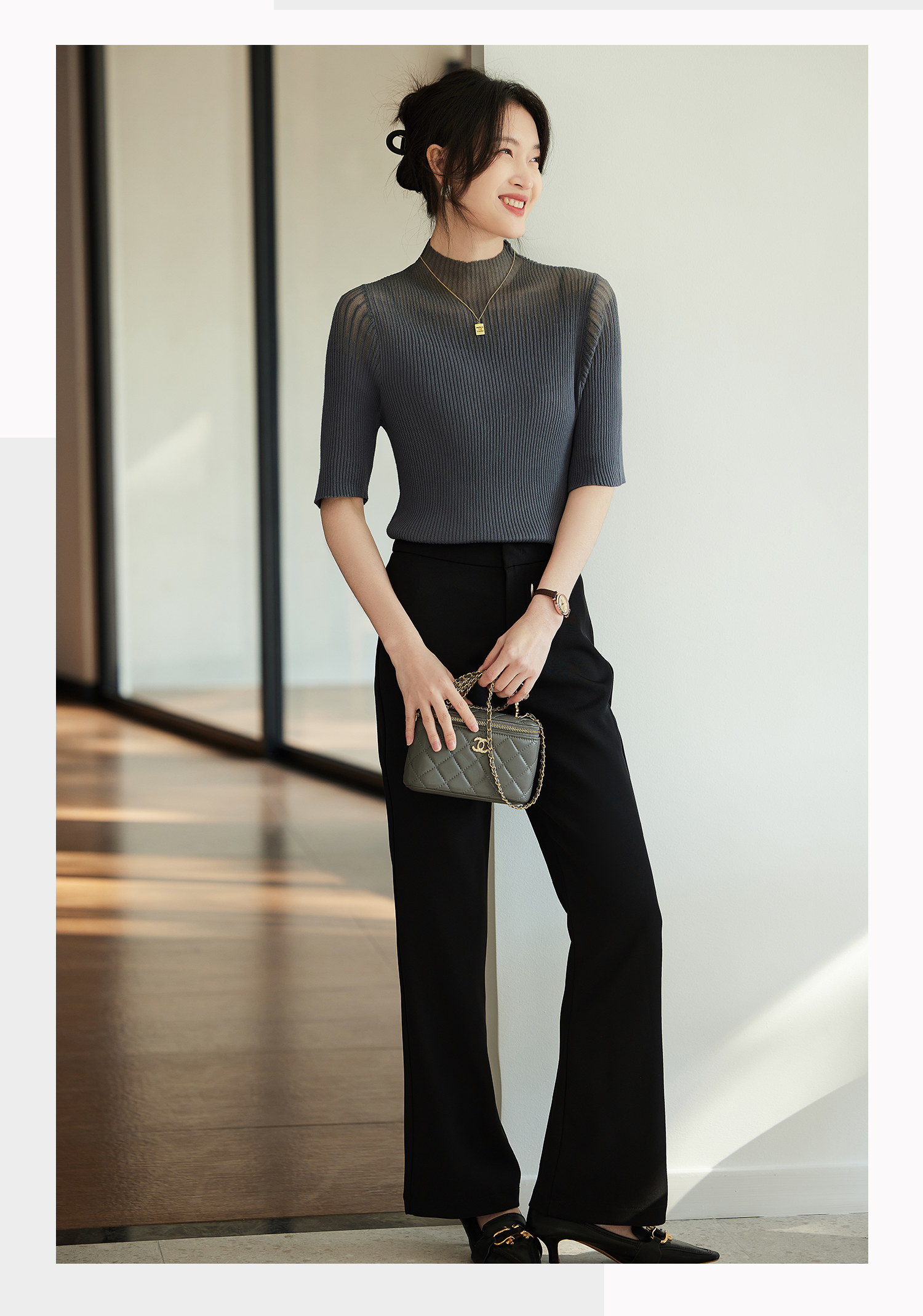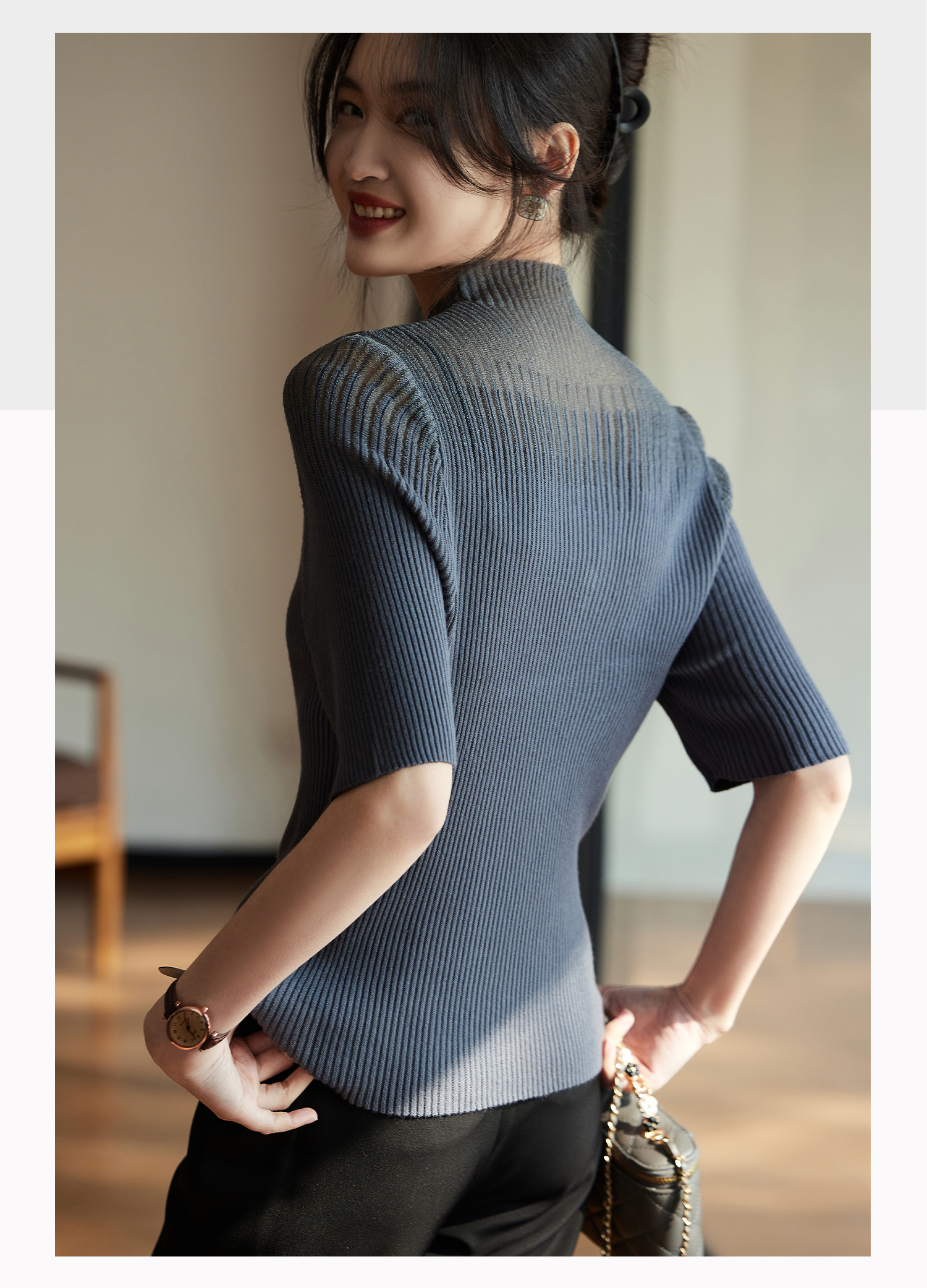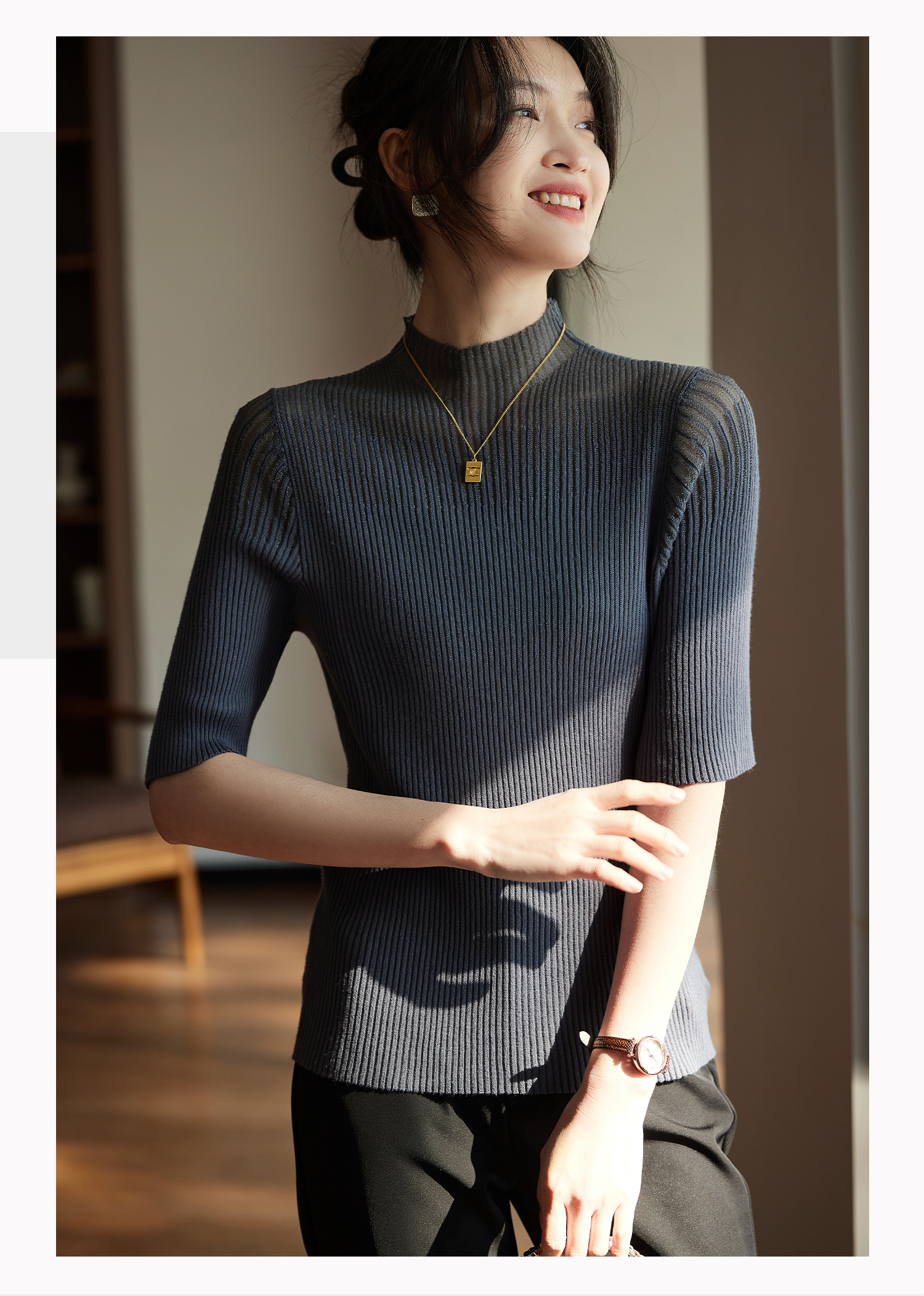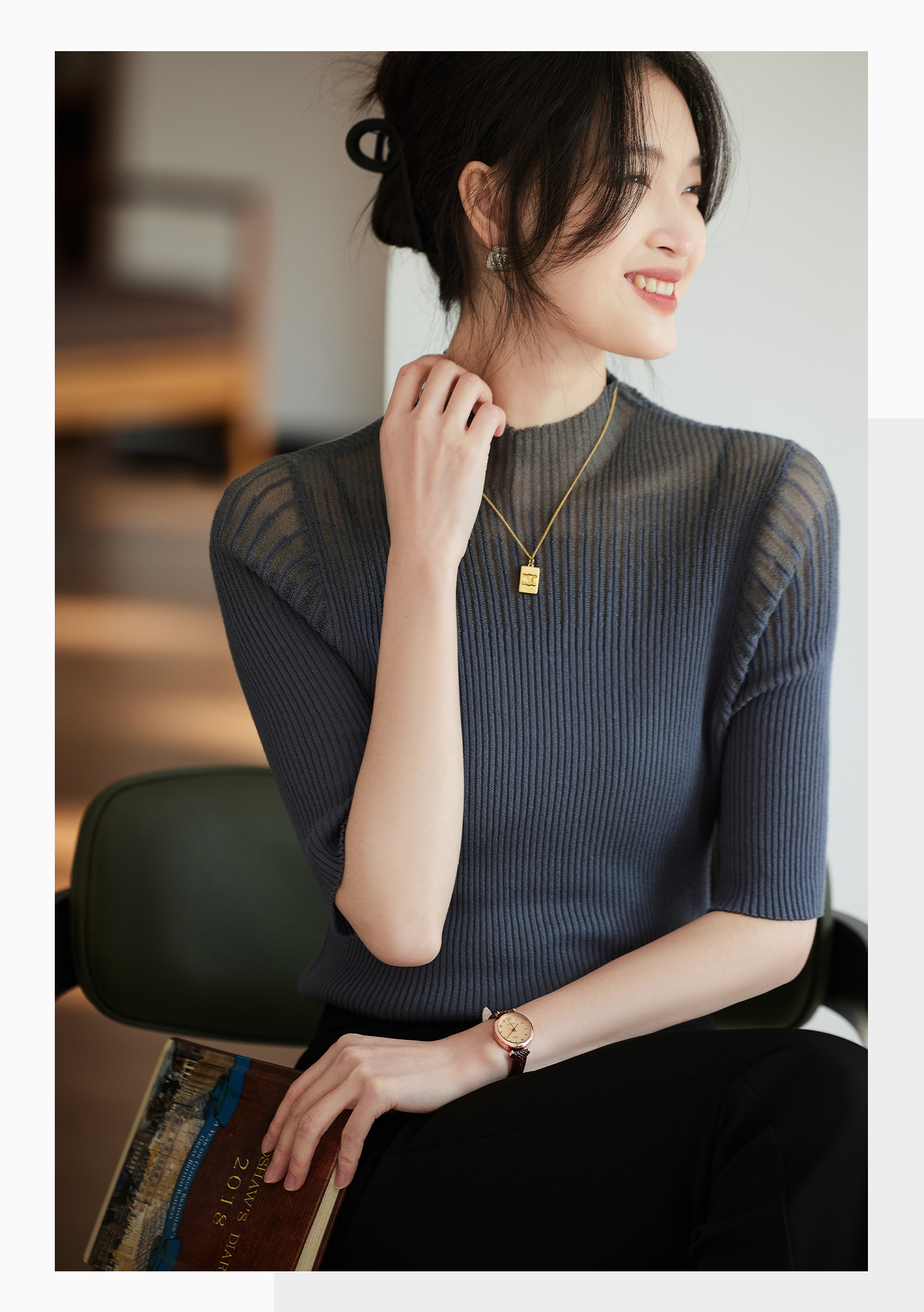 Basic House/百家好法式赫拉半高領網紗五分袖針織打底衫女士夏季