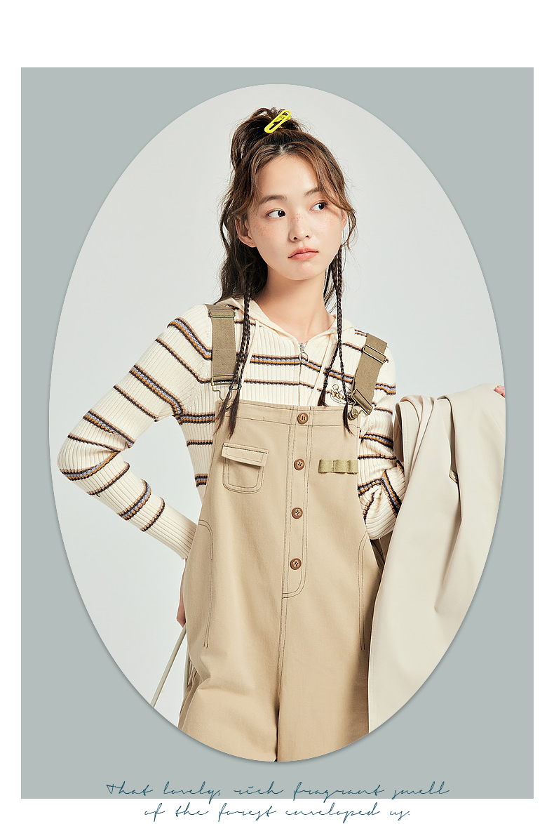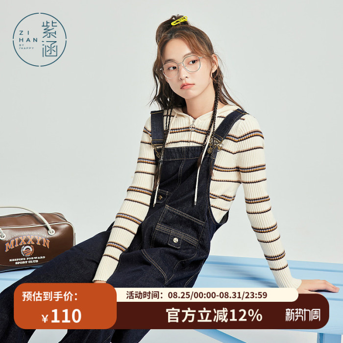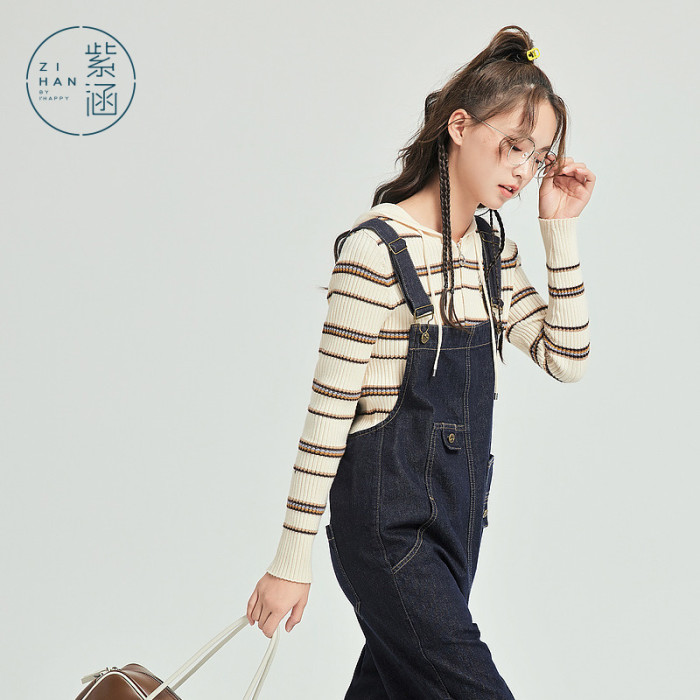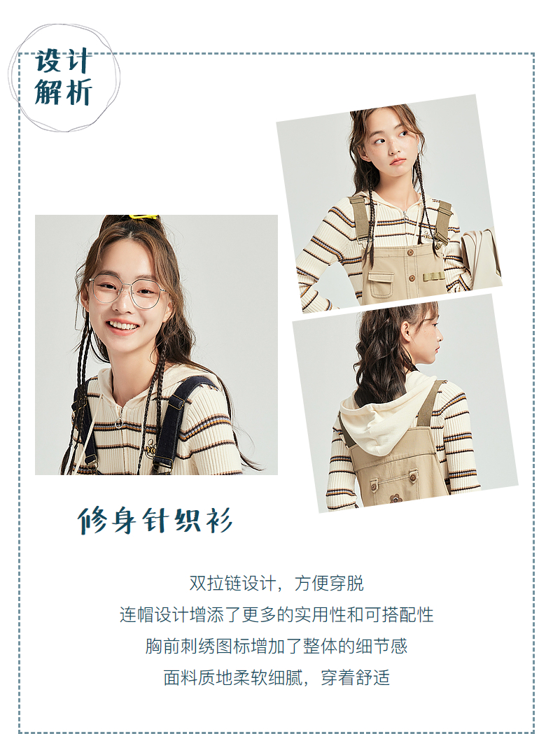 紫涵條紋連帽針織衫女秋季簡約修身雙拉頭拉鍊打底衫舒適休閒百搭